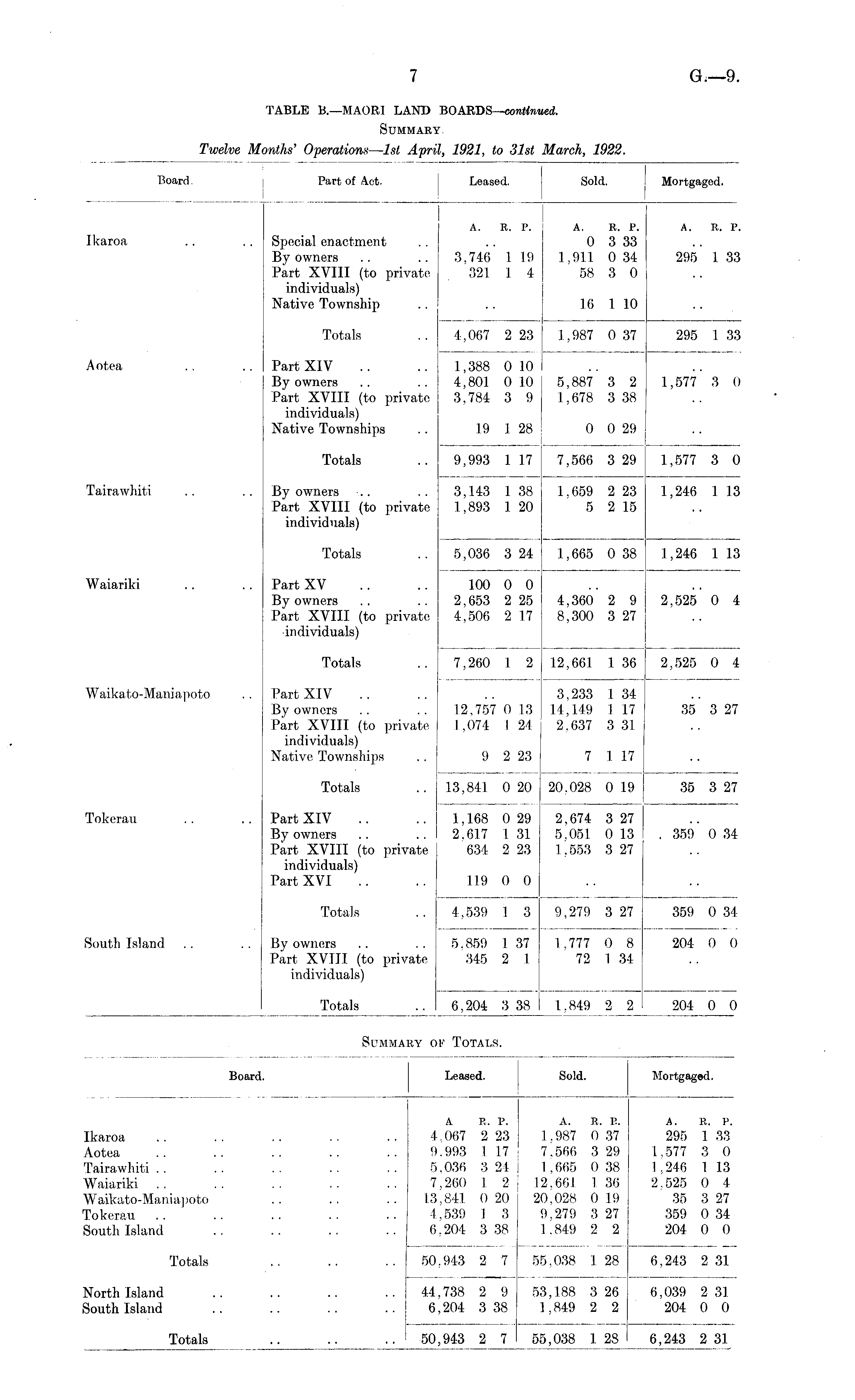 TABLE B.—MAORI LAND BOARDS— continued. Summary Twelve Months' Operations—1st April, 1921, to 31st March, 1922.