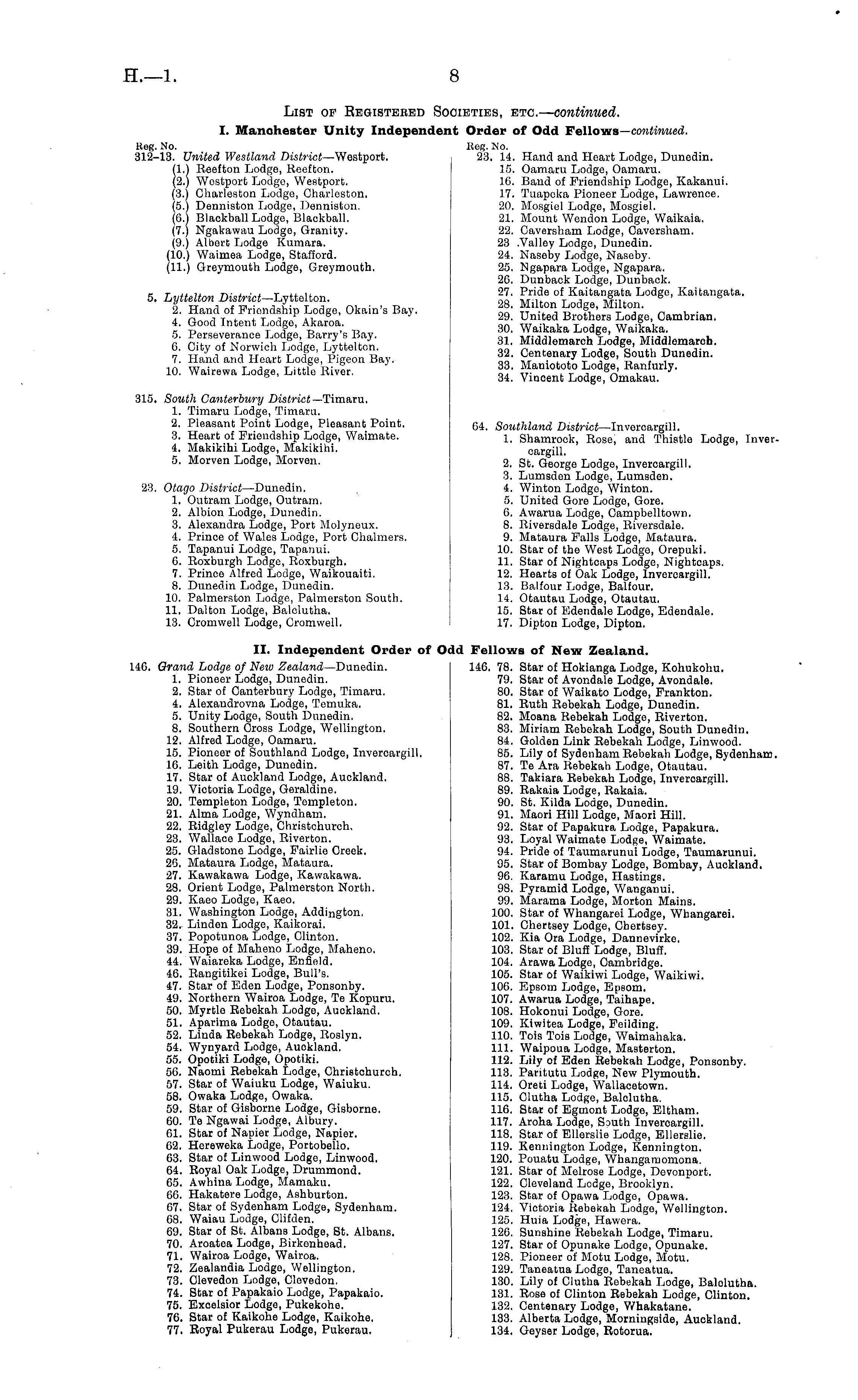 List of Begistered Societies, etc. — continued. I. Manchester Unity Independent Order of Odd Fellows continued. Reg. No. Reg. No. 312-13. United Westland District —Westport. 23. 14. Hand and Heart Lodge, Dunedin. (1.) Reefton Lodgo, Reefton. 15. Oamaru Lodge, Oamaru. (2.) Westport Lodgo, Westport. 16. Band of Friendship Lodge, Kakanui. (3.) Charleston Lodge, Charleston. 17. Tuapoka Pioneer Lodge, Lawrence. (5.) Denniston Lodgo, Denniston. 20. Mosgiel Lodge, Mosgiel. (6.) Blackball Lodge, Blackball. 21. Mount Wendon Lodge, Waikaia. (7.) Ngakawau Lodge, Granity. 22. Caversham Lodge, Caversham. (9.) Albert Lodge Kumara. 23 .Valley Lodgo, Dunedin. (10.) Waimea Lodge, Stafford. 24. Naseby Lodge, Naseby. (11.) Greymouth Lodge, Greymouth. 25. Ngapara Lodge, Ngapara. 26. Dunback Lodgo, Dunback. 5. Lyttelton Birirtd-Lyttelton. £' 5^ e o£ Kaitangata Lodge, Kaitangata. 2. Hand of Friendship Lodge, Okain's Bay. f' ™^° n , \f«f°< M l "' n k • 29. United Brothers Lodge, Cambrian. 4. Good Intent Lodge, Akaroa. „ 0 Waikaka Lodop w „jL ka 5. Perseverance Lodge, Barry's Bay. ™' ul ' v. a r\;i *m ■ i r j tH. u 31. Middlemarch Lodge, Middlemareh. 6. City of Norwich Lodgo, Lyttelton. on „ , T , out-, j- „ tt i j T_r i. t j„ -d-„ tj 32. Centenary Lodge, South Dunedin. 7. Hand and Heart Lodge, Pigeon Hay. „„ ~ i.i.ii t .aJI S t i in ™„;„ t j„» t un. t>:-«, 33. Mamototo Lodge, Ranfurly. 10. Wairewa Lodge, Little River, „. „. , T , ° ' , ' e 34. Vinoent Lodge, Omakau. 315. South Canterbury District— Timaru. 1. Timaru Lodge, Timaru. 2. Pleasant Point Lodge, Pleasant Point. 6 4. Southland District— lnvorcargill. 3. Heart of Fnondship Lodge, Waimate. 1. Shamrock, Rose, and Thistle Lodge, Inver, 4. Makikihi Lodge, Makikihi. cargill. 5. Morven Lodge, Morven. 2. St. Geor'go Lodge, Invercargill. 3. Lumsden Lodge, Lumsden. 23. Otago District —Dunedin. 4. Winton Lodge, Winton. 1. Outram Lodge, Outram. 5. United Gore Lodge, Gore. 2. Albion Lodge, Dunedin. 6. Awarua Lodge, Campbelltown. 3. Alexandra Lodge, Port Molynoux. 8. Riversdale Lodge, Riversdale. 4. Prince of Wales Lodge, Port Chalmers. 9. Mataura Falls Lodge, Mataura. 5. Tapanui Lodge, Tapanui. 10. Star of the West Lodge, Orepuki. 6. Roxburgh Lodge, Roxburgh, 11. Star of Nightcaps Lodge, Nightcaps. 7. Prince Alfred Lodge, Waikouaiti. 12. Hearts of Oak Lodge, Invercargill. 8. Dunedin Lodge, Dunedin. 13. Balfour Lodge, Balfour. 10. Palmerston Lodgo, Palmerston South. 14. Otautau Lodge, Otautau. 11. Dalton Lodge, Balclutha. 15. Star of Edondalo Lodge, Edendale. 13. Cromwell Lodge, Cromwell. 17. Dipton Lodge, Dipton. 11. Independent Order of Odd Fellows of New Zealand. 146. Grand Lodge of Neio Zealand —Dunedin. 146. 78. Star of Hokianga Lodge, Kohukohu. 1. Pioneer Lodge, Dunedin. 79. Star of Avondale Lodge, Avondale. 2. Star of Canterbury Lodge, Timaru. 80. Star of Waikato Lodge, Frankton. 4. Alexandrovna Lodge, Tomuka. 81. Ruth Rebekah Lodge, Dunedin. 5. Unity Lodgo, South Dunedin. 82. Moana Robekah Lodge, Riverton. 8. Southern Gross Lodge, Wellington. 83. Miriam Rebekah Lodge, South Dunedin. 12. Alfred Lodgo, Oamaru. 84. Golden Link Rebekah Lodge, Linwood. 15. Pioneer of Southland Lodge, Invercargill. 85. Lily of Sydenham Rebekah Lodge, Sydenham. 16. Leith Lodge, Dunedin. 87. Te Ara Rebekah Lodge, Otautau. 17. Star of Auckland Lodge, Auckland. 88. Takiara Rebekah Lodge, Inveroargill. 19. Victoria Lodge, Geraldine. 89. Rakaia Lodge, Rakaia. 20. Templeton Lodgo, Tompleton. 90. St. Kilda Lodge, Dunedin. 21. Alma Lodge, Wyndham. 91, Maori Hill Lodge, Maori Hill. 22. Ridgley Lodge, Christchurch, 92. Star of Papakura Lodge, Papakura. 23. Wallace Lodge, Riverton. 93. Loyal Waimate Lodge, Waimate. 25. Gladstone Lodge, Fairlie Creek, 94. Pride of Taumarunui Lodge, Taumarunui. 26. Mataura Lodgo, Mataura. 95. Star of Bombay Lodge, Bombay, Auckland. 27. Kawakawa Lodge, Kawakawa. 96. Karamu Lodge, Hastings. 28. Orient Lodgo, Palmerston North. 98. Pyramid Lodge, Wanganui. 29. Kaeo Lodge, Kaeo. 99. Marama Lodge, Morton Mains. 31. Washington Lodgo, Addington. 100. Star of Whangarei Lodge, Whangarei. 32. Linden Lodge, Kaikorai. 101. Ohertsey Lodgo, Chertsey. 37. Popotunoa Lodge, Clinton. 102. Kia Ora Lodge, Dannevirke. 39. Hope of Maheno Lodgo, Maheno. 103. Star of Bluff Lodge, Bluff. 44. Waiaroka Lodge, Enfield. 104. Arawa Lodge, Cambridge. 46. Rangitikei Lodge, Bull's. 105. Star of Waikiwi Lodge, Waikiwi. 47. Star of Eden Lodge, Ponsonby. 106. Epsom Lodge, Epsom. 49. Northern Wairoa Lodge, Te Kopuru. 107. Awarua Lodge, Taihape. 50. Myrtle Rebekah Lodge, Auckland. 108. Hokonui Lodge, Gore. 51. Aparima Lodge, Otautau. 109. Kiwitea Lodge, Feilding. 52. Linda Rebekah Lodge, Roslyn. 110. Tois Tois Lodge, Waimahaka. 54. Wynyard Lodge, Auokland. 111. Waipoua Lodge, Masterton. 55. Opotiki Lodge, Opotiki. 112. Lily of Eden Rebekah Lodge, Ponsonby. 56. Naomi Rebekah Lodge, Christchurch. 113. Paritutu Lodge, New Plymouth. 57. Star of Waiuku Lodge, Waiuku. 114. Oreti Lodge, Wallaeetown. 58. Owaka Lodge, Owaka. 115. Clutha Lodgo, Balclutha. 59. Star of Gisborne Lodge, Gisborno. 116. Star of Egmont Lodge, Eltham. 60. Te Ngawai Lodge, Albury. 117. Aroha Lodge, South Inveroargill. 61. Star of Napier Lodge, Napier. 118. Star of Ellorslie Lodge, Ellerslie. 62. Hereweka Lodge, Portobello. 119. Kennington Lodge, Kennington. 63. Star of Linwood Lodge, Linwood, 120. Pouatu Lodge, Whangamomona. 64. Royal Oak Lodge, Drummond. 121. Star of Melrose Lodge, Devonport. 65. Awhina Lodge, Mamaku. 122. Cleveland Lodge, Brooklyn. 66. Hakatere Lodge, Ashburton. 123. Star of Opawa Lodge, Opawa. 67. Star of Sydenham Lodge, Sydenham. 124. Viotoria Rebekah Lodge, Wellington. 68. Waiau Lodge, Clifden. 125. Huia Lodge, Hawera. 69. Star of St. Albans Lodge, St. Albans. 126. Sunshine Rebekah Lodge, Timaru. 70. Aroatea Lodge, Birkonhead. 127. Star of Opunake Lodge, Opunake. 71. Wairoa Lodge, Wairoa. 128. Pioneer of Motu Lodge, Motu. 72. Zealandia Lodge, Wellington. 129