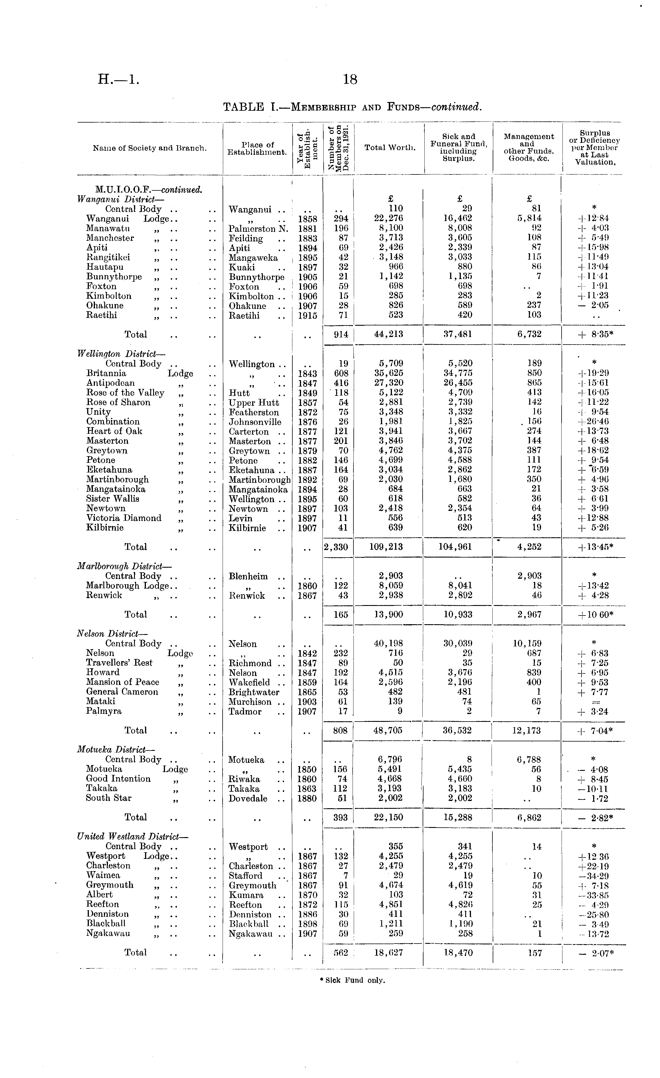 Name of Society and Branch. _ r, o Oct Place of ht; a «S„Establishnient. gH 2 g-g OT H *SQ Sick and Management ,„„,. i \\r ii Funeral Fund, and Total Worth. iucluding other Funds. Surplus. Goods, &c. Surplus or Deficiency per Member at Last Valuation, M.U.I. O. O.V.—continued. Wanganui District — Central Body .. Wanganui Lodge.. Manawatu „ Manchester ,, Apiti ,, Rangitikei ,, Hautapu ,, Bunnythorpe „ Foxton ,, Kimbolton ,, Ohakune ,, Raetihi „ Wanganui .. .. 1858 294 Palmerston N. 1881 196 Feilding .. 1883 87 Apiti .. 1894 69 Mangaweka , 1895 42 Kuaki .. 1897 32 Bunnythorpe , 1905 21 Foxton .. ' 1906 59 Kimbolton .. i 1906 15 Ohakune .. 1907 28 Raetihi .. 1915 71 294 196 87 69 42 32 21 59 15 28 71 £ £ £ 110 29 81 22,276 16,462 5,814 8,100 8,008 92 3,713 3,605 108 2,426 2,339 87 3,148 3,033 115 966 880 86 1,142 1,135 7 698 698 285 283 2 826 589 237 523 420 103 * + 12-84 + 4-03 + 5-49 +15-98 -j 11-49 + 13-04 + 11-41 + 1-91 -| 11-23 - 2-05 Total 914 914 44,213 37,481 6,732 + 8-35* Wellington District — Central Body .. Britannia Lodge Antipodean „ Rose of the Valley ,, Rose of Sharon „ Unity Combination „ Heart of Oak „ Masterton ,, Greytown „ Petone ,, Eketahuna ,, Martinborough ,, Mangatainoka „ Sister Wallis „ Newtown „ Victoria Diamond „ Kilbirnie „ Wellington .. .. 19 IOC) ft Aft .. 1843 608 .. 1847 416 Hutt .. 1849 118 Upper Hutt 1857 54 Featherston 1872 75 .Johnsonville 1876 26 Carterton .. 1877 121 Masterton .. 1877 201 Greytown .. 1879 70 Petono .. 1882 146 Eketahuna .. 1887 164 Martinborough 1892 69 Mangatainoka 1894 28 Wellington .. 1895 60 Newtown .. 1897 103 Levin .. 1897 11 Kilbirnie .. 1907 41 1843 1847 1849 1857 1872 1876 1877 1877 1879 1882 1887 1892 1894 1895 1897 1897 1907 19 008 416 118 54 75 26 121 201 70 146 164 69 28 60 103 11 41 5,709 35,625 27,320 5,122 2,881 3,348 1,981 3,941 3,846 4,762 4,699 3,034 2,030 084 618 2,418 556 639 5,520 34,775 26,455 4,709 2,739 3,332 .1,825 3,667 3,702 4,375 4,588 2,862 1,680 663 582 2,354 513 620 189 850 865 413 142 16 . 156 274 144 387 111 .172 350 21 36 64 43 19 * -j- 19-29 + 15-61 + 16-05 -| 11-22 + 9-54 -| 26-46 + 13-73 + 6-48 + 18-62 + 9-54 + "6-59 + 4-96 + 3-58 + 661 + 3-99 + 12-88 + 5-26 Total .. 2,330 2,330 109,213 104,961 4,252 -| 13-45* Marlborough District — Central Body .. Marlborough Lodge.. Renwick ,, Blenheim .. 1 1 OO I860 1867 J22 43 2,903 8,059 2,938 8,6-41 2,892 2,903 18 46 * + 13-42 + 4-28 .. 1860 122 Renwick .. 1867 43 Total 165 165 13,900 10,933 2,967 + 10 60* Nelson District — Central Body .. Nelson Lodge Travellers' Rest „ Howard ,, Mansion of Peace „ General Cameron „ Mataki „ Palmyra „ Nelson OOO .. 1842 232 Richmond .. 1847 89 Nelson .. 1847 192 Wakefield .. 1859 164 Brightwater 1865 53 Murchison .. 1903 61 Tadmor .. 1907 17 1842 1847 1847 1859 1865 1903 1907 232 89 192 164 53 61 17 40,198 716 50 4,515 2,596 482 139 9 30,039 29 35 3,676 2,196 481 74 2 10,159 687 15 839 400 1 65 7 * -I-- 6-83 + 7-25 + 6-95 + 9-53 + 7-77 -I- 3-24 Total 808 808 48,705 36,532 12,173 + 7-04* Motueka District — Central Body .. Motueka Lodge Good Intention ,, Takaka ,, South Star „ Motueka .. 1850 156 Riwaka .. 1860 74 Takaka .. 1863 112 Dovedale .. 1880 51 1850 1860 1863 1880 156 74 112 51 6,796 5,491 4,668 3,193 2,002 8 5,435 4,060 3,183 2,002 6,788 56 8 10 * . - 4-08 -j- 8-45 -10-11 - 1-72 Total 393 393 22,150 15,288 6,862 - 2-82* United Westland District — Central Body .. Westport Lodge.. Charleston „ .. Waimea „ .. Greymouth ,, Albert „ .. Reefton ,, Denniston „ .. Blackball „ .. Ngakawau „ Westport .. lOU-7 191 .. 1867 132 Charleston .. 1867 27 Stafford .. 1867 7 Greymouth 1867 91 Kumara .. 1870 32 Reefton .. 1872 1-15 Denniston . . 1886 30 Blackball .. 1898 69 Ngakawau .. 1907 59 1867 1867 1867 1867 1870 1872 1886 1898 1907 132 27 7 91 32 115 30 69 59 355 4,255 2,479 29 4,674 103 4,851 411 1,211 259 341 4,255 2,479 19 4,619 72 4,826 411 1,190 258 14 10 55 31 25 * + 12 36 +2219 -34-29 + 7-1S -33-85 - 4-29 -25-80 - 349 13-72 21 1 Total 562 562 : 18,627 1.8,470 157 - 2-07* Sick Fund ouly.