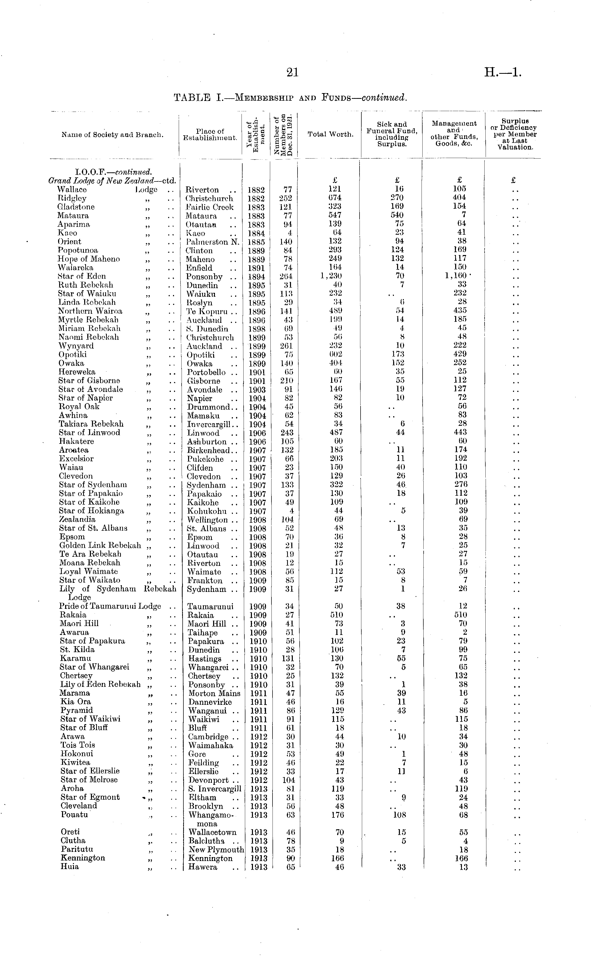 Name of Society and Branch. Place of Establishment. rnJj S3 g O « r rH th & O O-j . in I «Cago Sick and Management Deficiency Total Worth. 1 ' otheXnds, Pert= Surplus. Goods, *o. y%*Ton, l.O.O.F. — continued, hand liodge of New Zealand —ctd. Wallace Lodge Ridgley „ Gladstone. „ Mataura „ Aparima ,, Kaeo ,, Orient „ Popotunoa ,, Hope of Maheno ,, Waiareka ,, Star of Eden ,, Ruth Rebekah „ Star of Wainku ,, Linda Rebekah ,, Northern Wairoa ,, Myrtle Rebekah „ Miriam Rebekah ,, Naomi Rebekah „ Wynyard „ Opotiki „ Owaka ,, Hereweka „ Star of Gisborno ,, Star of Avondalo ,, Star of Napier ,, Royal Oak ,, Awhina ,, Takiara Rebekah ,, Star of Linwood ,, Hakatere „ Aroatea „ Excelsior ,, Waiau „ Clevedon „ Star of Sydenham ,, Star of Papakaio ,, Star of Kaikohe „ Star of Hokianga ,, Zealandia ,, Star of St. Albans ,, Epsom „ Golden Link Rebekah ,, Te Ara Rebekah „ Moana Rebekah ,, Loyal Waimate „ Star of Waikato „ Lily of Sydenham Rebekah Lodge Pride of Taumarunui Lodge . . Rakaia ,, Maori Hill „ Awarua „ Star of Papakura ,, St. Kilda Karamu „ Star of Whangarei „ Chertsey ,, Lily of Eden Rebekah ,, Marama „ Kia Ora „ Pyramid „ Star of Waikiwi „ Star of Bluff Arawa ,, Tois Tois ,, Hokonui „ Kiwi tea „ Star of Ellerslie „ Star of Melrose ,, Aroha ,, Star of Egmont ■> „ Cleveland ,, Pouatu „ Oreti Clutha Paritutu „ Kennington ,, Huia „ Riverton Christchurch Fail-lie Creek Mataura Otautau Kaeo Palmerston N. Clinton Maheno Enfield Ponsonby .. Dunedin Waiuku Roslyn Te Kopuru .. Auckland .. S. Dunedin Christchurch Auckland .. Opotiki Owaka Portobello .. Gisborne Avondale .. Napier Drummond.. Mamaku Invercargill.. Linwood Ashburton .. Birkenhead.. Pukekohe .. Clifden Clevedon Sydenham .. Papakaio .. Kaikohe Kohukohu .. Wellington .. St. Albans .. Epsom Linwood Otautau Riverton Waimate Frankton .. Sydenham .. Taumarunui Rakaia Maori Hill .. Taihape Papakura .. Dunedin Hastings Whangarei .. Chertsey Ponsonby .. Morton Mains Dannevirke Wanganui .. Waikiwi Bluff Cambridge .. Waimahaka Gore Feilding Ellerslie Devonport .. S. Invercargill Eltham Brooklyn Whangamomona Wallaoetown Balelutha .. New Plymouth Kennington Hawera 1882 1882 1883 1883 1883 1884 1885 1889 1889 1891 1894 1.895 1895 1895 1896 1896 1898 1899 1899 1899 1899 1901 1901 1903 1904 1904 1904 1904 1900 1906 1907 1907 1907 1907 1907 1907 1907 1907 1908 1908 1908 1908 1.908 1908 1908 1909 1909 77 252 121 77 94 4 140 84 78 74 264 31 113 29 141 43 69 53 261 75 140 65 210 91 82 45 62 54 243 105 132 66 23 37 133 37 49 4 104 52 70 21 19 12 56 85 31 £ £ £ £ 121 16 105 674 270 404 323 169 154 547 540 7 139 75 64 64 23 41 132 94 38 293 124 169 249 132 117 164 14 150 1,230 70 1,160 40 7 33 232 .. 232 34 6 28 489 54 435 199 14 185 49 4 45 56 8 48 232 10 222 602 173 429 404 152 252 60 35 25 167 55 112 146 19 127 82 10 72 56 .. 56 83 .. 83 34 6 28 487 44 443 60 . . 60 185 11 174 203 11 192 150 40 110 129 26 103 322 46 276 . .. 130 18 112 109 .. 109 44 5 39 69 .. 69 48 13 35 36 8 28 32 7 25 27 .. 27 15 .. 15 112 53 59 15 8 7 27 1 26 £ 105 404 154 7 64 41 38 169 117 150 1,16033 232 28 435 185 45 48 222 429 252 25 112 127 72 56 83 28 443 60 174 192 III) 103 276 112 109 39 69 35 28 25 27 15 59 7 26 £ 1909 1909 1.909 1909 1910 1910 1910 1910 1910 1910 1911 1911 1911 1911 1911 1912 1912 1912 1912 1912 1912 1913 1913 1913 1913 34 27 41 51 56 28 131 32 25 31 47 46 86 91 61 30 31 53 46 33 104 81 31 56 63 50 38 12 510 .. 510 73 3 70 II 9 2 102 23 79 106 7 99 130 55 75 70 5 65 132 .. 132 39 1 38 55 39 16 16 . 11 5 129 43 86 115 .. 115 18 .. 18 44 10 34 30 .. 30 49 1 48 22 7 15 17 11 6 43 .. 43 119 .. 119 33 9 24 48 .. 48 176 108 68 12 510 70 2 79 99 75 65 132 38 16 5 86 115 18 34 30 48 15 6 43 119 24 48 68 1913 1913 1913 1913 1913 46 78 35 90 65 70 15 55 9 5 4 18 .. 18 166 .. 166 46 33 13 55 4 18 166 13