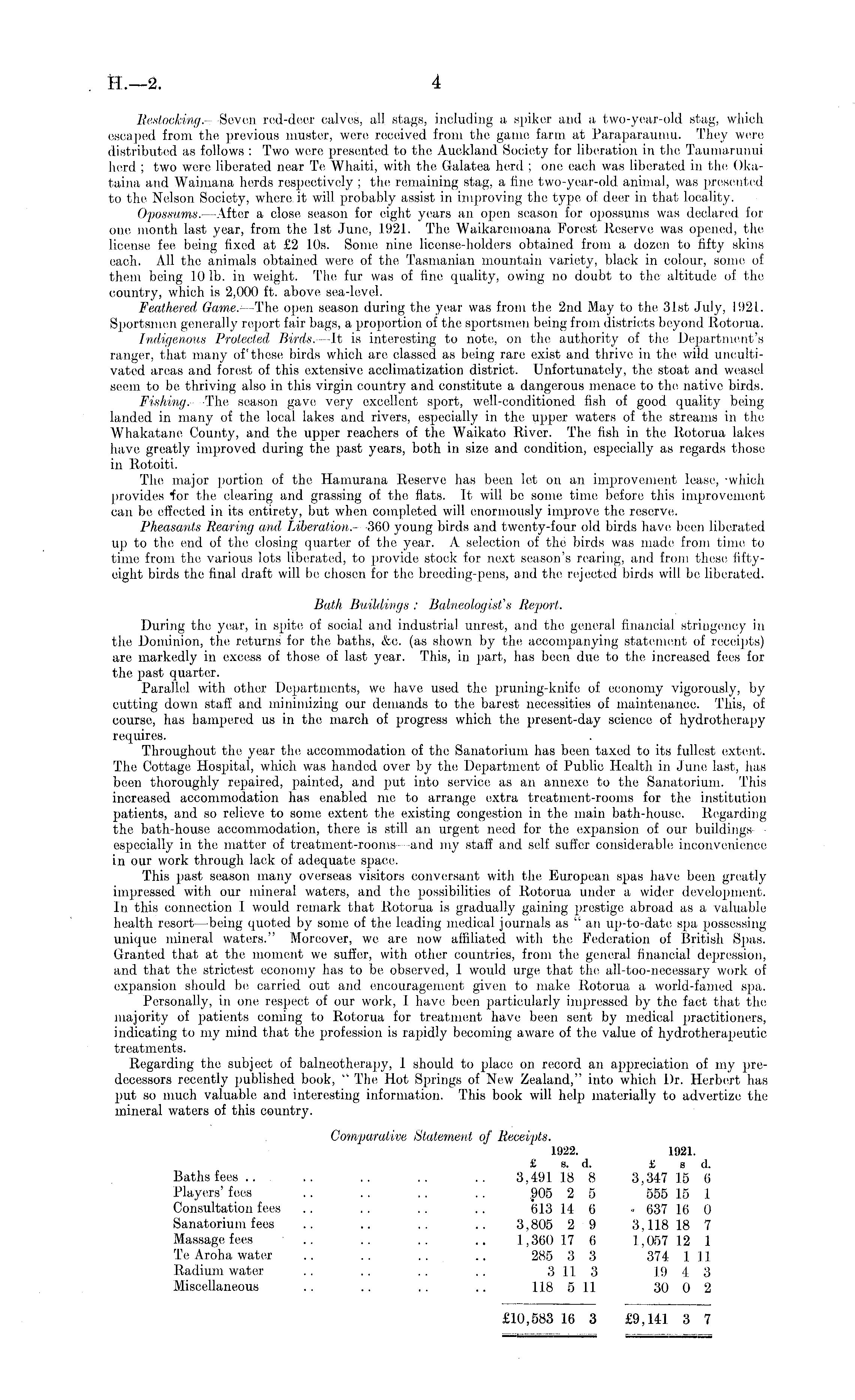 Restocking.- Seven red-deer calves, all stags, including a spiker and a two-year-old. stag, which escaped from the previous muster, were; received from the game farm at Paraparaumu. They were, distributed as follows : Two wore presented to the Auckland Society for liberation in the Taumarunui herd ; two were liberated near Te Whaiti, with the Galatea herd ; one each was liberated in the Okataina and Waimana herds respectively ; the remaining stag, a fine two-year-old animal, was presented to the Nelson Society, where it will probably assist in improving the type of deer in that locality. Opossums. —After a close season for eight years an open season for opossums was declared for one month last year, from the 1st June, 1921. The Waikarcmoana Eorest Reserve was opened, the license fee being fixed at £2 10s. Some nine license-holders obtained from a dozen to fifty skins each. All the animals obtained were of the. Tasmanian mountain variety, black in colour, some of them being 10 lb. in weight. The; fur was of fine quality, owing no doubt to the altitude of tho country, which is 2,000 ft. above sea-level. Feathered Game.- —The open season during the year was from the 2nd May to the 31st July, 1921. Sportsmen generally report fair bags, a proportion of the sportsmen being from districts beyond Rotorua. Indigenous Protected Birds. —It is interesting to note, on the authority of the Department's ranger, that many of'tbese birds which are classed as being rare exist and thrive in the wild uncultivated areas and forest of this extensive acclimatization district. Unfortunately, the stoat and weasel seem to be thriving also in this virgin country and constitute a dangerous menace to the, native birds. Fishing.- The season gave very excellent sport, well-conditioned fish of good quality being landed in many of the local lakes and rivers, especially in the upper waters of the streams in the Whakatane County, and the upper reachers of the Waikato River. The (ish in the Rotorua lakes have greatly improved during the past years, both in size and condition, especially as regards those in Rotoiti. The major portion of the Hamurana Reserve has been let on an improvement lease, -which provides ior the clearing and grassing of the flats. It will be some time before this improvement can be effected in its entirety, but when completed will enormously improve the reserve. Pheasants Rearing and Liberation- -360 young birds and twenty-four old birds have been liberated up to the end of the closing quarter of the year. A selection of the birds was made from time to time from the various lots liberated, to provide stock for next season's rearing, and from these fiftyeight birds the final draft will be chosen for the breeding-pens, and the rejected birds will be liberated. Bath Buildings : Balneologist's Report. During the year, in spite of social and industrial unrest, and the general financial stringency in the Dominion, the returns for the baths, etc. (as shown by the accompanying statement of receipts) are markedly in excess of those of last year. This, in part, has been due to the increased fees for the past quarter. Parallel with other Departments, we have used the pruning-knife of economy vigorously, by cutting down staff and minimizing our demands to the barest necessities of maintenance. This, of course, has hampered us in the march of progress which the present-day science of hydrotherapy requires. Throughout the year the accommodation of tin: Sanatorium has been taxed to its fullest extent. The Cottage Hospital, which was handed over by the Department of Public Health in June last, has been thoroughly repaired, painted, and put into service as an annexe to the Sanatorium. This increased accommodation has enabled me to arrange extra treatment-rooms for the institution patients, and so relieve to some extent the existing congestion in the main bath-house. Regarding the bath-house accommodation, there is still an urgent need for the expansion of our buildings especially in the matter of treatment-rooms and my staff and self suffer considerable inconvenience in our work through lack of adequate space. This past season many overseas visitors conversant with the European spas have been greatly impressed with our mineral waters, and the possibilities of Rotorua under a wider development. In this connection I would remark that Rotorua is gradually gaining prestige abroad as a valuable health resort —being quoted by some of the leading medical journals as " an up-to-date spa possessing unique mineral waters." Moreover, we are now affiliated with the Federation of British Spas. Granted that at the moment we suffer, with other countries, from the general financial depression, and that the strictest economy has to be observed, 1 would urge that the all-too-necessary work of expansion should be carried out and encouragement given to make Rotorua a world-famed spa. Personally, in one respect of our work, I have been particularly impressed by the fact that the majority of patients coming to Rotorua for treatment have been sent by medical practitioners, indicating to my mind that the profession is rapidly becoming aware of the value of hydrotherapeutic treatments. Regarding tho subject of balneotherapy, I should to place on record an appreciation of my predecessors recently published book, " The; Hot Springs of New Zealand," into which Dr. Herbert has put so much valuable and interesting information. This book will help materially to advertize the mineral waters of this country. Comparative Statement of Receipts. 1922. 1921. £ s. d. £ s d. Baths fees .. .. .. .. .. 3,491 18 8 3,347 15 0 Players' fees .. . . .. . . .905 2 5 555 15 1 Consultation fees .. . . . . .. 613 14 0 ■ 637 16 0 Sanatorium fees .. .. .. .. 3,805 2 9 3,118 18 7 Massage fees .. .. .. .. .1,360 17 6 1,057 12 1 Te Aroha water .. . . . . .. 285 3 3 374 1 ] 1 Radium water .. .. .. .. 3 11 3 19 4 3 Miscellaneous .. .. . . .. 118 5 11 30 0 2 £1