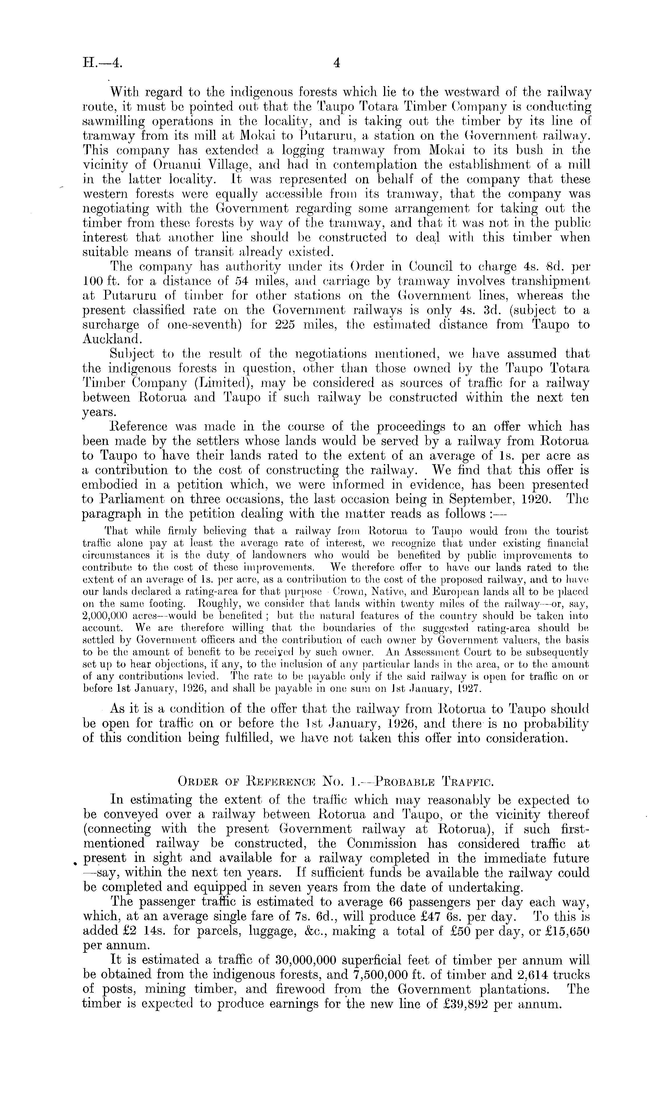 With regard to the indigenous forests which, lie to the westward of the railway route, it must be pointed out that the Taupo Totara Timber Company is conducting sawmilling operations in the locality, and is taking out the timber by its line of tramway from its mill at Mokai to Putaruru, a station on the Government railway. This company has extended a logging tramway from Mokai to its bush in the vicinity of Oruanui Village, and had in contemplation the establishment of a mill in the latter locality. It was represented on behalf of the company that these western forests were equally accessible from its tramway, that the company was negotiating with the Government regarding some arrangement for taking out the timber from these forests by way of the tramway, and that it was not in the public; interest that another line should be constructed to deal with this timber when suitable means of transit already existed. The company has authority under its Order in Council to charge 4s. -Bd. per 100 ft. for a distance of 54 miles, and carriage by tramway involves transhipment at Putaruru of timber for other stations on the Government lines, whereas the present classified rate on the Government railways is only 4s. 3d. (subject to a surcharge of one-seventh) for 225 miles, the estimated distance from Taupo to Auckland. Subject to the result of the negotiations mentioned, we have assumed that the indigenous forests in question, other than those owned by the Taupo Totara Timber Company (Limited), may be considered as sources of traffic for a railway between Rotorua and Taupo if such railway be constructed within the next ten years. Reference was made in the course of the proceedings to an offer which has been made by the settlers whose lands would be served by a railway from Rotorua to Taupo to have their lands rated to the extent of an average of Is. per acre as a contribution to the cost of constructing the railway. We find that this offer is embodied in a petition which, we were informed in evidence, has been presented to Parliament on three occasions, the last occasion being in September, 1920. The paragraph in the petition dealing with the matter reads as follows : — That while firmly believing that a railway from Rotorua to Taupo would from the tourist traffic alone pay at least the average rate of interest, we recognize that under existing financial circumstances it is the duty of landowners who would be benefited by public improvements to contribute to the cost of these improvements. We therefore offer to have our lands rated to the extent of an average of Is. per acre, as a contribution to the cost of the proposed railway, and to have our lands declared a rating-area for that purpose Crown, Native, and European lands all to be placed on the same footing. Roughly, we consider that lands within twenty miles of the railway—or, say, 2,000,000 acres —would be benefited ; but the natural features of the country should be taken into account. We are therefore willing that the boundaries of the suggested rating-area should be settled by Government officers and the contribution of each owner by Government valuers, the basis to be the amount of benefit to be received by such owner. An Assessment Court to be subsequently set up to hear objections, if any, to the inclusion of any particular lands in the area, or to the amount of any contributions levied. The rate to be payable only if the said railway is open for traffic on or before Ist January, 1926, and shall be payable in one sum on Ist January, 1927. As it is a condition of the offer that the railway from Rotorua to Taupo should be open for traffic on or before the Ist January, 1926, and there is no probability of this condition being fulfilled, we have not taken this offer into consideration. Order oe Reference No. 1. —Probable Traffic. In estimating the extent of the traffic which may reasonably be expected to be conveyed over a railway between Rotorua and Taupo, or the vicinity thereof (connecting with the present Government railway at Rotorua), if such firstmentioned railway be constructed, the Commission has considered traffic at present in sight and available for a railway completed in the immediate future —say, within the next ten years. If sufficient funds be available the railway could be completed and equipped in seven years from the date of undertaking. The passenger traffic is estimated to average 66 passengers per day each way, which, at an average single fare of 7s. 6d., will produce £47 6s. per day. To this is added £2 14s. for parcels, luggage, &c, making a total of £50 per day, or £15,650 per annum. It is estimated a traffic of 30,000,000 superficial feet of timber per annum will be obtained from the indigenous forests, and 7,500,000 ft. of timber and 2,614 trucks of posts, mining timber, and firewood from the Government plantations. The timber is expected to produce earnings for the new line of £39,892 per annum.