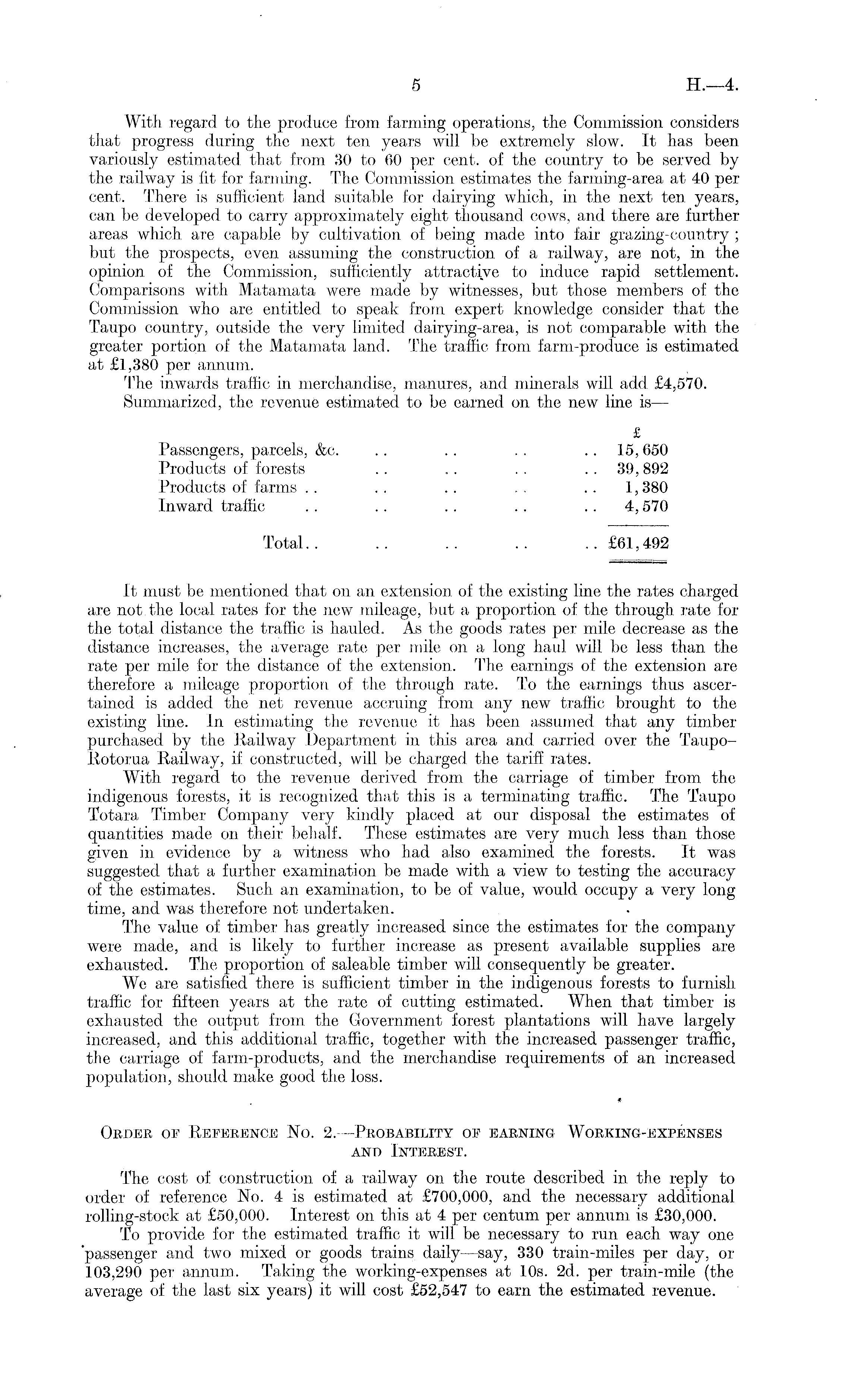 With regard to the produce from farming operations, the Commission considers that progress during the next ten years will be extremely slow. It has been variously estimated that from 30 to 60 per cent, of the country to be served by the railway is fit for farming. The Commission estimates the farming-area at 40 percent. There is sufficient land suitable for dairying which, in the next ten years, can be developed to carry approximately eight thousand cows, and there are furtherareas which are capable by cultivation of being made into fair grazing-country ; but the prospects, even assuming the construction of a railway, are not, in the opinion of the Commission, sufficiently attractive to induce rapid settlement. Comparisons with Matamata were made by witnesses, but those members of the Commission who are entitled to speak from expert knowledge consider that the Taupo country, outside the very limited dairying-area, is not comparable with the greater portion of the Matamata land. The traffic from farm-produce is estimated at £1,380 per annum. The inwards traffic in merchandise, manures, and minerals will add. £4,570. Summarized, the revenue estimated to be earned on the new line is— £ Passengers, parcels, &c. .. .. .. .. 15,650 Products of forests .. .. .. ..39,892 Products of farms . . .. . . . . .. 1,380 Inward traffic . . . . . . . . . . 4,570 Total. . .. .. .. .. £61,492 It must be mentioned that on an extension of the existing line the rates charged are not the local rates for the new mileage, but a proportion of the through rate for the total distance the traffic is hauled. As the goods rates per mile decrease as the distance increases, the average rate per mile on a long haul will be less than the rate per mile for the distance of the extension. The earnings of the extension are therefore a mileage proportion of the through rate. To the earnings thus ascertained is added the net revenue accruing from any new traffic brought to the existing line. In estimating the revenue it has been assumed that any timber purchased by the Railway Department in this area and carried over the TaupoRotorua Railway, if constructed, will be charged the tariff rates. With regard to the revenue derived from the carriage of timber from the indigenous forests, it is recognized that this is a terminating traffic. The Taupo Totara Timber Company very kindly placed at our disposal the estimates of quantities made on their behalf. These estimates are very much less than those given in evidence by a witness who had also examined the forests. It was suggested that a further examination be made with a view to testing the accuracy of the estimates. Such an examination, to be of value, would occupy a very long time, and was therefore not undertaken. The value of timber has greatly increased since the estimates for the company were made, and is likely to further increase as present available supplies are exhausted. The proportion of saleable timber will consequently be greater. We are satisfied there is sufficient timber in the indigenous forests to furnish traffic for fifteen years at the rate of cutting estimated. When that timber is exhausted the output from the Government forest plantations will have largely increased, and this additional traffic, together with the increased passenger traffic, the carriage of farm-products, and the merchandise requirements of an increased population, should make good the loss. * Order of Reference No. 2. —Probability of earning Working-expenses and Interest. The cost of construction of a railway on the route described in the reply to order of reference No. 4 is estimated at £700,000, and the necessary additional rolling-stock at £50,000. Interest on this at 4 per centum per annum is £30,000. To provide for the estimated traffic it will be necessary to run each way one 'passenger and two mixed or goods trains daily—say, 330 train-miles per day, or 103,290 per annum. Taking the working-expenses at 10s. 2d. per train-mile (the average of the last six years) it will cost £52,547 to earn the estimated revenue.