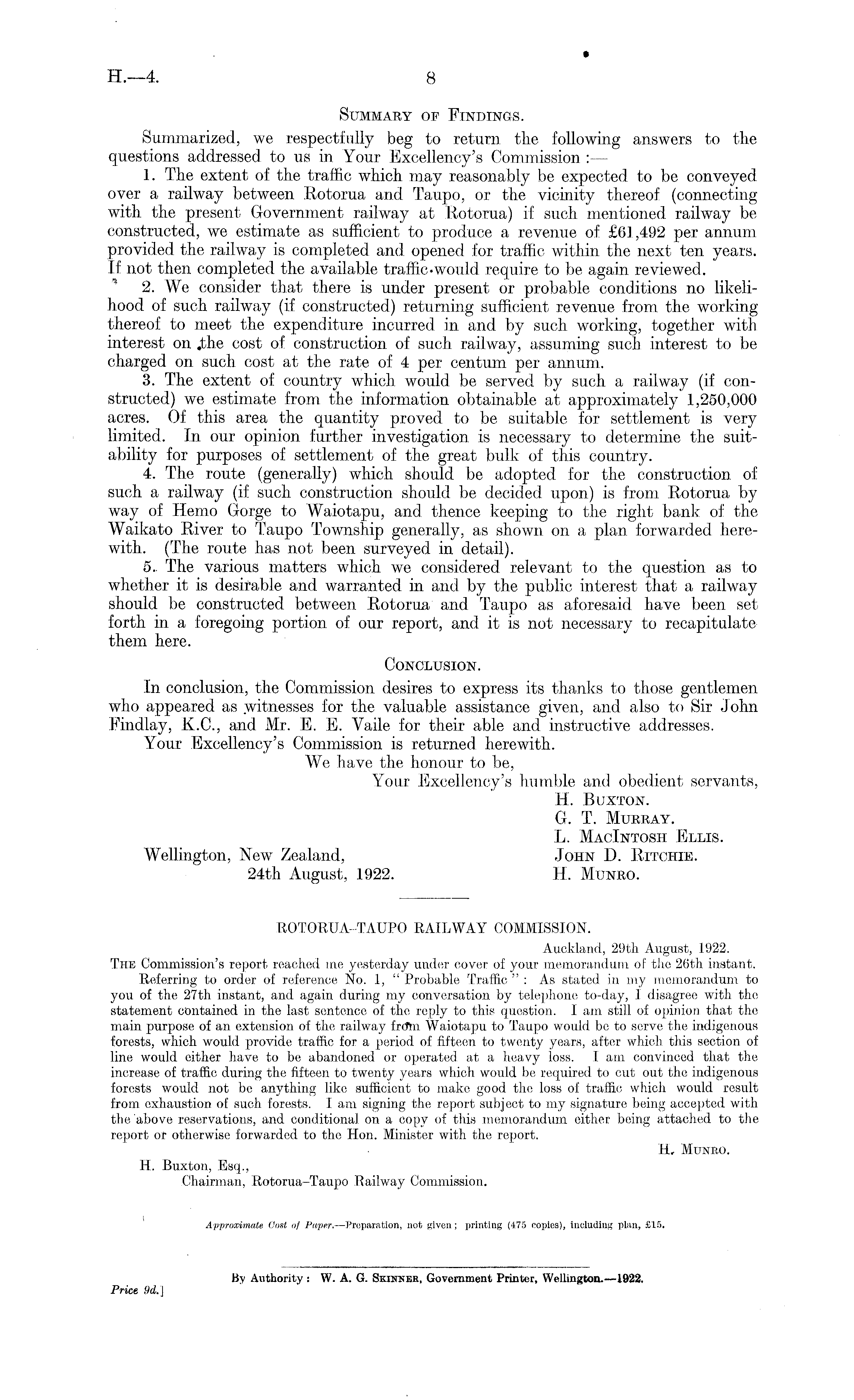 Summary of Findings. Summarized, we respectfully beg to return, the following answers to the questions addressed to us in Your Excellency's Commission :•— 1. The extent of the traffic which may reasonably be expected to be conveyed over a railway between Rotorua and Taupo, or the vicinity thereof (connecting with the present Government railway at Rotorua) if such mentioned railway be constructed, we estimate as sufficient to produce a revenue of £61,492 per annum provided the railway is completed and opened for traffic within the next ten years. If not then completed the available traffic .would require to be again reviewed. 2. We consider that there is under present or probable conditions no likelihood of such railway (if constructed) returning sufficient revenue from the working thereof to meet the expenditure incurred in and by such working, together with interest on .the cost of construction of such railway, assuming such interest to be charged on such cost at the rate of 4 per centum per annum. 3. The extent of country which would be served by such a railway (if constructed) we estimate from the information obtainable at approximately 1,250,000 acres. Of this area the quantity proved to be suitable for settlement is very limited. In our opinion further investigation is necessary to determine the suitability for purposes of settlement of the great bulk of this country. 4. The route (generally) which should be adopted for the construction of such a railway (if such construction should be decided upon) is from Rotorua by way of Hemo Gorge to Waiotapu, and. thence keeping to the right bank of the Waikato River to Taupo Township generally, as shown on a plan forwarded herewith. (The route has not been surveyed in detail). 5. The various matters which we considered relevant to the question as to whether it is desirable and warranted in and by the public interest that a railway should be constructed between Rotorua and Taupo as aforesaid have been set forth in a foregoing portion of our report, and it is not necessary to recapitulate them here. Conclusion. In conclusion, the Commission desires to express its thanks to those gentlemen who appeared as witnesses for the valuable assistance given, and also to Sir John Findlay, K.C., and Mr. E. E. Vaile for their able and instructive addresses. Your Excellency's Commission is returned herewith. We have the honour to be, Your Excellency's humble and obedient servants, H. Buxton. G. T. Murray. L. Maclntosh Ellis. Wellington, New Zealand, John D. Ritchie. 24th August, 1922. H. Munro.