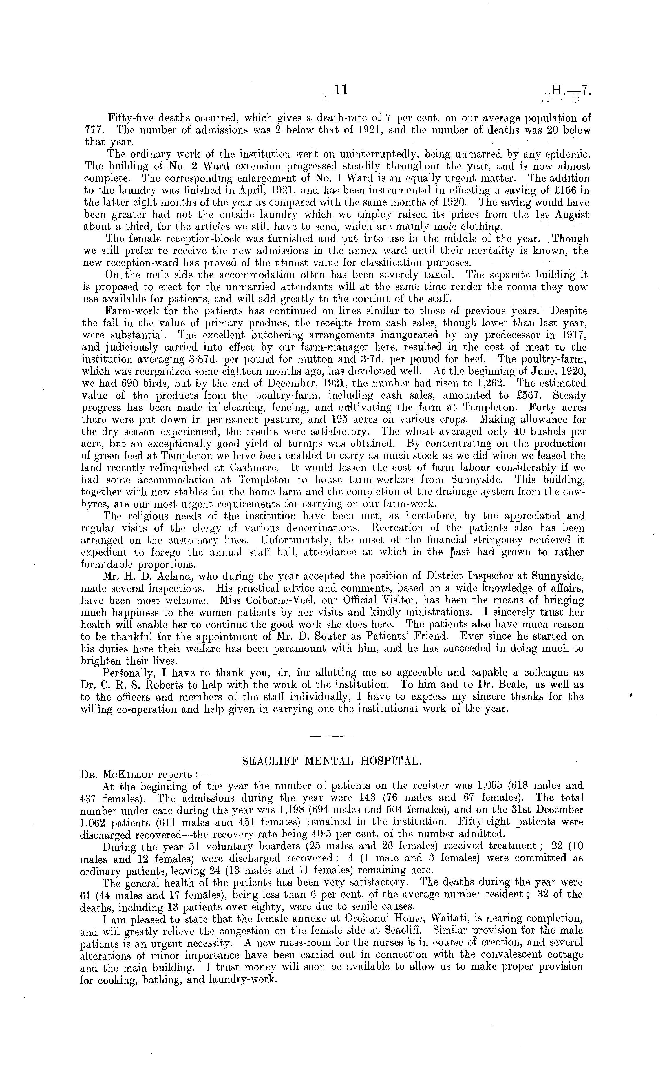Fifty-five deaths occurred, which gives a death-rate of 7 per cent, on our average population of 777. The number of admissions was 2 below that of 1921, and the number of deaths was 20 below that year. The ordinary work of the institution went on uninterruptedly, being unmarred by any epidemic. The building of No. 2 Ward extension progressed steadily throughout the year, and is now almost complete. The corresponding enlargement of No. 1 Ward is an equally urgent matter. The addition to the laundry was finished in April, 1921, and lias been instrumental in effecting a saving of £156 in the latter eight months of the year as compared with the same months of 1920. The saving would have been greater had not the outside laundry which, we employ raised its prices from the Ist August about a third, for the articles we still have to send, which are mainly mole clothing. The female reception-block was furnished and put into use in the middle of the year. Though we still prefer to receive the new admissions in the annex ward until their mentality is known, the new reception-ward has proved of the utmost value for classification purposes. On the male side the accommodation often has been severely taxed. The separate building it is proposed to erect for the unmarried attendants will at the same time render the rooms they now use available for patients, and will add greatly to the comfort of the staff. Farm-work for the patients has continued on lines similar to those of previous years. Despite the fall in the value of primary produce, the receipts from cash sales, though lower than last year, were substantial. The excellent butchering arrangements inaugurated by my predecessor in 1917, and judiciously carried into effect by our farm-manager here, resulted in the cost of meat to the institution averaging 3-87 d. per pound for mutton and 3-7 d. per pound for beef. The poultry-farm, which was reorganized some eighteen months ago, has developed well. At the beginning of June, 1920, we had 690 birds, but by the end of December, 1921, the number had risen to 1,262. The estimated value of the products from the poultry-farm, including cash sales, amounted to £567. Steady progress has been made in cleaning, fencing, and cultivating the farm at Templeton. Forty acres there were put down in permanent pasture, and 195 acres on various crops. Making allowance for the dry season experienced, the results were satisfactory. The wheat averaged only 40 bushels per acre, but an exceptionally good yield of turnips was obtained. By concentrating on the production of green feed at Templeton we have been enabled to carry as much stock as we did when we leased the land recently relinquished at Cashmere. It would lessen the cost of farm labour considerably if we had some accommodation at Temploton to house farm-workers from Sunnyside. This building, together with new stables for the home farm and the completion of the drainage system from the cowbyres, are our most urgent requirements for carrying on our farm-work. The religious needs of the institution have been met, as heretofore, by the appreciated and regular visits of the clergy of various denominations. Recreation of the patients also has beeil arranged on the customary lines. Unfortunately, the onset of the financial stringency rendered, it expedient to forego the annual staff ball, attendance at which in the past had grown to rather formidable proportions. Mr. H. D. Acland, who during the year accepted the position of District Inspector at Sunnyside, made several inspections. His practical advice and comments, based on a wide knowledge of affairs, have been most welcome. Miss Oolborne-Veel, our Official Visitor, has been the means of bringing much happiness to the women patients by her visits and kindly ministrations. I sincerely trust her health will enable her to continue the good work she does here. The patients also have much reason to be thankful for the appointment of Mr. D. Souter as Patients' Friend. Ever since he started on his duties here their welfare has been paramount with him, and he has succeeded in doing much to brighten their lives. Personally, 1 have to thank you, sir, for allotting mo so agreeable and capable, a colleague as Dr. C. R. S. Roberts to help with the work of the institution. To him and to Dr. Beale, as well as to the officers and members of the staff individually, I have to express my sincere thanks for the willing co-operation and help given in carrying out the institutional work of the year. SEACLIFF MENTAL HOSPITAL. Dβ. McKillop reports :— At the beginning of the year the number of patients on the register was 1,055 (618 males and 437 females). The admissions during the year were 143 (76 males and 67 females). The total number under care during the year was 1,198 (694 males and 504 females), and on the 31st December 1,062 patients (611 males and 451 females) remained in the institution. Fifty-eight patients were discharged recovered—the recovery-rate being 405 per cent, of the number admitted. During the year 51 voluntary boarders (25 males and 26 females) received treatment; 22 (10 males and 12 females) were discharged recovered ; 4(1 male and 3 females) were committed as ordinary patients, leaving 24 (13 males and 11 females) remaining here. The general health of the patients has been very satisfactory. The deaths during the year were 61 (44 males and 17 females), being less than 6 per cent, of the average number resident; 32 of the deaths, including 13 patients over eighty, were due to senile causes. I am pleased to state that the female annexe at Orokonui Home, Waitati, is nearing completion, and will greatly relieve the congestion on the female side at Seacliff. Similar provision for the male patients is an urgent necessity. A new mess-room for the nurses is in course of erection, and several alterations of minor importance have been carried out in connection with the convalescent cottage and the main building. I trust m