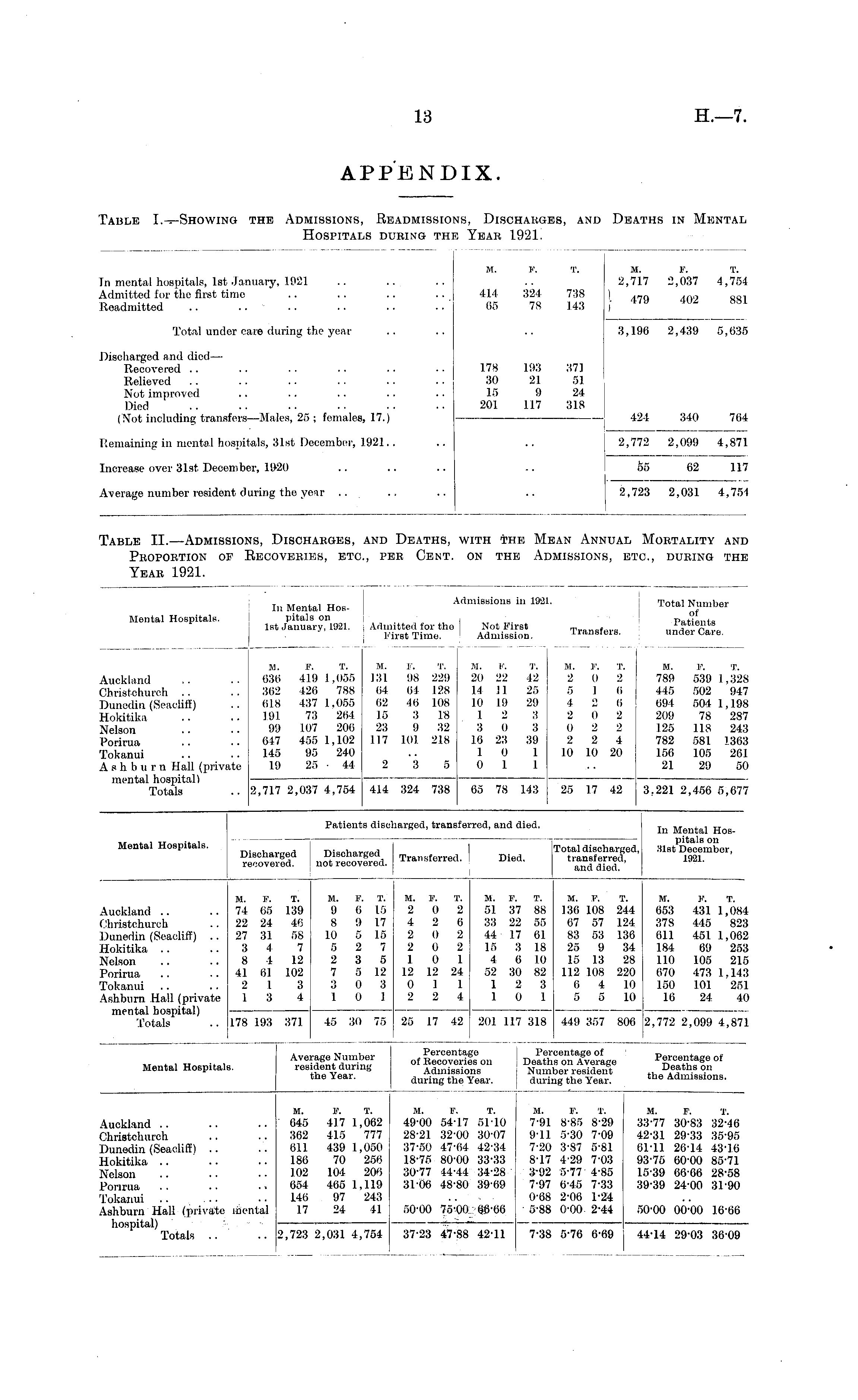 Table II.—Admissions, Discharges, and Deaths, with the Mean Annual Mortality and Proportion of Recoveries, etc., per Cent, on the Admissions, etc., during the Year 1921.
