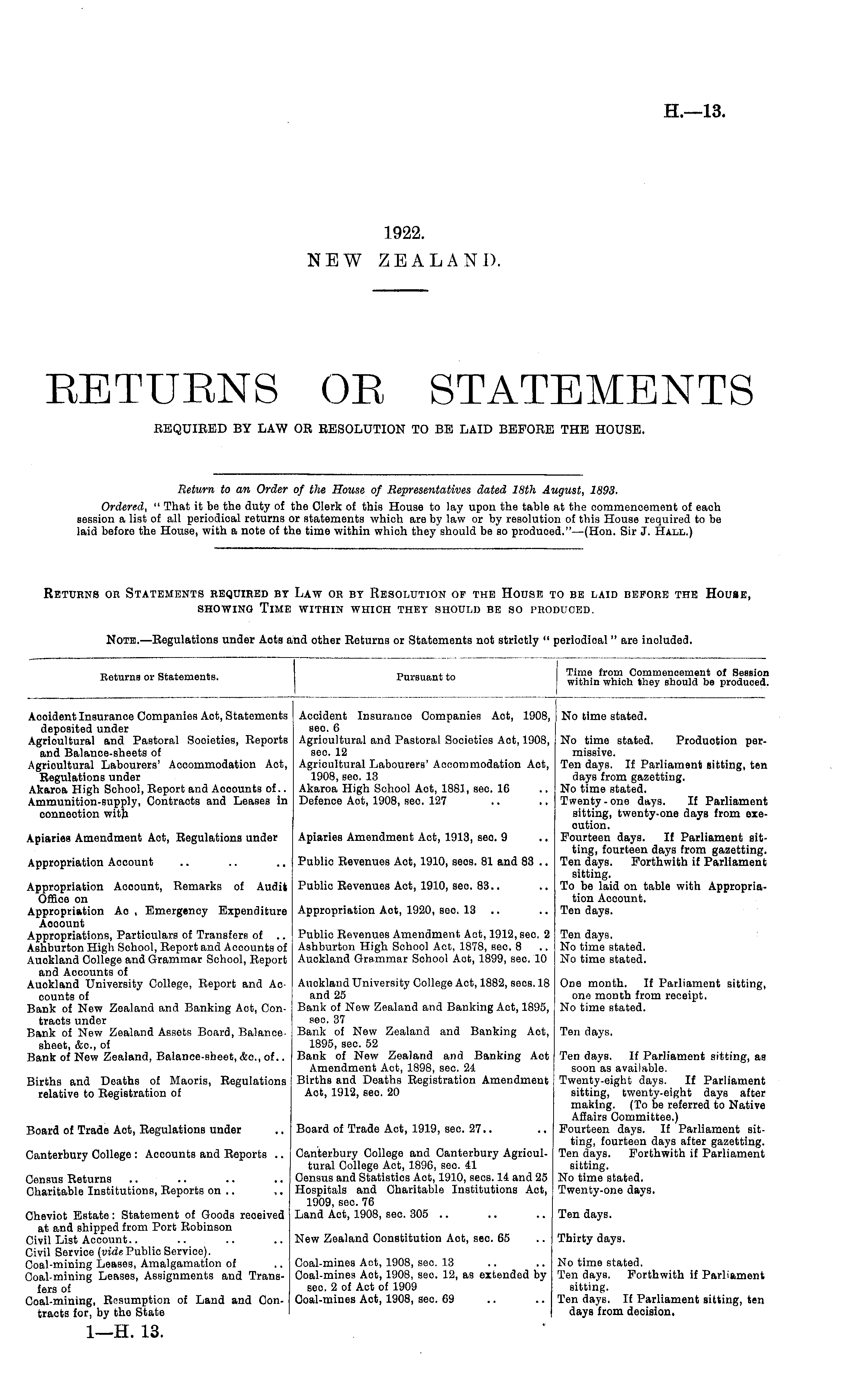 ;OTE. —. iegul lat! Ions uni er is am nd other Returns or Statements not strictly " ly " perioi lioal" are included. Returns or Statements. Pursuant to Time from Commencement of Session within which they should be produced. Aooident Insuranoe Companies Aot, Statements deposited under Agricultural and Pastoral Sooieties, Reports and Balance-sheets of Agricultural Labourers' Accommodation Act, Regulations under Akaroa High School, Report and Accounts of.. Ammunition-supply, Contracts and Leases in oonneotion with Aocident Insuranoe Companies Aot, 1908, seo. 6 Agricultural and Pastoral Societies Aot, 1908, seo. 12 Agricultural Labourers' Accommodation Aot, 1908, seo. 13 Akaroa High School Aot, 1881, seo. 16 Defence Aot, 1908, sec. 127 No time stated. No time stated. Production permissive. Ten days. If Parliament sitting, ten days from gazetting. No time stated. Twenty-one days. If Parliament sitting, twenty-one days from exeoution. Fourteen days. If Parliament sitting, fourteen days from gazetting. Ten days. Forthwith if Parliament sitting. To be laid on table with Appropriation Account. Ten days. Apiaries Amendment Aot, Regulations under Apiaries Amendment Aot, 1913, seo. 9 Appropriation Account Public Revenues Act, 1910, seos. 81 and 83 .. Appropriation Aooount, Remarks of Audit Offioe on Appropriation Ao , Emergency Expenditure Aooount Appropriations, Particulars of Transfers of .. Ashburton High Sohool, Report and Accounts of Auokland College and Grammar School, Report and Aocounts of Auokland University College, Report and Aooounts of Bank of New Zealand and Banking Aot, Contracts under Bank of New Zealand Assets Board, Balancesheet, &c, of Bank of New Zealand, Balance-sheet, &c, of.. Public Revenues Act, 1910, seo. 83.. Appropriation Aot, 1920, seo. 13 Publio Revenues Amendment Aot, 1912, seo, 2 Ashburton High School Act, 1878, seo. 8 Auckland Grammar School Aot, 1899, seo. 10 Ten days. No timo stated. No time stated. Auokland University College Act, 1882, seos. 18 and 25 Bank of New Zealand and Banking Act, 1895, seo. 37 Bank of New Zealand and Banking Aot, 1895, sec. 52 Bank of New Zealand and Banking Aot Amendment Act, 1898, sec. 24 Births and Deaths Registration Amendment Aot, 1912, seo. 20 One month. If Parliament sitting, one month from receipt. No time stated. Ten days. Births and Deaths of Maoris, Regulations relative to Registration of Board of Trade Act, Regulations under Board of Trade Act, 1919, sec. 27.. Ten days. If Parliament sitting, as soon as available. Twenty-eight days. If Parliament sitting, twenty-eight days after making. (To be referred to Native Affairs Committee.) Fourteen days. If Parliament sitting, fourteen days after gazetting. Ten days. Forthwith if Parliament sitting. No time stated. Twenty-one days. Canterbury College : Accounts and Reports .. Census Returns Charitable Institutions, Reports on .. Canterbury College and Canterbury Agricultural College Aot, 1896, sec. 41 Census and Statistics Aot, 1910, sees. 14 and 25 Hospitals and Charitable Institutions Aot, 1909, sec. 76 Land Act, 1908, sec. 305 .. Cheviot Estate: Statement of Goods reoeived at and shipped from Port Robinson Civil List Account.. Civil Service (widePublic Servioe). Coal-mining Leases, Amalgamation of Coal-mining Leases, Assignments and Transfers of Coal-mining, Resumption of Land and Contracts for, by the State Ten days. New Zealand Constitution Aot, sec. 65 Thirty days. Coal-mines Act, 1908, seo. 13 Coal-mines Aot, 1908, see. 12, as extendod by seo. 2 of Act of 1909 Coal-mines Act, 1908, sec. 69 No time stated. Ten days. Forthwith if Parliament sitting. Ten days. If Parliament sitting, ten days from decision.