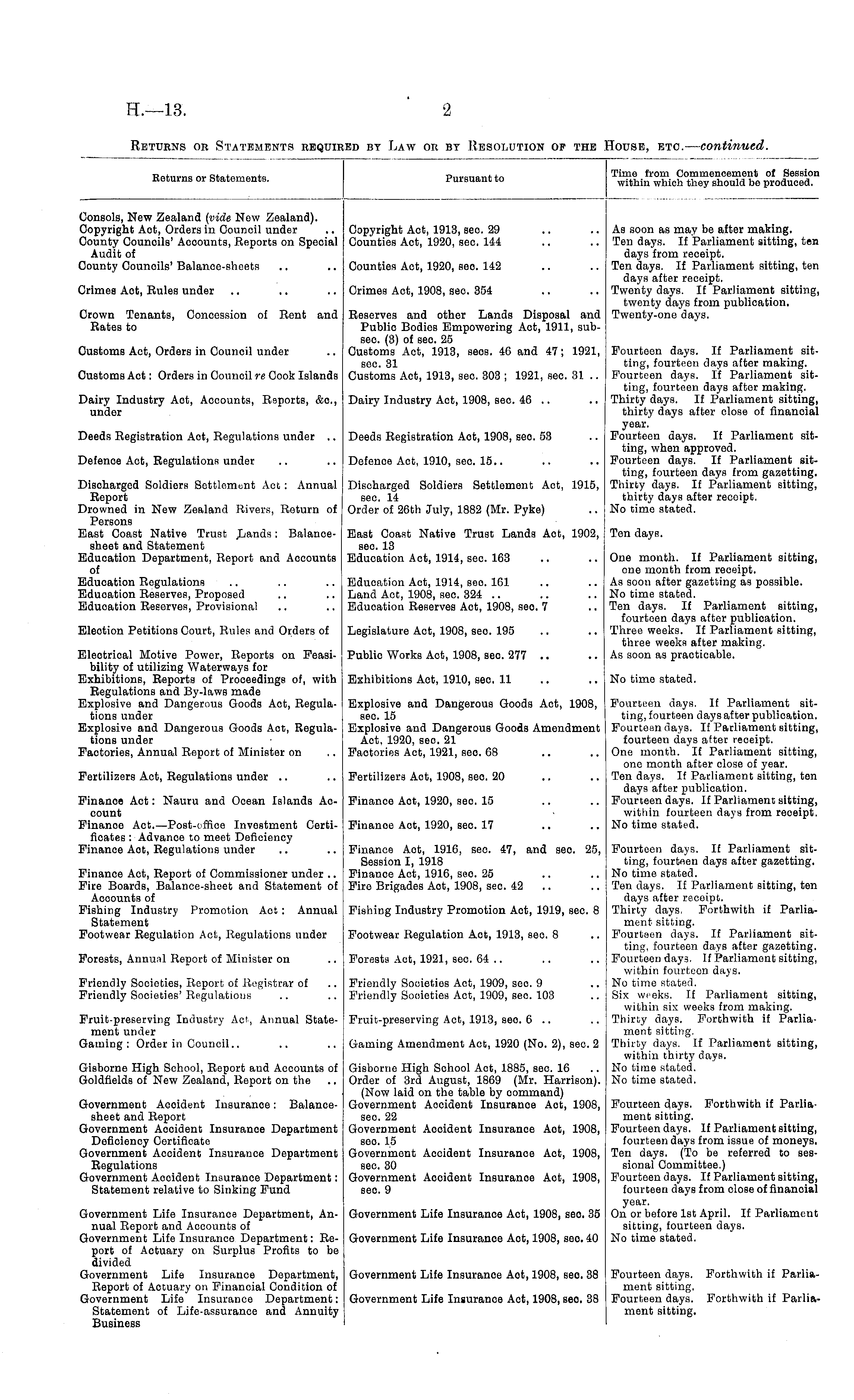 Returns or Statements. Pursuant to Time from Commencement of Session within which they should be produced. Consols, New Zealand (vide Now Zealand). Copyright Aot, Orders in Council under County Councils' Accounts, Reports on Spocial Audit of County Counoils'Balanco-sheets Copyright Act, 1913, sec. 29 Counties Aot, 1920, seo. 144 As soon as may be after making. Ten days. If Parliament sitting, ten days from receipt. Ten days. If Parliament sitting, ten days after receipt. Twenty days. If Parliament sitting, twenty days from publication. Twenty-one days. Counties Act, 1920, seo. 142 Crimes Aot, Rules under Crimes Act, 1908, sec. 354 Crown Tenants, Concession of Ront and Rates to Customs Act, Orders in Council under Reserves and other Lands Disposal and Publio Bodies Empowering Act, 1911, subsec. (3) of seo. 25 Customs Act, 1913, sees. 46 and 47; 1921, soc. 31 Customs Act, 1913, sec. 303 ; 1921, sec. 31 .. Fourteen days. If Parliament sitting, fourteen days after making. Fourteen days. If Parliament sitting, fourteen days after making. Thirty days. If Parliament sitting, thirty days after close of financial year. Fourteen days. If Parliament sitting, when approved. Fourteen days. If Parliament sitting, fourtoen days from gazetting. Thirty days. If Parliament sitting, thirty days after receipt. No time stated. Customs Act: Orders in Council re Cook IslandB Dairy Industry Act, Accounts, Reports, &c, under Dairy Industry Act, 1908, seo. 46 .. Deeds Registration Aot, Regulations under .. Deeds Registration Act, 1908, seo. 53 Defence Act, Regulations under Defence Act, 1910, sec. 15.. Discharged Soldiers Settlement Act : Annual Report Drowned in New Zealand Rivers, Return of Persons East Coast Native Trust Lands: Balancesheet and Statement Education Department, Report and Aocounts of Eduoation Regulations Education Reserves, Proposed Education Reserves, Provisional Discharged Soldiers Settlement Aot, 1915, sec. 14 Ordor of 26th July, 1882 (Mr. Pyke) East Coast Native Trust Lands Aot, 1902, seo. 13 Eduoation Aot, 1914, sec. 163 Ton days. Education Act, 1914, see. 161 Land Act, 1908, sec. 324 .. Eduoation Reserves Act, 1908, seo. 7 One month. If Parliament sitting, one month from receipt. As soon after gazetting as possible. No time stated. Ton days. If Parliament sitting, fourtoen days aftor publication. Three weeks. If Parliament sitting, three weeks after making. As soon as practicable. Election Petitions Court, Rules and Orders of Legislature Act, 1908, seo. 195 Electrical Motive Power, Reports on Feasibility of utilizing Watorways for Exhibitions, Reports of Proceedings of, with Regulations and By-laws made Explosive and Dangerous Goods Act, Regulations under Explosive and Dangerous Goods Aot, Regulations under Factories, Annual Report of Minister on Publio Works Act, 1908, seo. 277 .. Exhibitions Aot, 1910, seo. 11 No time stated. Explosive and Dangerous Goods Act, 1908, seo. 15 Explosive and Dangerous Goods Amendment Act, 1920, seo. 21 Factories Act, 1921, seo. 68 Fourteen days. If Parliament sitting, fourteen days after publication. Fourtoen days. If Parliament sitting, fourteen days after receipt. One month. If Parliament sitting, one month after close of year. Ten days. If Parliament sitting, ten days after publication. Fourteen days. If Parliament sitting, within fourtoen days from receipt. No time stated. Fertilizers Aot, Regulations undor Fertilizers Act, 1908, seo. 20 Finance Act: Nauru and Ocean Islands Aocount Finance Aot.—Post-office Investment Certificates : Advance to meet Deficiency Finance Act, Regulations under Finance Act, 1920, sec. 15 Finance Act, 1920, sec. 17 Finance Act, Report of Commissioner under .. Fire Boards, Balance-sheet and Statement of Accounts of Fishing Industry Promotion Act : Annual Statement Footwear Regulation Act, Regulations under Finance Act, 1916, seo. 47, and seo. 25, Session I, 1918 Finance Act, 1916, seo. 25 Fire Brigades Aot, 1908, sec. 42 Fourtoen days. If Parliament sitting, fourteen days after gazetting. No time stated. Ten days. If Parliament sitting, ten days after receipt. Thirty days, Forthwith if Parliament sitting. Fourteen days. If Parliament sitting, fourteen days after gazetting. Fourteen days. If Parliament sitting, within fourteen days. No time stated. Six weeks. If Parliament sitting, within six weeks from making. Thirty days. Forthwith if Parliament sitting. Thirty days. If Parliament sitting, within thirty days. No time stated. No time stated. Fishing Industry Promotion Aot, 1919, sec. 8 Footwear Regulation Aot, 1913, seo. 8 Forests, Annual Report of Minister on Forests Aot, 1921, sec. 64 .. Friendly Societies, Report of Registrar of Friendly Societies' Regulations Friendly Societies Act, 1909, seo. 9 Friendly Societies Act, 1909, seo. 103 Fruit-preserving Industry Act, Annual Statement under Gaming: Order in Council.. Fruit-preserving Act, 1913, seo. 6 .. Gaming Amendment Aot, 1920 (No. 2), sec. 2 Gisborne High School, Report and Aocounts of Goldfields of New Zealand, Report on the Government Aooident Insurance: Balancesheet and Report Government Aocident Insurance Department Deficiency Certificate Government Accident Insurance Department Regulations Government Aooident Insurance Department: Statement relative to Sinking Fund Gisborne High School Aot, 1885, sec. 16 Ordor of 3rd August, 1869 (Mr. Harrison). (Now laid on the table by command) Govornment Aooident Insuranoe Act, 1908, sec. 22 Government Aooident Insurance Act, 1908, seo. 15 Government Aocident Insurance Act, 1908, sec. 30 Government Aocident Insurance Aot, 1908, sec. 9 Fourteen days. Forthwith if Parliament sitting. Fourteen days. If Parliament sitting, fourteen days from issue of moneys. Ten days. (To be referred to sessional Committee.) Fourtoen days. If Parliament sitting, fourteen days from close of finanoial year. On or beforo 1st April. If Parliament sitting, fourteen days. No time stated. Government Life Insurance Department, Annual Report and Accounts of G
