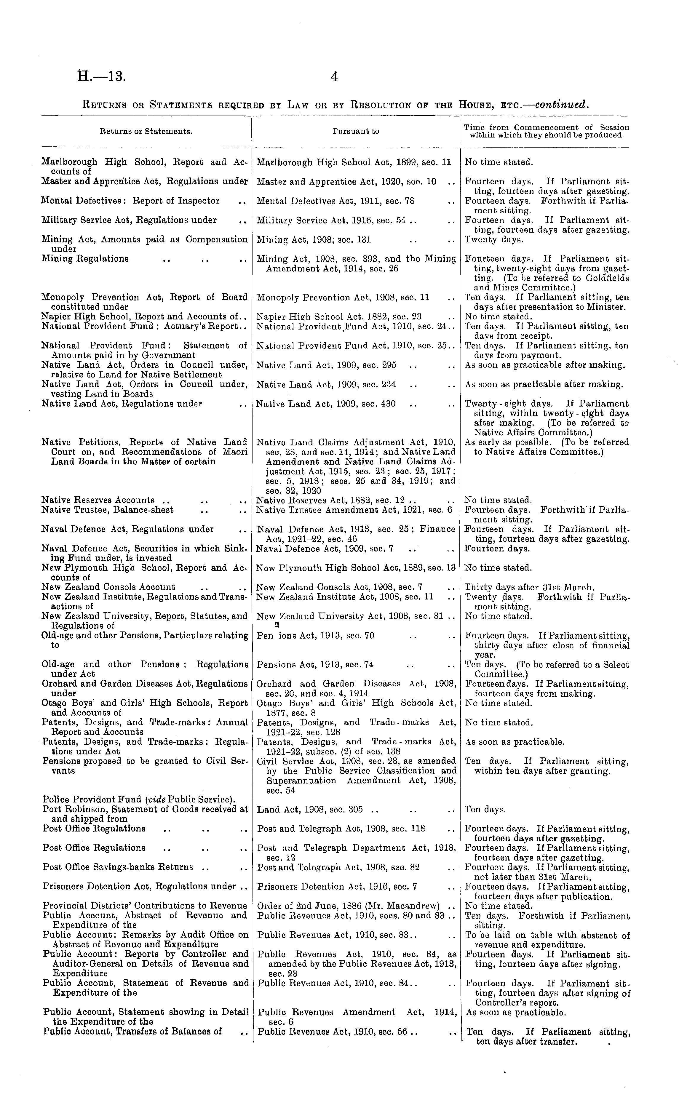 Roturns or Statements. Pursuant to Time from Commencement of Session within which they should be produced. Marlborough High School, Report and Aocounts of Master and Apprentice Act, Regulations under Marlborough High School Aot, 1899, seo. 11 No timo stated. Montal Dofeotives : Report of Inspoctor Master and Apprentice Act, 1920, sec. 10 Mental Defectives Act, 1911, sec. 78 Fourteen days. If Parliament Bitting, fourtoen days after gazetting. Fourteen days. Forthwith if Parliament sitting. Fourteen days. If Parliament sitting, fourteen days aftor gazetting. Twenty days. Military Servioe Aot, Regulations under Military Service Act, 1910, sec. 54 .. Mining Act, Amounts paid as Compensation under Mining Regulations Mining Act, 1908, sec. 131 Mining Act, 1908, see. 393, and the Mining Amendment Act, 1914, sec. 26 Fourteen days. If Parliamont sitting, twenty-eight days from gazetting. (To be referred to Goldfields and Mines Committee.) Ten days. If Parliament sitting, ten days after presentation to Minister. No time stated. Ten days. If Parliament sitting, ten days from receipt. Ten days. If Parliament sitting, ton days from payment. As soon as practicable after making. Monopoly Prevention Act, Report of Board constituted under Napier High School, Report and Aocounts of.. National Provident Fund : Actuary's Report.. Monopoly Prevention Act, 1908, sec. 11 Napier High School Aot, 1882, see. 23 National Provident Fund Aot, 1910, seo. 24.. National Provident Fund : Statement of Amounts paid in by Government Native Land Act, Orders in Council under, relative to Land for Native Settlement Native Land Act, Orders in Council under, vesting Land in Boards Native Land Aot, Regulations under National Provident Fund Act, 1910, sec. 25.. Native Land Act, 1909, sec. 295 Native Land Act, 1909, sec. 234 .. As soon as practicable after making. Native Land Act, 1909, sec. 430 .. Twenty - eight days. If Parliament sitting, within twenty - eight days after making. (To be referred to Nativo Affairs Committee.) As early as possible. (To be referred to Native Affairs Committee.) Native Petitions, Reports of Native Land Court on, and Recommendations of Maori Land Boards in the Matter of oertain Native Land Claims Adjustment Aot, 1910, seo. 28, and sec. 14, 1914; and Native Land Amendment and Native Land Claims Adjustment Aot, 1915, sec. 23 ; sec. 25, 1917 ; seo. 5, 1918; seos. 25 and 34, 1919; and seo. 32, 1920 Nativo Reserves Act, 1882, sec. 12 .. Native Trustee Amendment Act, 1921, seo. 6 Native Reserves Accounts Native Trustee, Balance-sheet No time stated. Fourteen days. Forthwith if Parliament sitting. Fourteen days. If Parliament sitting, fourteen days after gazetting. Fourteen days. Naval Defence Act, Regulations under Naval Defence Act, 1913, seo. 25 ; Finance Act, 1921-22, seo. 46 Naval Defenoe Aot, 1909, sec. 7 Naval Defence Act, Securities in whioh Sinking Fund under, is invested New Plymouth High School, Report and Accounts of New Zealand Consols Aocount New Zealand Institute, Regulations and Transactions of New Zealand University, Report, Statutes, and Regulations of Old-age and other Pensions, Particulars relating to New Plymouth High School Act, 1889, sec. 13 New Zealand Consols Aot, 1908, seo. 7 Now Zealand Institute Aot, 1908, sec. 11 No time stated. Thirty days after 31st March. Twenty days. Forthwith if Parliament sitting. No timo stated. New Zealand University Act, 1908, sec. 31 .. a Pen ions Act, 1913, seo. 70 Fourtoen days. If Parliament sitting, thirty days after close of financial Old-age and other Pensions : Regulations under Act Orchard and Garden Diseases Act, Regulations under Otago Boys' and Girls' High Schools, Report and Acoounts of Patents, Designs, and Trade-marks: Annual Report and Accounts Patents, Designs, and Trade-marks : Regulations under Act Pensions proposed to be granted to Civil Servants Pensions Act, 1913, sec. 74 year. Ten days. (To be referred to a Select Committee.) Fourteendays. If Parliamentsitting, fourteen days from making. No time stated. Orchard and Garden Diseases Act, 1908, sec. 20, and sec. 4, 1914 Otago Boys' and Girls' High Schools Aot, 1877, sec. 8 Patents, Designs, and Trade - marks Aot, 1921-22, sec. 128 Patents, Designs, and Trade-marks Act, 1921-22, subsec. (2) of seo. 138 Civil Service Act, 1908, sec. 28, as amended by the Public Service Classification and Superannuation Amendment Act, 1908, sec. 54 No time stated. As soon as practicable. Ten days. If Parliament sitting, within ten days after granting. Police Provident Fund (vide Public Service). Port Robinson, Statomcnt of Goods received at and shipped from Post Office Regulations Land Aot, 1908, seo. 305 .. Ten days. Post Office Regulations Post Office Savings-banks Returns Prisoners Detention Act, Regulations under .. Provincial Districts' Contributions to Revenue Public Account, Abstract of Revenue and Expenditure of the Public Account: Remarks by Audit Office on Abstract of Revenue and Expenditure Publio Account: Reports by Controller and Auditor-General on Details of Revenue and Expenditure Publio Account, Statement of Revenue and Expenditure of the Post and Telegraph Aot, 1908, sec. 118 Post and Telegraph Department Aot, 1918, sec. 12 Post and Telegraph Act, 1908, sec. 82 Prisoners Detention Act, 1916, soc. 7 Order of 2nd June, 1886 (Mr. Maoandrew) .. Public Revenues Act, 1910, sees. 80 and 83 .. Fourteen days. If Parliament sitting, fourteen days after gazetting, Fourteen days. If Parliament sitting, fourteen days after gazetting. Fourteen days. If Parliamont sitting, not later than 31st March. Fourteendays. If Parliamentsitting, fourteen days after publication. No time stated. Ten days. Forthwith if Parliamont sitting. To be laid on table with abstract of revenue and expenditure. Fourtoen days. If Parliament sitting, fourteen days after signing. Public Revenues Act, 1910, sec. 83.. Public Revenues Act, 1910, sec 84, as amended by the Public Revenues Act, 1913, sec. 23 Public Revenues Act, 1910, 