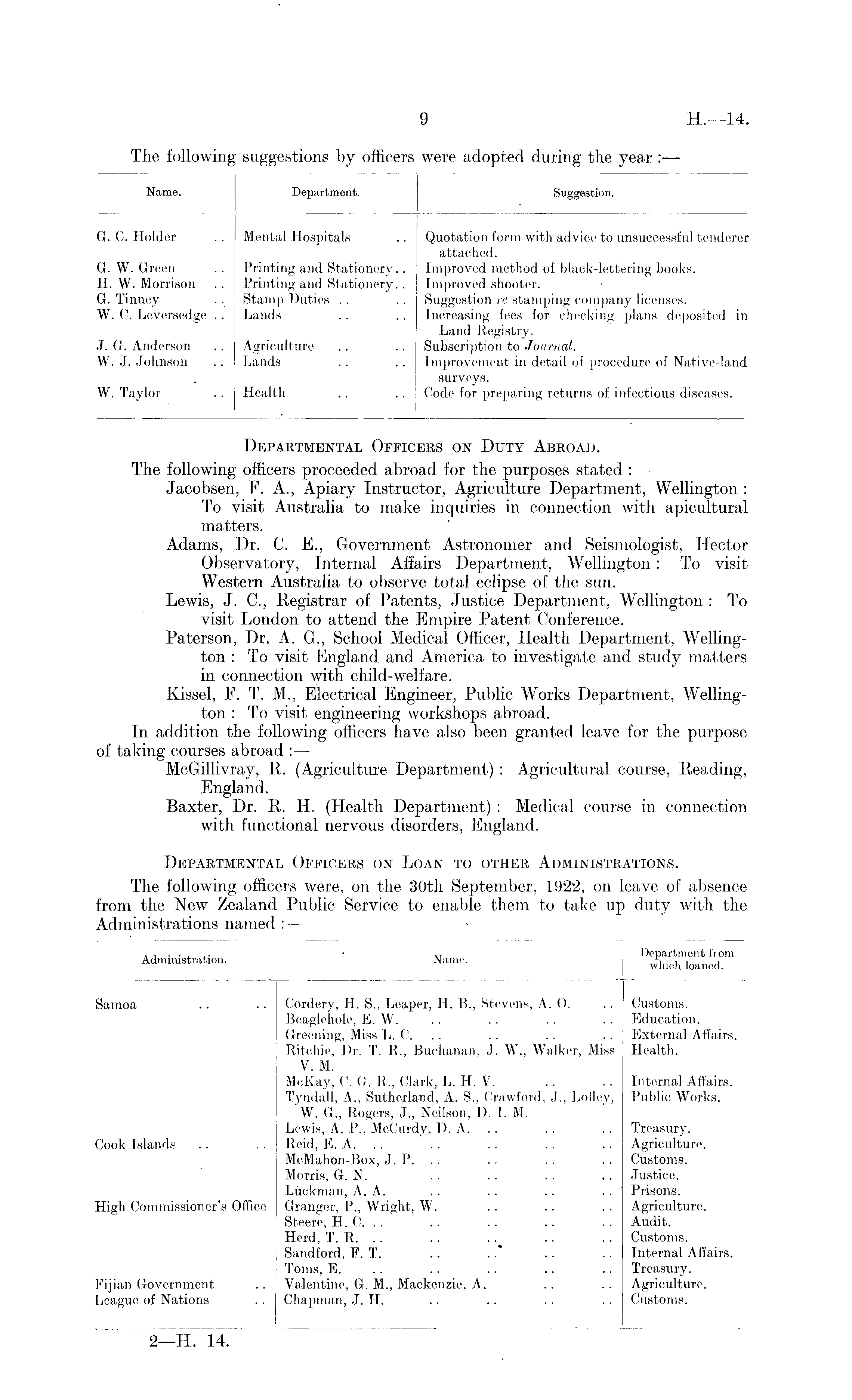 Departmental Officers on Duty Abroad. The following officers proceeded abroad for the purposes stated :— Jacobsen, F. A., Apiary Instructor, Agriculture Department, Wellington : To visit Australia to make inquiries in connection with apicultural matters. Adams, Dr. C. E., Government Astronomer and Seismologist, Hector Observatory, Internal Affairs Department, Wellington: To visit Western Australia to observe total eclipse of the sun. Lewis, J. C, Registrar of Patents, Justice Department, Wellington : To visit London to attend the Empire Patent Conference. Paterson, Dr. A. G., School Medical Officer, Health Department, Wellington : To visit England and America to investigate and study matters in connection with child-welfare. Kissel, F. T. M., Electrical Engineer, Public Works Department, Wellington : To visit engineering workshops abroad. In addition the following officers have also been granted leave for the purpose of taking courses abroad : — McGillivray, R. (Agriculture Department) : Agricultural course, Reading, England. Baxter, Dr. R. H. (Health Department) : Medical course in connection with functional nervous disorders, England. Departmental Officers on Loan to other Administrations. The following officers were, on the 30th September, 1922, on leave of absence from the New Zealand Public Service to enable them to take up duty with the Administrations named :—