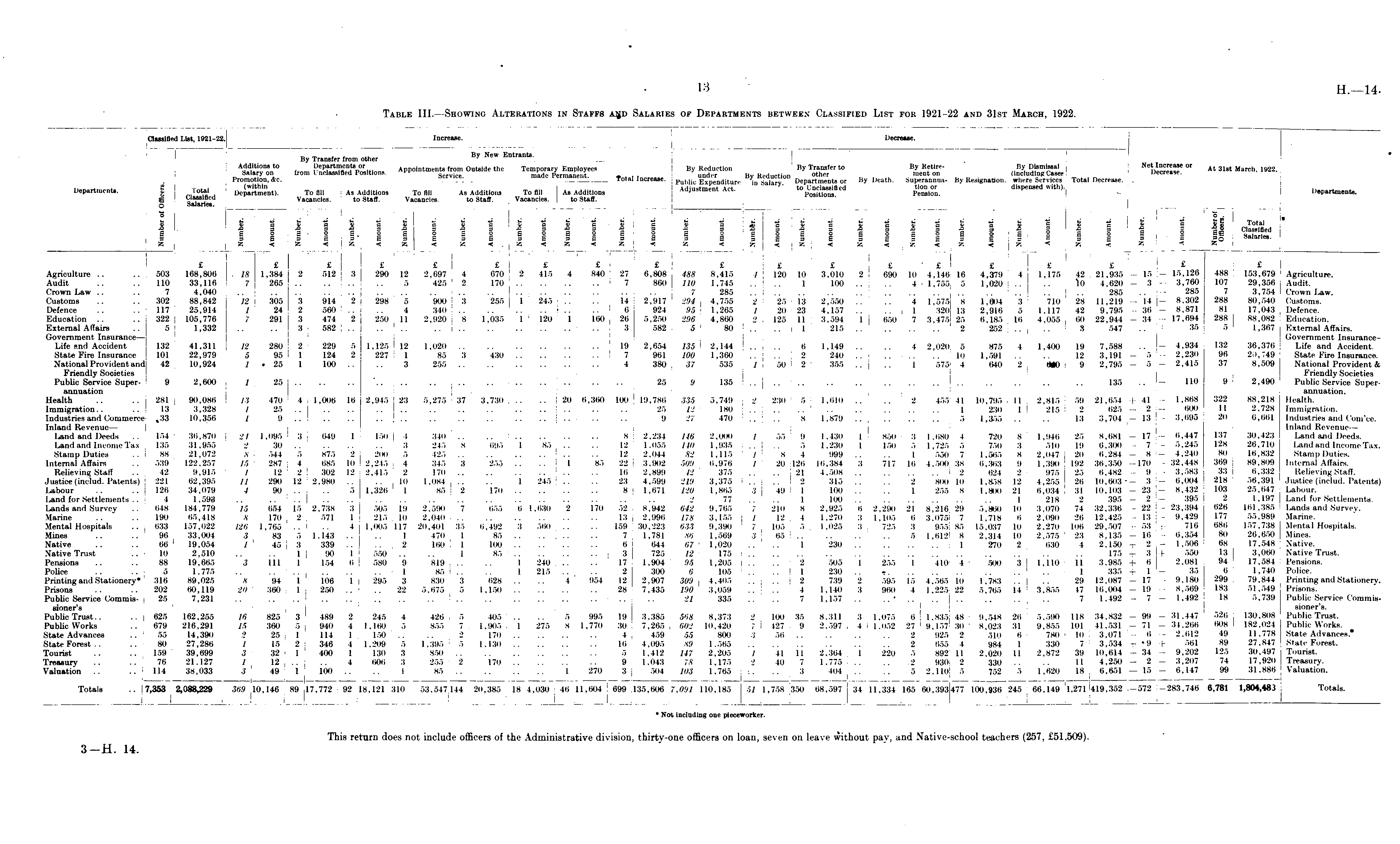 Table III.—Showing Alterations in Staffs and Salaries of Departments between Classified List for 1921-22 and 31st March, 1922.