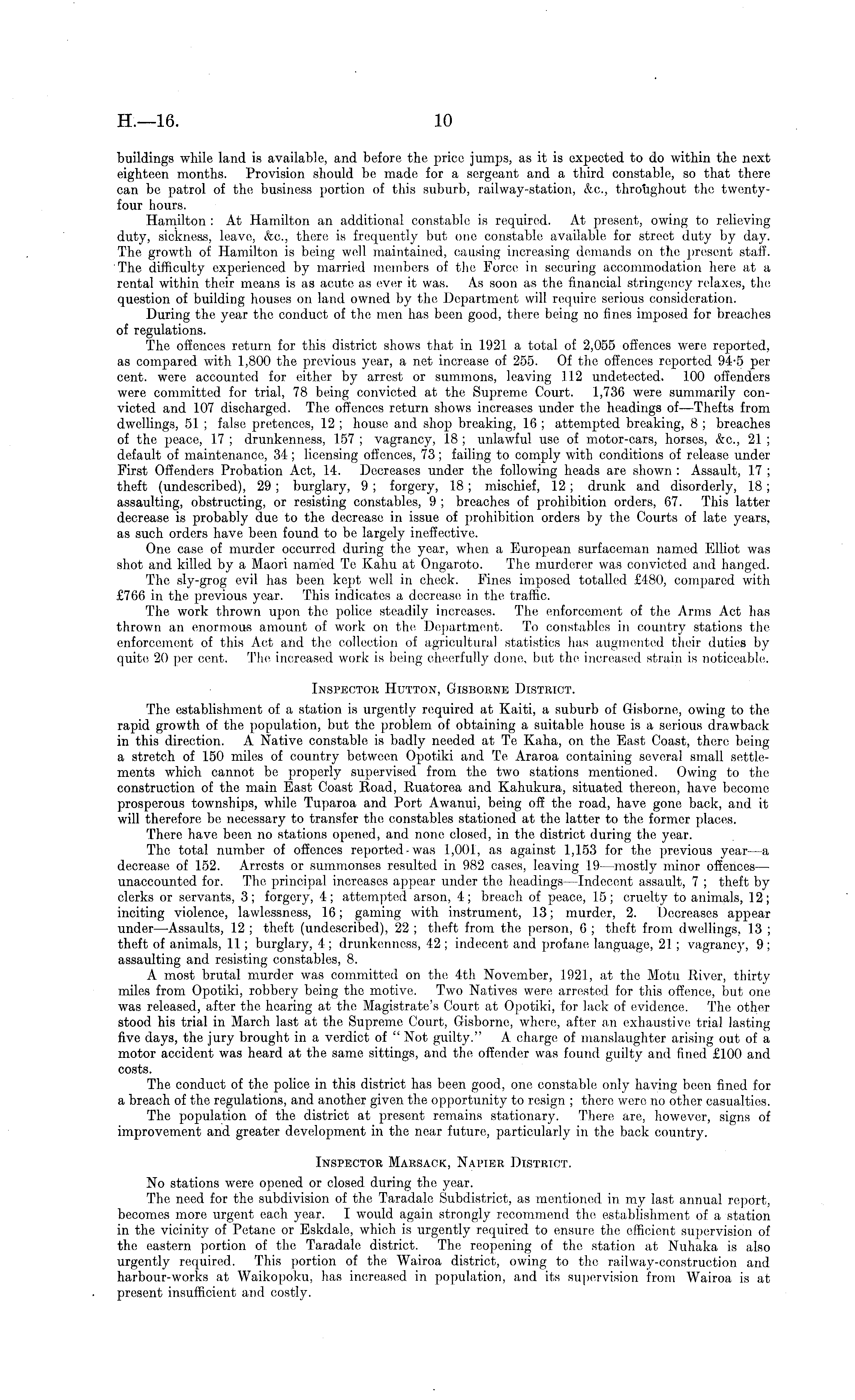 buildings while land is available, and before the price jumps, as it is expected to do within the next eighteen months. Provision should be made for a sergeant and a third constable, so that there can be patrol of the business portion of this suburb, railway-station, &c, throughout the twentyfour hours. Hamilton :At Hamilton an additional constable is required. At present, owing to relieving duty, sickness, leave, &c, there is frequently but one constable available for street duty by day. The growth of Hamilton is being well, maintained, causing increasing demands on the present staff. The difficulty experienced by married members of the Force in securing accommodation here at a rental within their means is as acute as ever it was. As soon as the financial stringency relaxes, the question of building houses on land owned by the Department will require serious consideration. During the year the conduct of the men has been good, there being no fines imposed for breaches of regulations. The offences return for this district shows that in 1921 a total of 2,055 offences were reported, as compared with 1,800 the previous year, a net increase of 255. Of the offences reported 94-5 per cent, were accounted for either by arrest or summons, leaving 112 undetected. 100 offenders were committed for trial, 78 being convicted at the Supreme Court. 1,736 were summarily convicted and 107 discharged. The offences return shows increases under the headings of—Thefts from dwellings, 51 ; false pretences, 12 ; house and shop breaking, 16 ; attempted breaking, 8 ; breaches of the peace, 17 ; drunkenness, 157 ; vagrancy, 18 ; unlawful use of motor-cars, horses, &c, 21 ; default of maintenance, 34; licensing offences, 73; failing to comply with conditions of release under First Offenders Probation Act, 14. Decreases under the following heads are shown : Assault, 17 ; theft (undescribed), 29 ; burglary, 9 ; forgery, 18 ; mischief, 12 ; drunk and disorderly, 18 ; assaulting, obstructing, or resisting constables, 9 ; breaches of prohibition orders, 67. This latter decrease is probably due to the decrease in issue of prohibition orders by the Courts of late years, as such orders have been found to be largely ineffective. One case of murder occurred during the year, when a European surfaceman named Elliot was shot and killed by a Maori named Te Kahu at Ongaroto. The murderer was convicted and hanged. The sly-grog evil has been kept well in check. Fines imposed totalled £480, compared with £766 in the previous year. This indicates a decrease in the traffic. The work thrown upon the police steadily increases. The enforcement of the Arms Act has thrown an enormous amount of work on the Department. To constables in country stations the enforcement of this Act and the collection of agricultural statistics has augmented their duties by quite 20 per cent. The increased work is being cheerfully done, but the increased strain is noticeable!. Inspector Hutton, Gisborne District. The establishment of a station is urgently required at Kaiti, a suburb of Gisborne, owing to the rapid growth of the population, but the problem of obtaining a suitable house is a serious drawback in this direction. A Native constable, is badly needed at Te Kaha, on the East Coast, there being a stretch of 150 miles of country between Opotiki and Te Araroa containing several small settlements which cannot be properly supervised from the two stations mentioned. Owing to the construction of the main East Coast Road, Ruatorea and Kahukura, situated thereon, have become prosperous townships, while Tuparoa and Port Awanui, being off the road, have gone back, and it will therefore be necessary to transfer the constables stationed at the latter to the former places. There have been no stations opened, and none closed, in the district during the year. The total number of offences reported-was 1,001, as against 1,153 for the previous year —a decrease of 152. Arrests or summonses resulted in 982 cases, leaving 19 —mostly minor offences— unaccounted for. The principal increases appear under the headings—lndecent assault, 7 ; theft by clerks or servants, 3; forgery, 4; attempted arson, 4; breach of peace, 15; cruelty to animals, 12; inciting violence, lawlessness, 16; gaming with instrument, 13; murder, 2. Decreases appear under —Assaults, 12 ; theft (undescribed), 22 ; theft from the person, 6 ; theft from dwellings, 13 ; theft of animals, 11; burglary, 4 ; drunkenness, 42 ; indecent and profane, language, 21 ; vagrancy, 9 ; assaulting and resisting constables, 8. A most brutal murder was committed on the 4th November, 1921, at the Motu River, thirty miles from Opotiki, robbery being the motive. Two Natives were arrested for this offence) but one was released, after the, hearing at the Magistrate's Court at Opotiki, for lack of evidence. The other stood his trial in March last at the Supreme Court, Gisborne, where, after an exhaustive trial lasting five days, the jury brought in a verdict of " Not guilty." A charge of manslaughter arising out of a motor accident was heard at the same sittings, and the offender was found guilty and fined £100 and costs. The conduct of the police in this district has been good, one constable only having been fined for a broach of the regulations, and another given the opportunity to resign ; there were, no other casualties. The population, of the district at present remains stationary. There are, however, signs of improvement and greater development in the near future, particularly in the back country. Inspector Marsack, Napier District. No stations were opened or closed during the year. The need for the subdivision of the Taradalo Subdistrict, as mentioned in my last annual report, becomes more urgent each year. I would again strongly recommend the establishment of a station in the vicinity of Petanc or Eskdale, which is urgently required to ensure the efficient supervision of the eastern portion of the Taradale dis