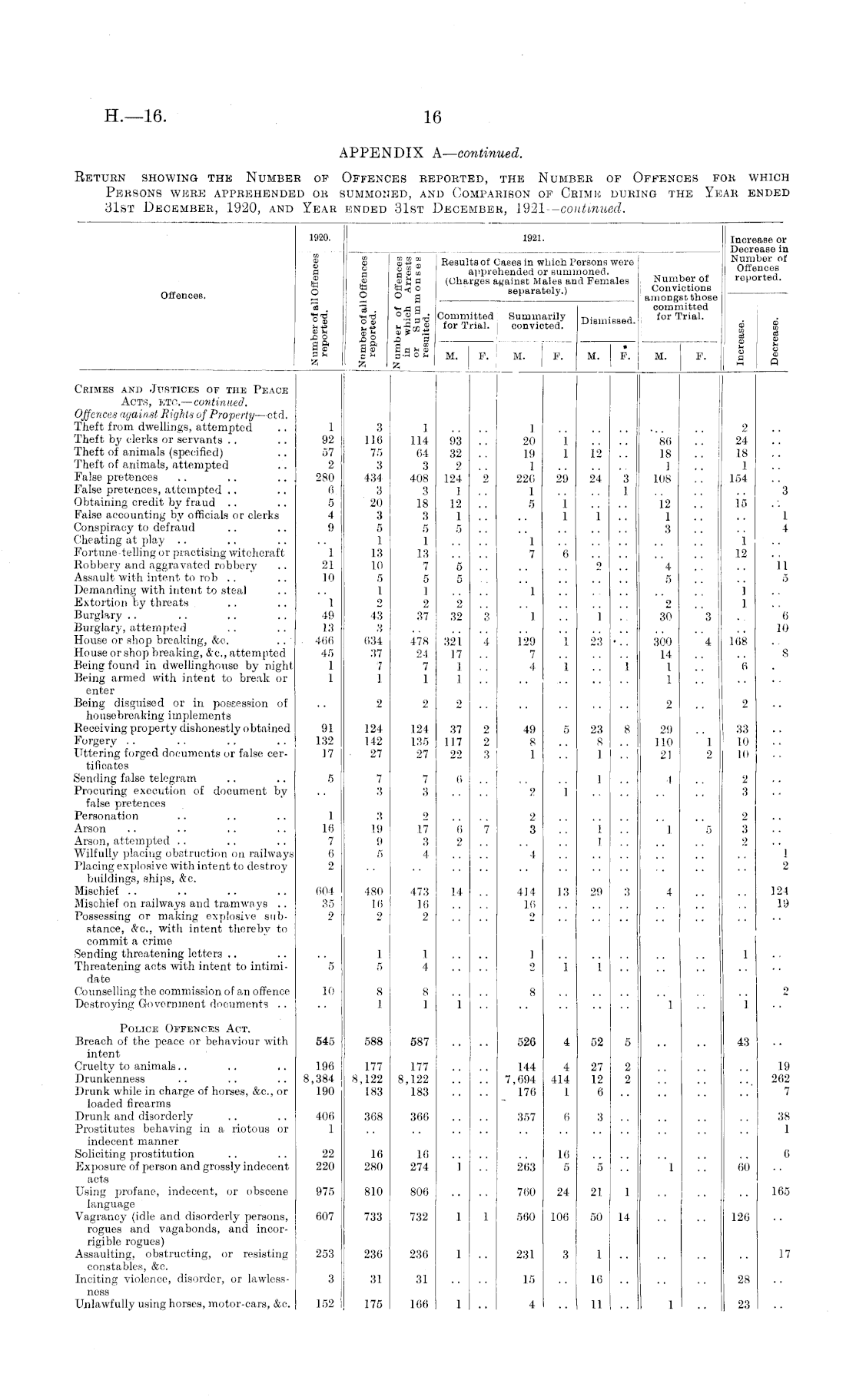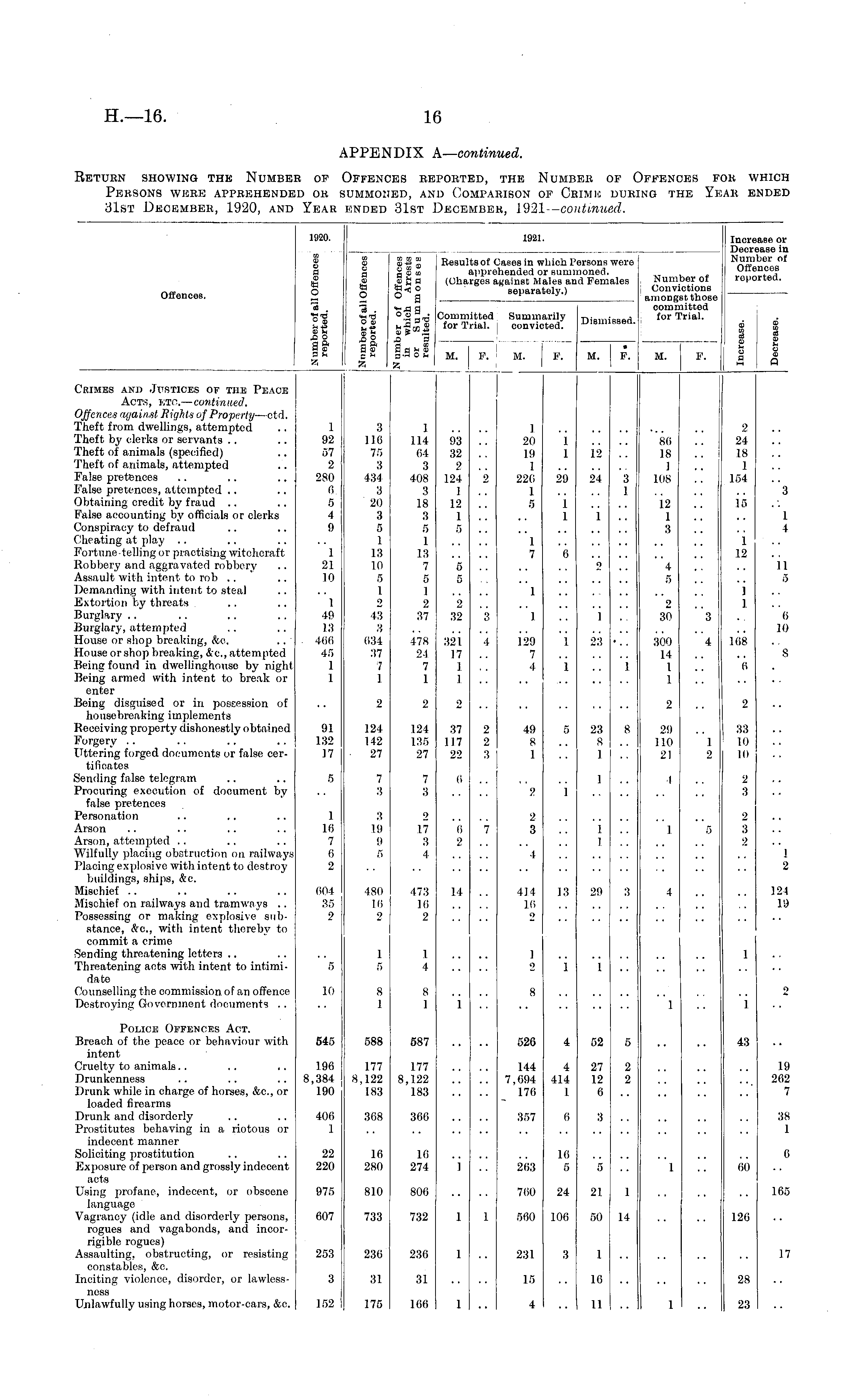 APPENDIX A— continued. Return showing the Number of Offences reported, the Number of Offences for which Persons were apprehended or summoned, and Comparison of Crime during the Year ended 31st December, 1920, and Year ended 31st December, 1921— continued.