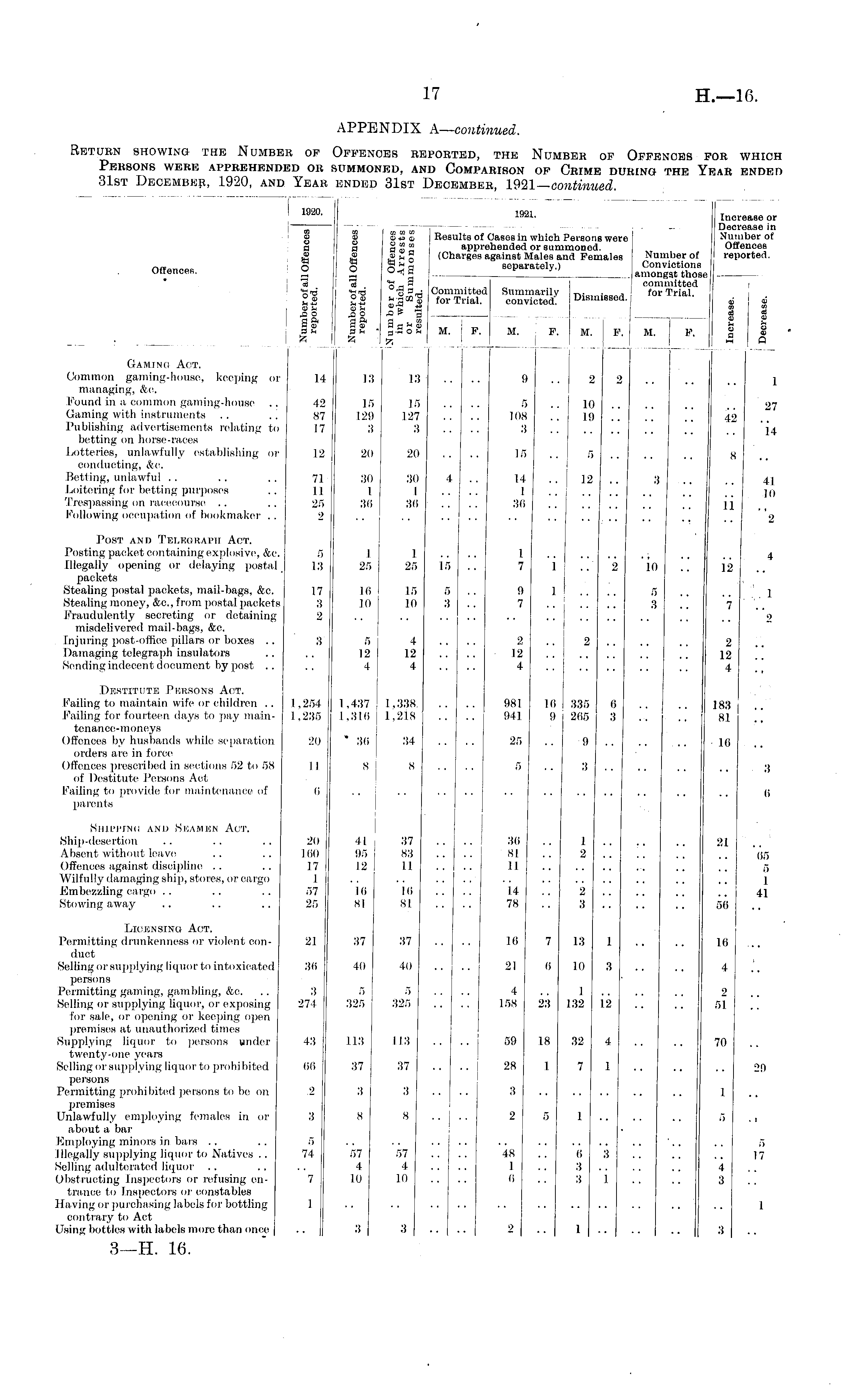 APPENDIX A— continued. Return showing the Number of Offences reported, the Number of Offences for which Persons were apprehended or summoned, and Comparison of Crime during the Year ended 31st December, 1920, and Year ended 31st December, 1921— continued.