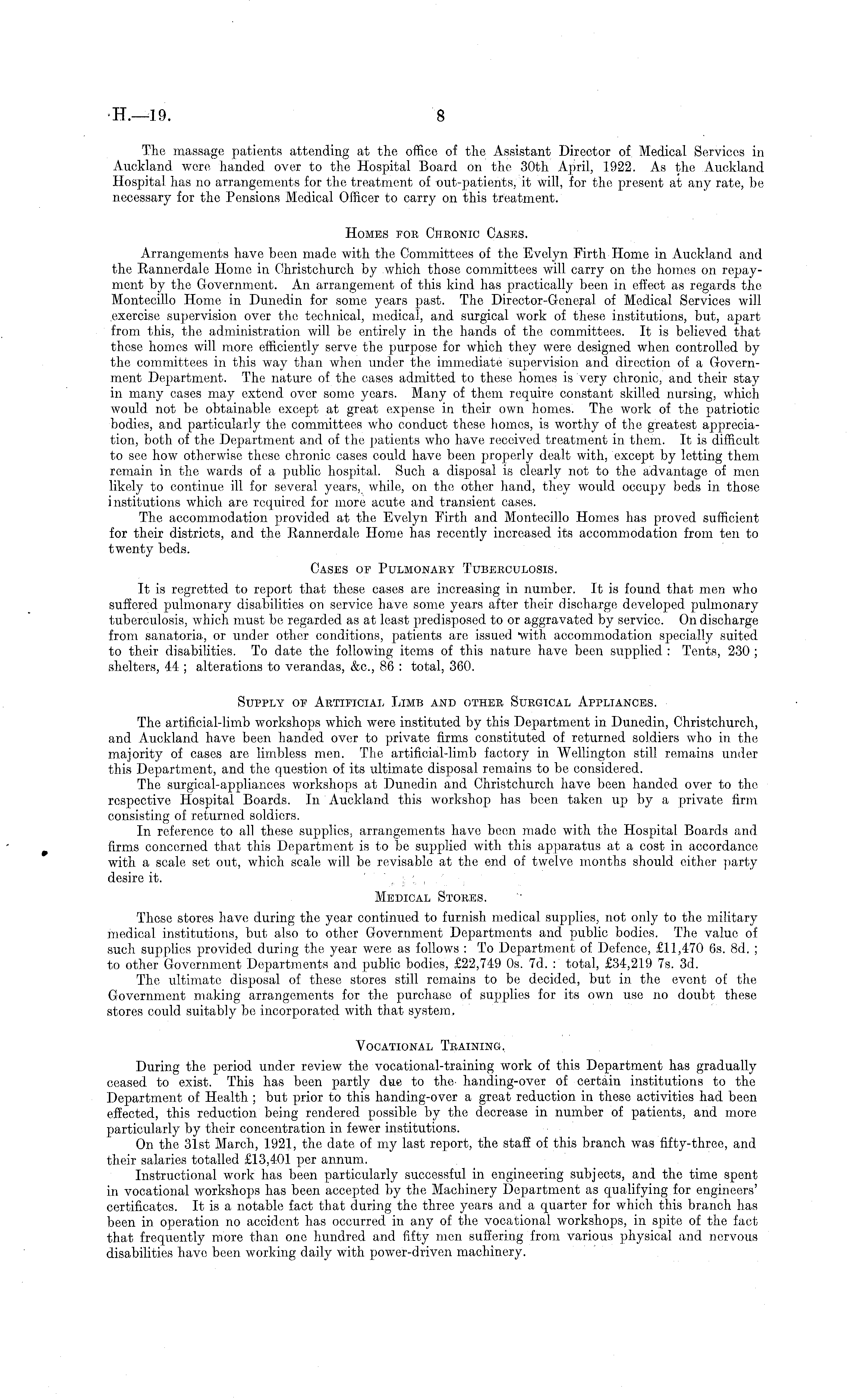 The massage patients attending at the office of the Assistant Director of Medical Services in Auckland were, handed over to the Hospital Board on the 30th April, 1922. As the Auckland Hospital has no arrangements for the treatment of out-patients, it will, for the present at any rate, be necessary for the Pensions Medical Officer to carry on this treatment. Homes for Chronic Cases. Arrangements have been made with the Committees of the Evelyn Firth Home in Auckland and the Rannerdalc Home in Christchurch by which those committees will carry on the homes on repayment by the Government. An arrangement of this kind has practically been in effect as regards the Montecillo Home in Dunedin for some years past. The Director-General of Medical Services will exercise supervision over tho technical, medical, and surgical work of these institutions, but, apart from this, the administration will be entirely in the hands of the committees. It is believed that those homes will more efficiently serve the purpose for which they were designed when controlled by the, committees in this way than when under the, immediate supervision and direction of a Government Department. The nature of the cases admitted to these homes is very chronic, and their stay in many cases may extend, over some years. Many of them require, constant skilled nursing, which would not be obtainable except at great expense in their own homos. The work of the patriotic bodies, and particularly the committees who conduct these homos, is worthy of the greatest appreciation, both of the Department and of the patients who have received treatment in them. It is difficult to see how otherwise these chronic cases could have been properly dealt with, except by letting them remain in the wards of a public hospital. Such a disposal is clearly not to the, advantage of men likely to continue ill for several years, while, on the other hand, they would occupy beds in those institutions which are required for more acute and transient cases. The accommodation provided at the Evelyn Firth and Montecillo Homes has proved sufficient for their districts, and the Rannerdale Home has recently increased its accommodation from ten to twenty beds. Cases of Pulmonary Tuberculosis. It is regretted to report that these cases are increasing in number. It is found that men who suffered pulmonary disabilities on service have some years after their discharge, developed, pulmonary tuberculosis, which must be regarded as at least predisposed to or aggravated by service. On discharge from, sanatoria,, or under other conditions, patients are issued "with accommodation specially suited to their disabilities. To date the following items of this nature have been supplied : Tents, 230 ; shelters, 44 ; alterations to verandas, &c, 86 : total, 360. Supply of Artificial Limb and other Surgical Appliances. The artificial-limb workshops which were instituted by this Department in Dunedin, Christchurch, and Auckland have been handed over to private firms constituted of returned soldiers who in the, majority of cases are, limbless men. The artificial-limb factory in Wellington still remains under this Department, and the question of its ultimate disposal remains to be considered. The surgical-appliances workshops at Dunedin and Christchurch have been handed over to tho respective Hospital Boards. In Auckland this workshop has been taken up by a private firm consisting of returned soldiers. In reference to all these supplies, arrangements have been made with tho Hospital Boards and firms concerned that this Department is to be supplied with this apparatus at a cost in accordance with a scale set out, which scale will be revisablc at the end of twelve months should either party desire it. ; Medical Stores. These stores have during the year continued to furnish medical supplies, not only to the military medical institutions, but also to other Government Departments and public bodies. The value of such supplies provided during the year were as follows : To Department of Defence, £11,470 6s. Bd. ; to other Government Departments and public bodies, £22,749 Os. 7d. : total, £34,219 7s. 3d. The ultimate disposal of these stores still remains to be decided, but in the event of tho Government making arrangements for the purchase of supplies for its own use no doubt these stores could suitably be incorporated with that system. Vocational Training, During the period under review the vocational-training work of this Department has gradually ceased to exist. This has been partly due to the handing-over of certain institutions to the Department of Health.; but prior to this handing-over a great reduction in these activities had been effected, this reduction being rendered possible by the decrease in number of patients, and more particularly by their concentration in fewer institutions. On the 31st March, .1921, the date of my last report, the staff of this branch was fifty-three, and their salaries totalled £13,401 per annum. Instructional work has been particularly successful in engineering subjects, and the time spent in vocational workshops has been accepted by the Machinery Department as qualifying for engineers' certificates. It is a notable fact that during the three years and a quarter for which this branch has been in operation no accident has occurred in any of the vocational workshops, in spite of the fact that frequently more than one hundred and fifty men suffering from various physical and nervous disabilities have been working daily with power-driven machinery.