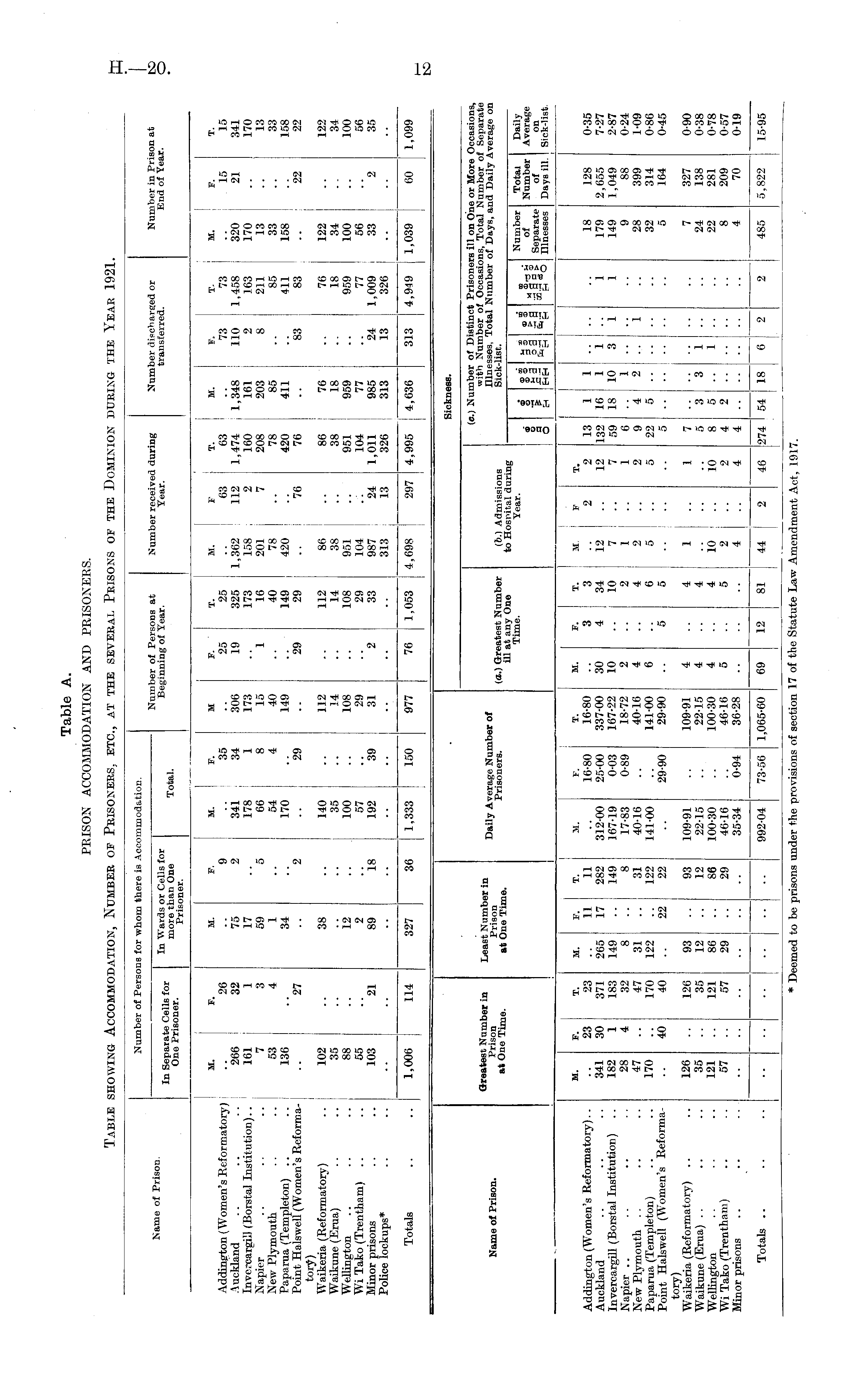 Table A. PRISON ACCOMMODATION AND PRISONERS. Table showing Accommodation, Number of Prisoners, etc., at the several Prisons of the Dominion during the Year 1921.