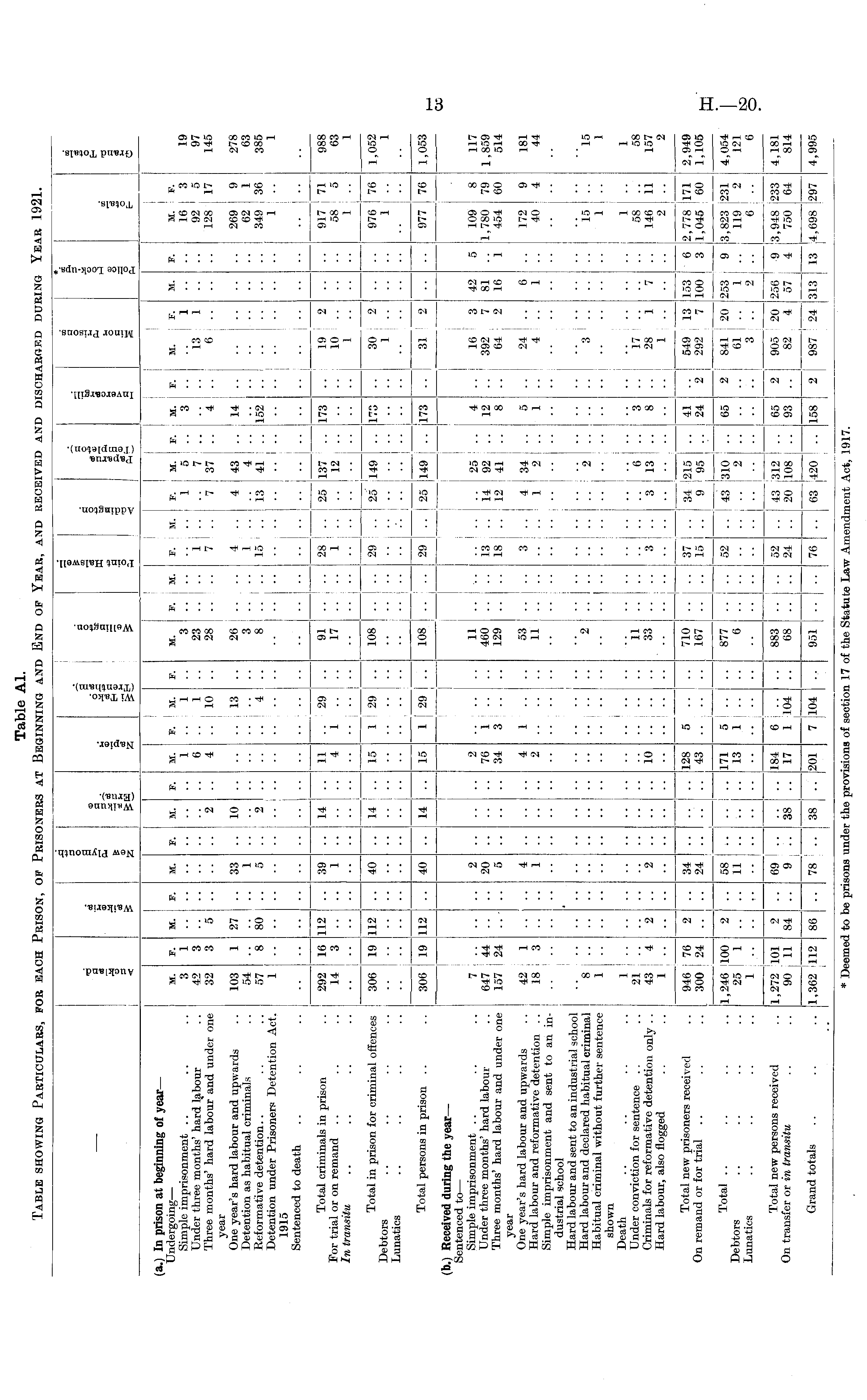 Table A1. Table showing Particulars, for each Prison, of Prisoners at Beginning and End of Year, and received and discharged during Year 1921.