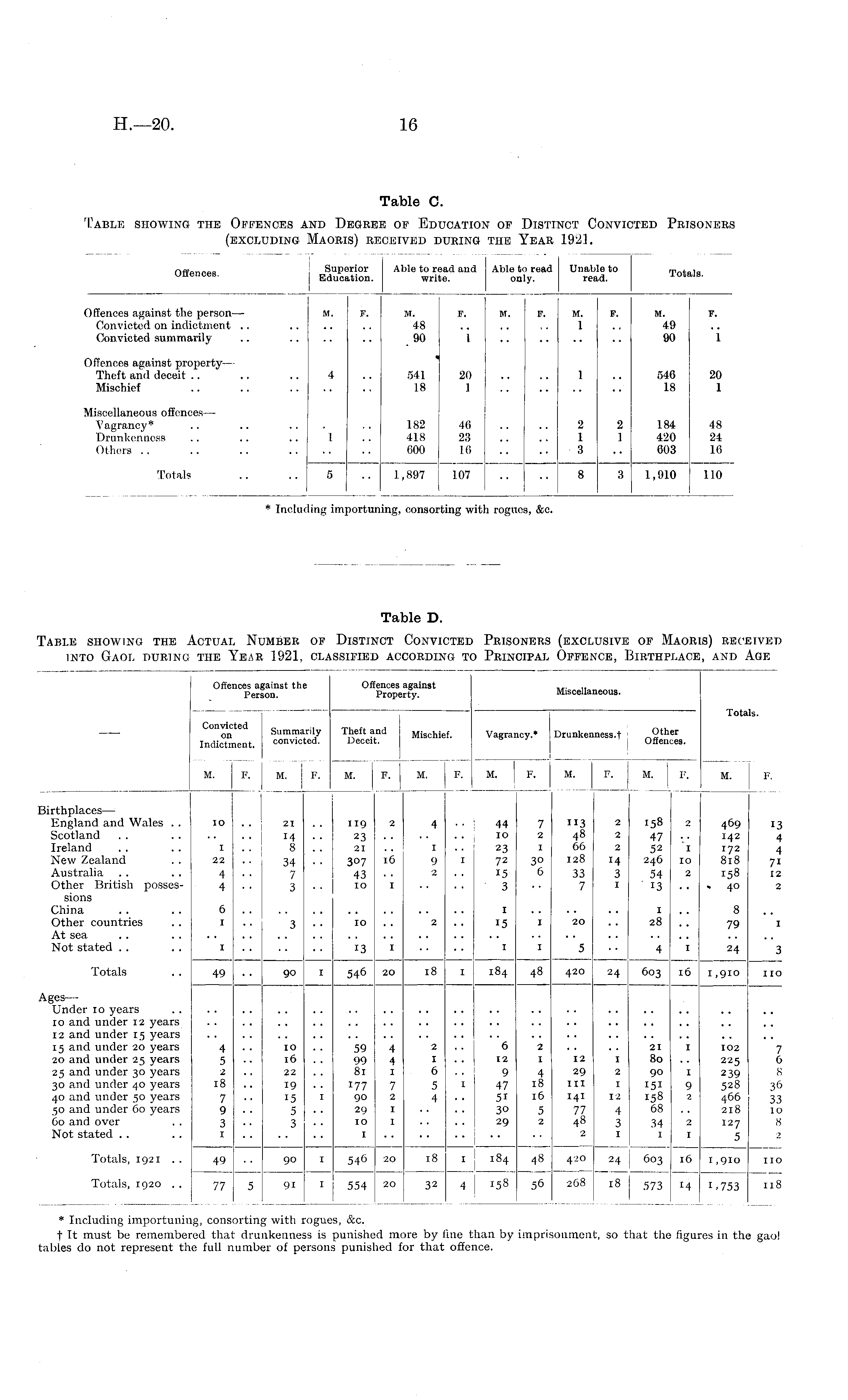 Table C. Table showing the Offences and Degree of Education of Distinct Convicted Prisoners (excluding Maoris) received during the Year 1921.