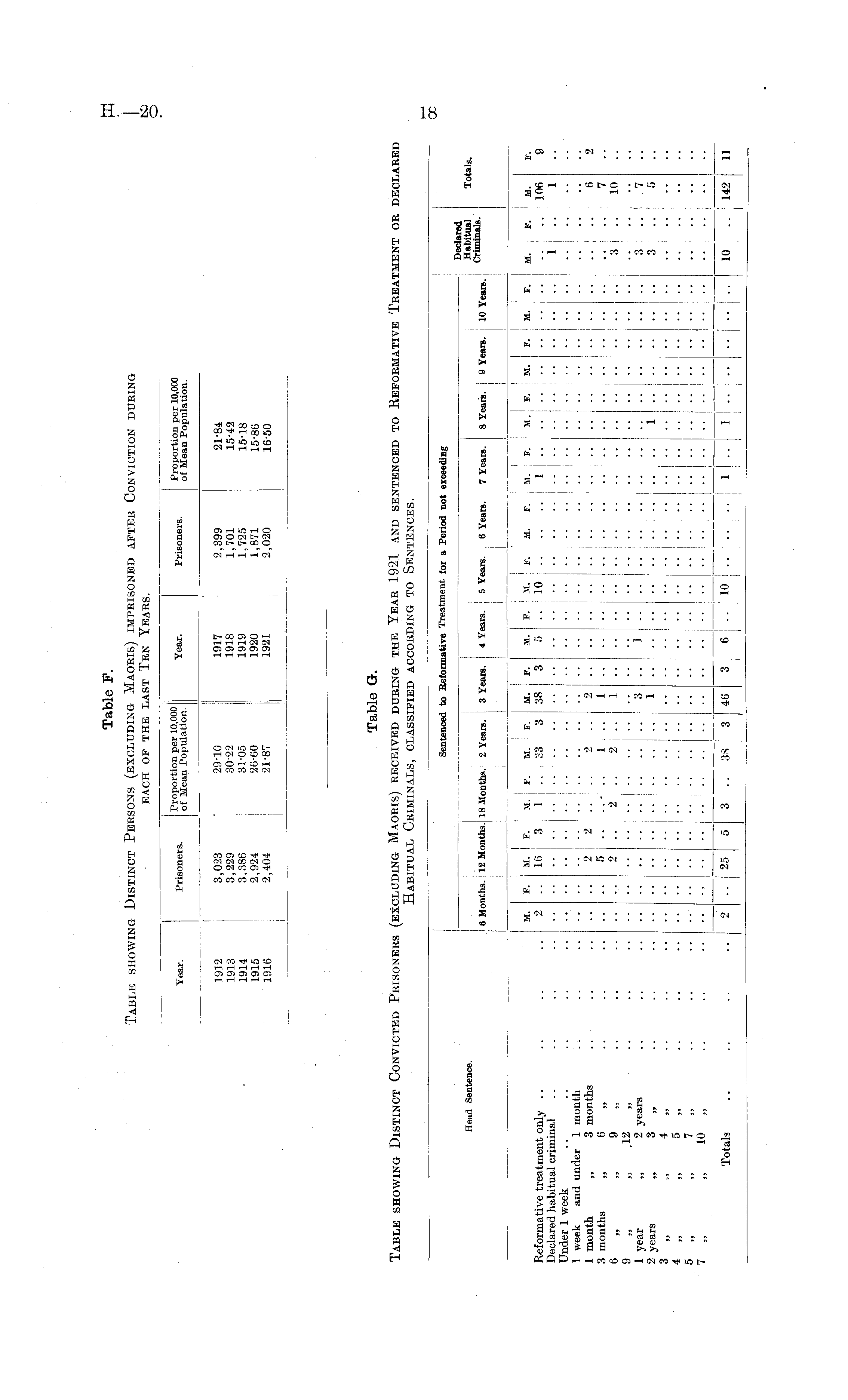 Table G. Table showing Distinct Convicted Prisoners (excluding Maoris) received during the Year 1921 and sentenced to Reformative Treatment or declared Habitual Criminals, classified according to Sentences.