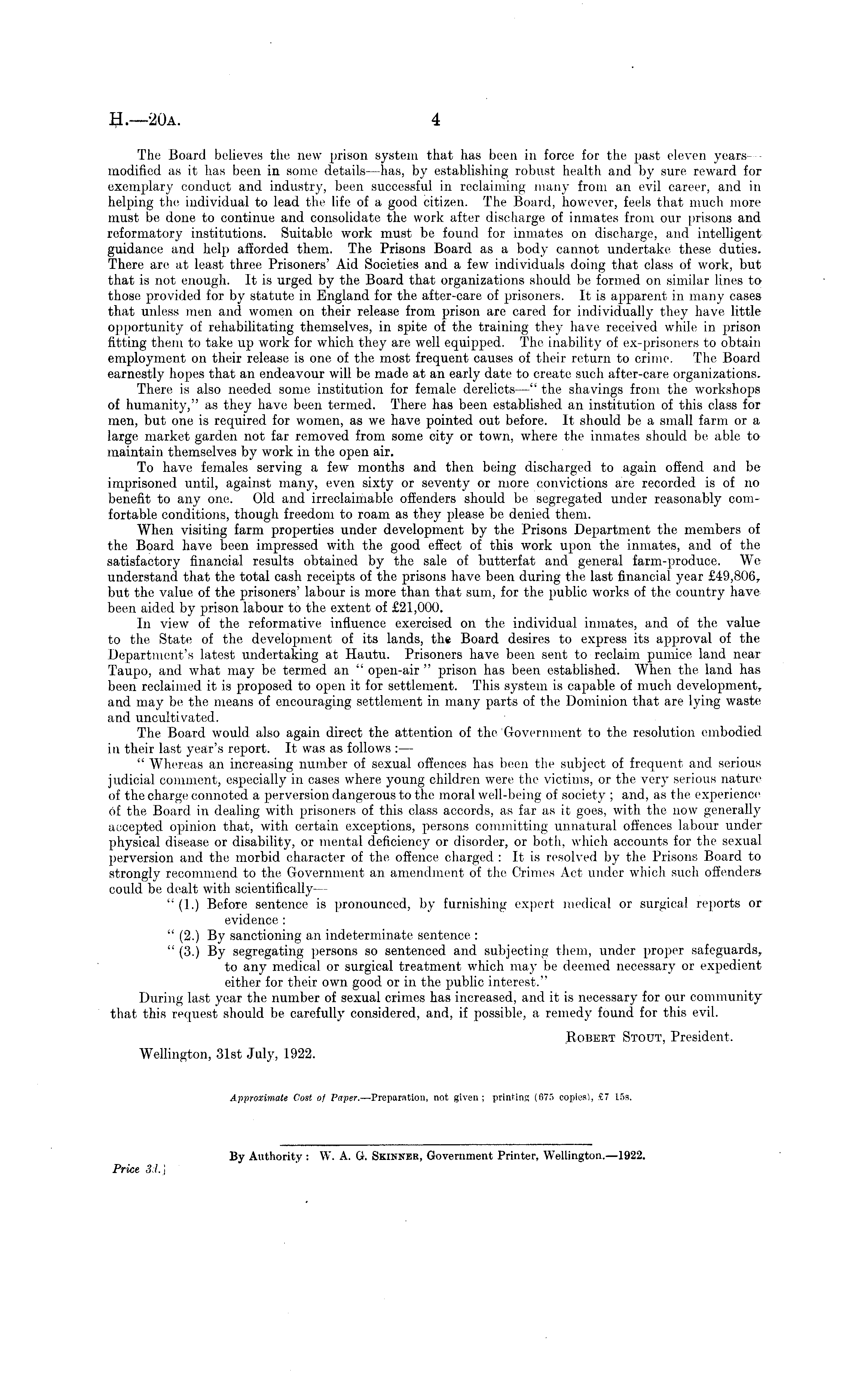 The Board believes the new prison system that has been in force for the past eleven yearsmodified as it has been in some details —has, by establishing robust health and by sure reward for exemplary conduct and industry, been successful in reclaiming many from an evil career, and in helping the individual to lead the life of a good citizen. The Board, however, feels that much more must be done to continue and consolidate the work after discharge of inmates from our prisons and reformatory institutions. Suitable work must be found for inmates on discharge, and intelligent guidance and help afforded them. The Prisons Board as a body cannot undertake these duties. There are at least three Prisoners' Aid Societies and a few individuals doing that class of work, but that is not enough. It is urged by the Board that organizations should be formed on similar lines to those provided for by statute in England for the after-care of prisoners. It is apparent in many cases that unless men and women on their release from prison are cared for individually they have little opportunity of rehabilitating themselves, in spite of the training they have received while in prison fitting them to take up work for which they are well equipped. The, inability of ex-prisoners to obtain employment on their release is one of the most frequent causes of their return to crime. The Board earnestly hopes that an endeavour will be made at an early date to create such after-care organizations. There is also needed some institution for female derelicts —" the shavings from the workshops of humanity," as they have been termed. There has been established an institution of this class for men, but one is required for women, as we have pointed out before. It should be a small farm or a large market garden not far removed from some city or town, where the inmates should be able to maintain themselves by work in the open air. To have females serving a few months and then being discharged to again offend and be imprisoned until, against many, even sixty or seventy or more convictions are recorded is of no benefit to any one. Old and irreclaimable offenders should be segregated under reasonably comfortable conditions, though freedom to roam as they please be denied them. When visiting farm properties under development by the Prisons Department the members of the Board have been impressed with the good effect of this work upon the inmates, and of the satisfactory financial results obtained by the sale of butterfat and general farm-produce. We understand that the total cash receipts of the prisons have been during the last financial year £49,806, but the value of the prisoners' labour is more than that sum, for the public works of the country have been aided by prison labour to the extent of £21,000. In view of the reformative influence exercised on the individual inmates, and of the value to the State of the development of its lands, the Board desires to express its approval of the Department's latest undertaking at Hautu. Prisoners have been sent to reclaim pumice land near Taupo, and what may be termed an " open-air " prison has been established. When the land has been reclaimed it is proposed to open it for settlement. This system is capable of much development, and may be the means of encouraging settlement in many parts of the Dominion that are lying waste and uncultivated. The Board would also again direct the attention of the Government to the resolution embodied i v their last year's report. It was as follows : — " Whereas an increasing number of sexual offences has been the subject of frequent and serious judicial comment, especially in cases where young children were the victims, or the very serious nature of the charge connoted a perversion dangerous to the moral well-being of society ; and, as the experience of the Board in dealing with prisoners of this class accords, as far as it goes, with the now generally accepted opinion that, with certain exceptions, persons committing unnatural offences labour under physical disease or disability, or mental deficiency or disorder, or both, which accounts for the sexual perversion and the morbid character of the, offence charged : It is resolved by the Prisons Board to strongly recommend to the Government an amendment of the Crimes Act under which such offenders could be dealt with scientifically — "(1.) Before sentence is pronounced, by furnishing expert medical or surgical reports or evidence : " (2.) By sanctioning an indeterminate sentence : " (3.) By segregating persons so sentenced and subjecting them, under proper safeguards, to any medical or surgical treatment which may be deemed necessary or expedient either for their own good or in the public interest." During last year the number of sexual crimes has increased, and it is necessary for our community that this request should be carefully considered, and, if possible, a remedy found for this evil. Robert Stout, President. Wellington, 31st July, 1922.