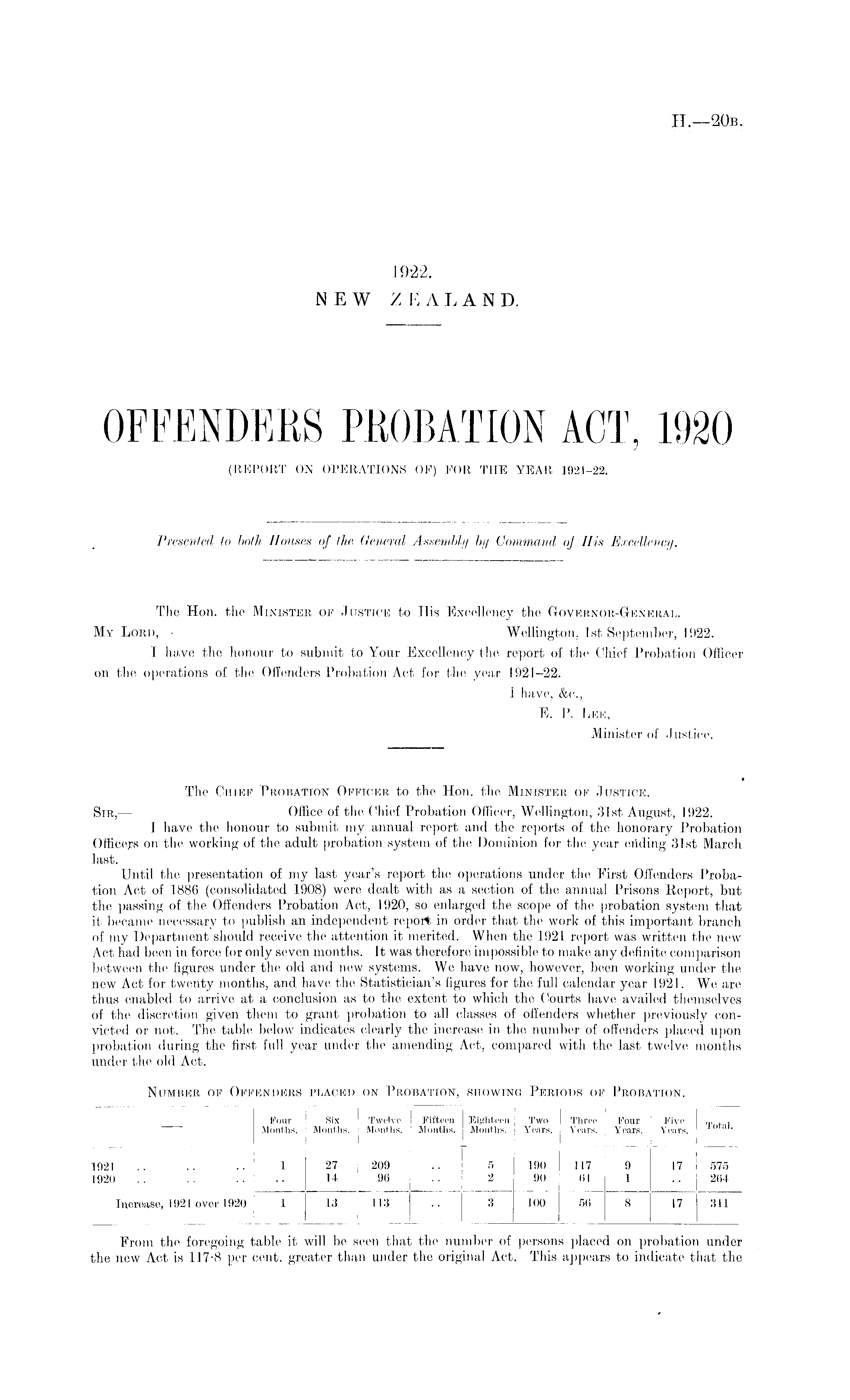 The Hon. the Minister of Justice to His Excellency the Governor-General. My Lord, — Wellington, Ist September, 1922. I hove the honour to submit to Your Excellency the, report of the Chief Probation Officer on the operations of the Offenders Probation Act for the year 1921-22. I have, &c, E. P. Lee, Minister of Justice. The Chief Probation Officer to the Hon. the. Minister of Justice. SlB — Office of the Chief Probation Officer, Wellington, 31st August, 1922. I have the honour to submit my annual report and the reports of the honorary Probation Officers on the working of the adult probation system of the Dominion for the year ending 31st March last. Until the presentation of my last year's report the operations under the First Offenders Probation Act of 1886 (consolidated 1908) were dealt with as a section of tho annual Prisons Report, but the passing of the Offenders Probation Act, 1920, so enlarged the scope of the probation system that it became necessary to publish an independent report in order that the work of this important branch of my Department should receive the attention it merited. When the 1921 report was written the new Act had been in force for only seven months. It was therefore impossible to make any definite comparison between the figures under the old and new systems. We have now, however, been working under the new Act for twenty months, and have the Statistician's figures for the full calendar year 192.1. We are thus enabled to arrive at a conclusion as to the extent to which tho Courts have availed themselves of the discretion given them to grant probation to all classes of offenders whether previously convicted or not. The, table below indicates clearly the increase in the number of offenders placed upon probation during the first full year under the amending Act, compared with the last.twelve months under the old Act.