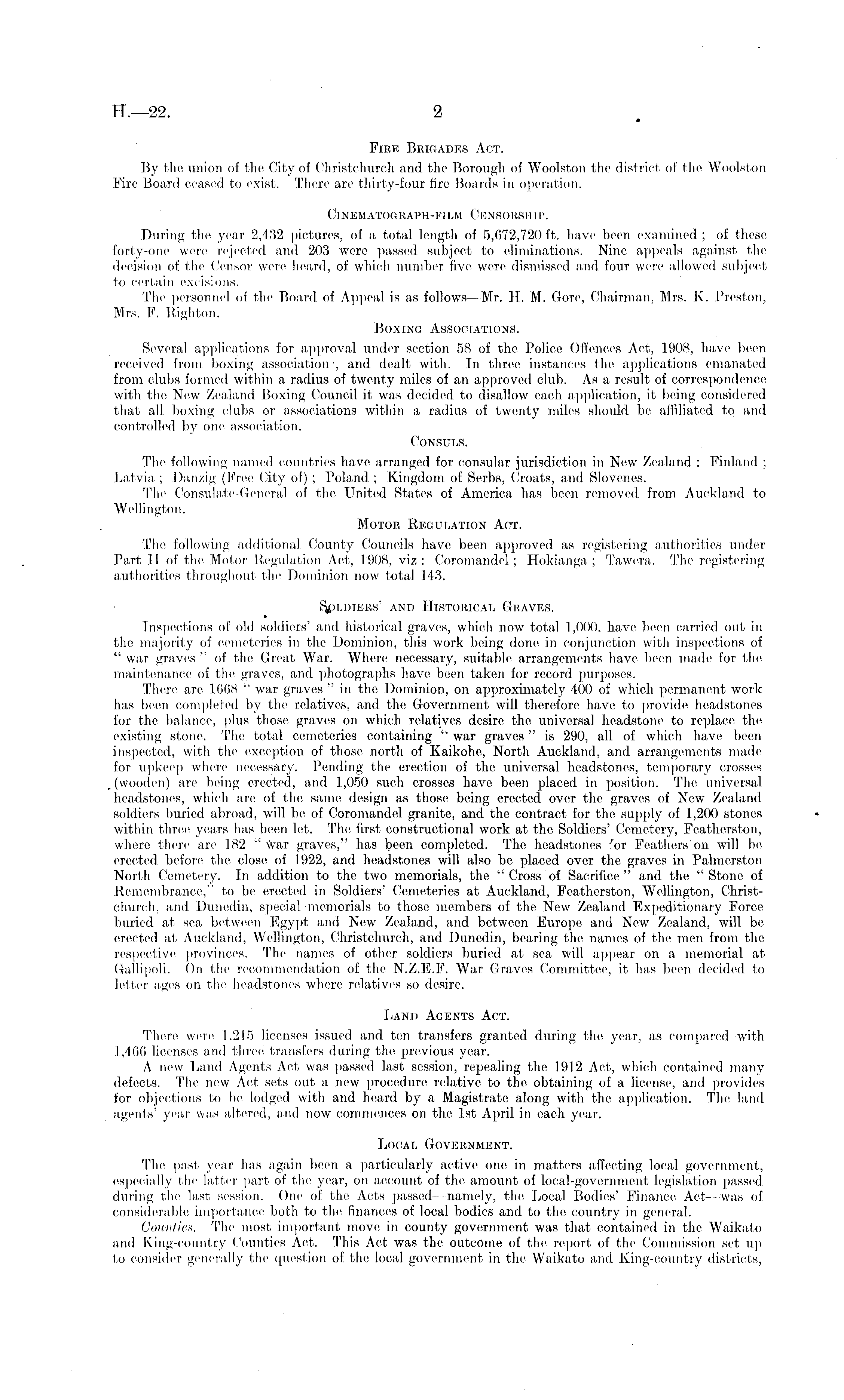 Fire Brigades Act. By the union of the City of Christehurch and the Borough of Woolston the district of the Woolston Fire Board ceased to exist. There are thirty-four fire Boards in operation. OINEMATOGRAPH-FILM CENSORSHIP. During the year 2,432 pictures, of a total length of 5,672,720 ft. have been examined ; of these forty-one were rejected and 203 were passed subject to eliminations. Nine appeals against the decision of the Censor were heard, of which number live were dismissed and four were allowed subject to certain excisions. The personnel of the Board of Appeal is as follows —Mr. H. M. Gore, Chairman, Mrs. K. Preston, Mrs. F. Righton. Boxing Associations. Several applications for approval under section 58 of the Police Offences Act, 1908, have been received from boxing association •, and dealt with. In three instances the applications emanated from clubs formed within a radius of twenty miles of an approved club. As a result of correspondence with the New Zealand Boxing Council it was decided to disallow each application, it being considered that all boxing clubs or associations within a radius of twenty miles should be affiliated to and controlled by one association. Consuls. The following named countries have arranged for consular jurisdiction in New Zealand : Finland ; Latvia ; Danzig (Free City of) ; Poland ; Kingdom of Serbs, Croats, and Slovenes. The Consulate-General of the United States of America has been removed from Auckland to Wellington. Motor Regulation Act. The following additional County Councils have been approved as registering authorities under Part II of the Motor Regulation Act, 1908, viz : Coromandel ; Hokianga ; Tawera. The registering authorities throughout the Dominion now total 143. Soldiers' and Historical Graves. Inspections of old soldiers' and historical graves, which now total 1,000, have been carried out in the majority of cemeteries in the Dominion, this work being done in conjunction with inspections of " war graves " of the Great War. Where necessary, suitable arrangements have been made for the maintenance of the graves, and photographs have been taken for record purposes. There arc , 1608 " war graves " in the Dominion, on approximately 400 of which permanent work has been completed by the relatives, and the Government will therefore have to provide headstones for the balance, plus those graves on which relatives desire the universal headstone to replace the existing stone. The total cemeteries containing " war graves" is 290, all of which have been inspected, with the exception of those north of Kaikohe, North Auckland, and arrangements made for upkeep where necessary. Pending the erection of the universal headstones, temporary crosses (wooden) are being erected, and 1,050 such crosses have been placed in position. The universal headstones, which are of tin; same design as those being erected over the graves of New Zealand soldiers buried abroad, will be of Coromandel granite, and the contract for the supply of 1,200 stones within three years has been let. The first constructional work at the Soldiers' Cemetery, Featherston, where there are 182 "war graves," has been completed. The headstones for Feathers on will be erected before the close of 1922, and headstones will also be placed over the graves in Palmerston North Cemetery. In addition to the two memorials, the "Cross of Sacrifice" and the "Stone of Remembrance," to be erected in Soldiers' Cemeteries at Auckland, Foatherston, Wellington, Christchurch, and Dunedin, special memorials to those members of the New Zealand Expeditionary Force buried at sea between Egypt and New Zealand, and between Europe and New Zealand, will be erected at Auckland, Wellington, Christchurch, and Dunedin, bearing the names of the men from the respective provinces. The names of other soldiers buried at sea will appear on a memorial at Gallipoli. On the recommendation of the N.Z.E.F. War Graves Committee, it has been decided to letter ages on the headstones where relatives so desire. Land Agents Act. There were 1,215 licenses issued and ten transfers granted during the year, as compared with 1,466 licenses and three transfers during the previous year, A new Land Agents Act was passed last session, repealing the 1912 Act, which contained many defects. The new Act sets out a new procedure, relative to the obtaining of a license, and provides for objections to be lodged with and heard by a Magistrate along with the application. The land agents' year was altered, and now commences on the Ist April in each year. Local Government. The past year has again been a particularly active one in matters affecting local government, especially the latter part of the year, on account of the amount of local-government legislation passed during the last session. One of the Acts passed namely, the Local Bodies' Finance Act—was of considerable importance both to the finances of local bodies and to the country in general. Counties. The most important move in county government was that contained in the, Waikato and King-country Counties Act. This Act was the outcome of the report of the Commission set up to consider generally the question of the local government in the Waikato and King-country districts,