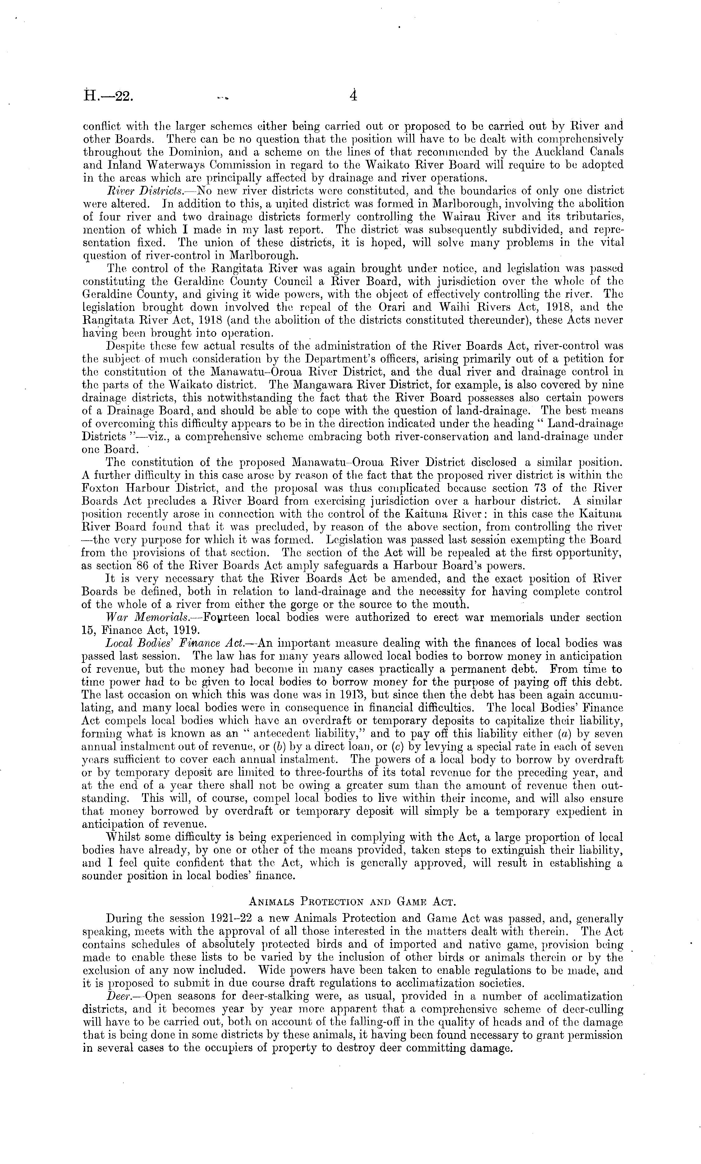 conflict witli the larger schemes either being carried out or proposed to be carried out by River and other Boards. There can be no question that the position will have to be dealt with comprehensively throughout the Dominion, and a scheme on the lines of that recommended by the Auckland Canals and Inland Waterways Commission in regard to the Waikato River Board will require to be adopted in the areas which are principally affected by drainage and. river operations. River Districts. —No new river districts were constituted, and the boundaries of only one district were altered. In addition to this, a united district was formed in Marlborough, involving the abolition of four river and two drainage districts formerly controlling the Wairau River and its tributaries, mention of which I made in my last report. The district was subsequently subdivided, and representation fixed. The union of these districts, it is hoped, will solve many problems in the vital question of river-control in Marlborough. The control of the Rangitata River was again brought under notice, and legislation was passed constituting the Geraldine County Council a River Board, with jurisdiction over the whole of the Geraldine County, and giving it wide powers, with the object of effectively controlling the river. The legislation brought down involved the repeal of the Orari and Waihi Rivers Act, 1918, and the Rangitata River Act, 1918 (and the abolition of the districts constituted thereunder), these Acts never having been brought into operation. Despite these few actual results of the administration of the River Boards Act, river-control was the subject of much consideration by the Department's officers, arising primarily out of a petition for the constitution of the Manawatu-Oroua River District, and the dual river and drainage control in the parts of the Waikato district. The Mangawara River District, for example, is also covered by nine drainage districts, this notwithstanding the fact that the River Board possesses also certain powers of a Drainage Board, and should be able to cope with the question of land-drainage. The best means of overcoming this difficulty appears to be in the direction indicated under the heading " Land-drainage Districts " —viz., a comprehensive scheme embracing both river-conservation and land-drainage under one Board. The constitution of the proposed Manawatu-Oroua River District disclosed a similar position. A further difficulty in this case arose by reason of the fact that the proposed river district is within the Foxton Harbour District, and the proposal was thus complicated because section 73 of the River Boards Act precludes a River Board from exercising jurisdiction over a harbour district. A similar position recently arose in connection with the control of the Kaituna River: in this case the Kaituna River Board found that it was precluded, by reason of the above section, from controlling the river —the very purpose for which it was formed. Legislation was passed last session exempting the Board from the provisions of that section. The section of the Act will be repealed at the first opportunity, as section 86 of the River Boards Act amply safeguards a Harbour Board's powers. It is very necessary that the River Boards Act be amended, and the exact position of River Boards be defined, both in relation to land-drainage and the necessity for having complete control of the whole of a river from either the gorge or the source to the mouth. War Memorials.- Fourteen local bodies were authorized to erect war memorials under section 15, Finance Act, 1919. Local Bodies' Finance Act. —An important measure dealing with the finances of local bodies was passed last session. The law has for many years allowed local bodies to borrow money in anticipation of revenue, but the money had become in many cases practically a permanent debt. From time to time power had to be given to local bodies to borrow money for the purpose of paying off this debt. The last occasion on which this was done was in 19T3, but since then the debt has been again accumulating, and many local bodies were, in consequence in financial difficulties. The local Bodies' Finance Act compels local bodies which have an overdraft or temporary deposits to capitalize their liability, forming what is known as an " antecedent liability," and to pay off this liability either (a) by seven annual instalment out of revenue, or (b) by a direct loan, or (c) by levying a special rate in each of seven years sufficient to cover each annual instalment. The powers of a local body to borrow by overdraft or by temporary deposit are limited to three-fourths of its total revenue for the preceding year, and at the end of a year there shall not be owing a greater sum than the amount of revenue then outstanding. This will, of course, compel local bodies to live within their income, and will also ensure that money borrowed by overdraft or temporary deposit will simply be a temporary expedient in anticipation of revenue. Whilst some difficulty is being experienced in complying with the Act, a large proportion of local bodies have already, by one or other of the means provided, taken steps to extinguish their liability, and I feel quite confident that the Act, which is generally approved, will result in establishing a sounder position in local bodies' finance. Animals Protection and Game Act. During the session 1921—22 a new Animals Protection and Game Act was passed, and, generally speaking, meets with the approval of all those interested in the matters dealt with therein. The Act contains schedules of absolutely protected birds and of imported and native game, provision being made to enable these lists to be varied by the inclusion of other birds or animals therein or by the exclusion of any now included. Wide powers have been taken to enable regulations to be made, and it is proposed to submit in due course draft regulations to acclimatization societies
