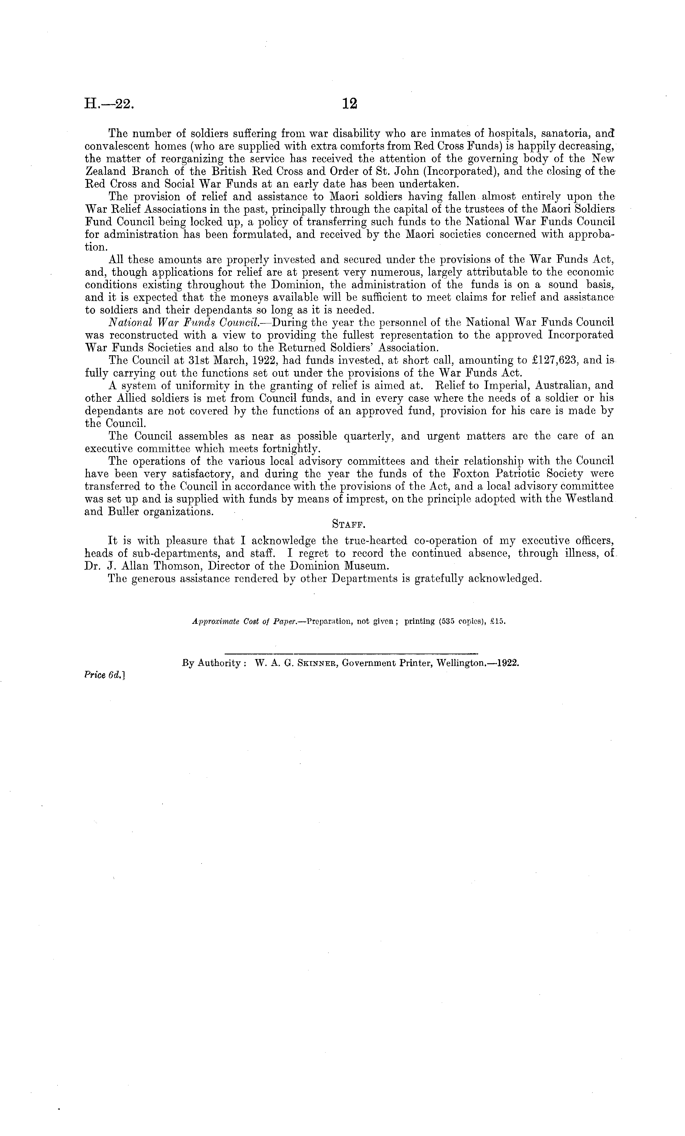 The number of soldiers suffering from war disability who are inmates of hospitals, sanatoria, and! convalescent homes (who are supplied with extra comforts from Red Cross Funds) is happily decreasing, the matter of reorganizing the service has received the attention of the governing body of the New Zealand Branch of the British. Red Cross and Order of St. John (Incorporated), and the closing of the Red Cross and Social War Funds at an early date has been undertaken. The provision of relief and assistance to Maori soldiers having fallen almost entirely upon the War Relief Associations in the past, principally through the capital of the trustees of the Maori Soldiers Fund Council being locked up, a policy of transferring such funds to the National War Funds Council for administration has been formulated, and received by the Maori societies concerned with approbation. All these amounts are properly invested and secured under the provisions of the War Funds Act, and, though applications for relief are at present very numerous, largely attributable to the economic conditions existing throughout the Dominion, the administration of the funds is on a sound basis,, and it is expected that the moneys available will be sufficient to meet claims for relief and assistance to soldiers and their dependants so long as it is needed. National War Funds Council. —During the year the personnel of the National War Funds Council was reconstructed with a view to providing the fullest representation to the approved Incorporated War Funds Societies and also to the Returned Soldiers' Association. The Council at 31st March, 1922, had funds invested, at short call, amounting to £127,623, and is fully carrying out the functions set out under the provisions of the War Funds Act. A system of uniformity in the granting of relief is aimed at. Relief to Imperial, Australian, and other Allied soldiers is met from Council funds, and in every case where the needs of a soldier or his dependants are not covered by the functions of an approved fund, provision for his care is made by the Council. The Council assembles as near as possible quarterly, and urgent matters are the care of an executive committee which meets fortnightly. The operations of the various local advisory committees and their relationship with the Council have been very satisfactory, and during the } r ear the funds of the Foxton Patriotic Society were transferred to the Council in accordance with the provisions of the Act, and a local advisory committee was set up and is supplied with funds by means of imprest, on the principle adopted with the Westland and Buller organizations. Staff. It is with pleasure that I acknowledge the true-hearted co-operation of my executive officers, heads of sub-departments, and staff. I regret to record the continued absence, through illness, of Dr. J. Allan Thomson, Director of the Dominion Museum. The generous assistance rendered by other Departments is gratefully acknowledged.