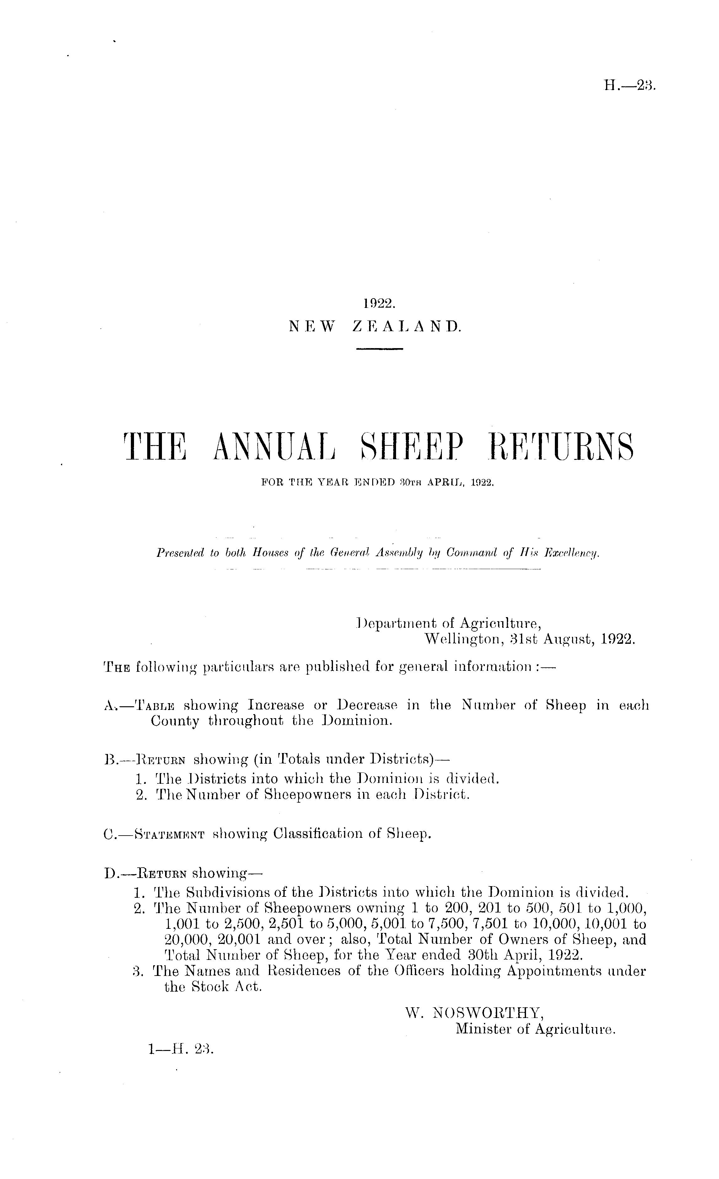 Department of Agriculture, Wellington, 31st August, 1922. The following particulars are published for general information:— / A_ —Table showing Increase or Decrease in the Number of Sheep in each County throughout the Dominion. B. —Return showing (in Totals under Districts) — 1. The Districts into which the Dominion is divided. 2. The Number of Sheepowners in each District. C. —Statement showing Classification of Sheep. D.—Return showing —- 1. The Subdivisions of the Districts into which the Dominion is divided. 2. The Number of Sheepowners owning 1 to 200, 201 to 500, 501 to 1,000, 1,001 to 2,500, 2,501 to 5,000, 5,001 to 7,500, 7,501 to 10,000,10,001 to 20,000, 20,001 and over; also, Total Number of Owners of Sheep, and Total Number of Sheep, for the Year ended 30th April, 1922. 3. The Names and Residences of the Officers holding Appointments under the Stock Act. W. NOS WORTHY, Minister of Agriculture.
