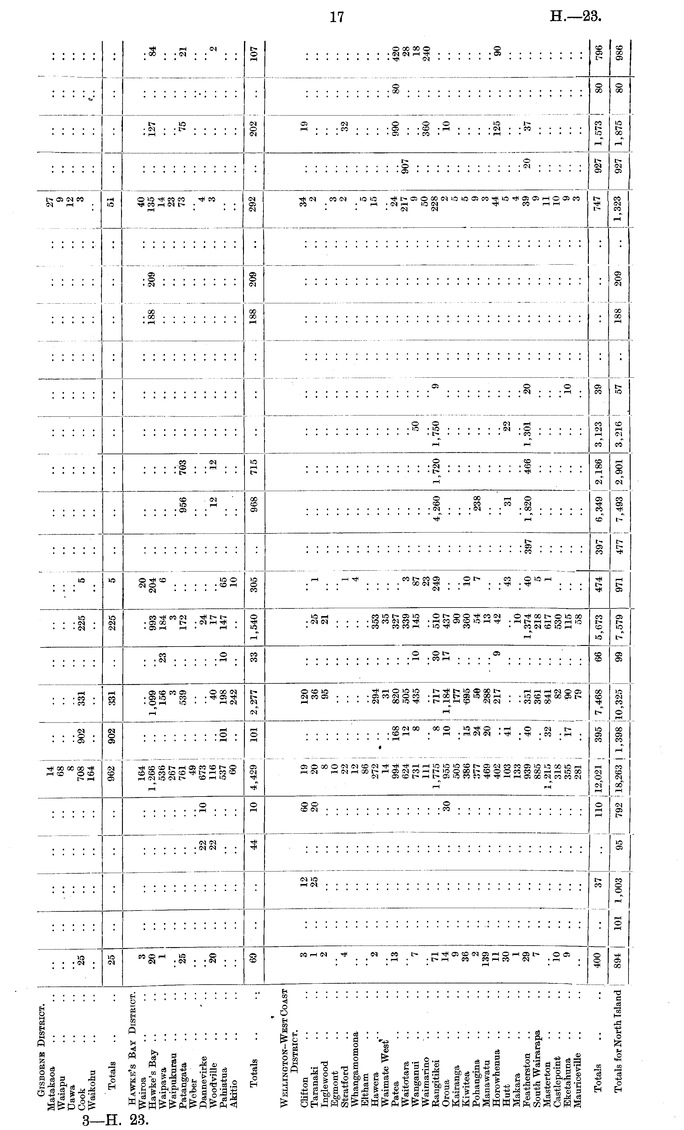 Gisborxe District. Matakaoa Waiapu Uawa Cook Waikohu 25 14 68 8 708 164 I 902 331 225 5 I I I ! 27 9 12 3 1 I i I i Totals 25 962 902 331 225 51 Hawke's Bay District. Wairoa Hawke's Bay Waipawa Waipukurau Patangata Weber Dannevirke .. ' .. Woodville Pahiatua Akitio 3 20 1 25 ■'• 164 1,266 536 267 761 49 673 116 537 60 101 1,099 156 539 23 993 184 3 172 20 204 6 956 703 I 188 209 40 135 14 23 73 i27 75 84 21 20 22 22 io 40 198 242 io 24 17 147 65 10 12 12 ! 4 3 2 I Totals .. .. 09 44 10 4,429 101 2,277 33 1,540 305 968 715 188 209 292 202 107 « ' Wellington- West Coast District. 19 20 8 10 22 12 86 272 ! 14 994 168 624 12 731 8 111 1,775 ' 8 955 10 505 386 15 377 24 469 20 402 103 41 133 939 40 885 1,215 32 318 355 17 281 120 36 95 294 31 820 505 435 717 1,184 177 695 50 288 217 351 361 ! 841 : 82 90 79 ! io 30 17 9 Clifton Taranaki Inglewood Egmont Stratford Whangamomona Eltham Hawera. Waimate West Patea Waitotara Wanganui Waimarino Eangitikei Oroua Kairanga Kiwitea Pohangina Manawatu Horowhenua Hutt Makara Peatherston South Wairarapa Masterton Castlepoint Eketahuna Mauriceville 3 1 2 12 25 60 20 •' 34 2 19 25 21 1 " •• ! "3 2 •• ■• 1 4 .. 4 • • 32 2 353 35 327 339 145 " 5 15 •■ i3 7 71 14 9 36 2 139 11 30 1 29 7 I i I 30 510 437 90 360 54 13 42 3 87 23 249 io 7 ■- 4,260 •• 238 1,720 50 ! 1,750 J •• ■ • [ •' "9 24 217 9 50 228 2 5 5 9 3 44 5 4 39 9 11 10 9 3 907 990 360 io •• 80 .. 420 28 18 240 ■ 22 ! 125 90 10 1,374 218 617 530 115 58 43 31 ■• " 40 5 1 397 1,820 466 1,301 20 20 '37 ■ •• I io 9 I io •• -• I I I •• I -• ! • • I Totals 400 37 110 12,021 ; 395 7,468 66 5,673 474 397 6,349 ! 2,186 3,123 39 747 927 1,573 j SO 796 _. Totals for North Island — 894 101 1,003 95 792 18,263 j 1,398 10,325 99 7,579 971 j 477 7,493 J 2,901 3,216 ! 57 188 ! 209 1,323 927 1,875 SO 986