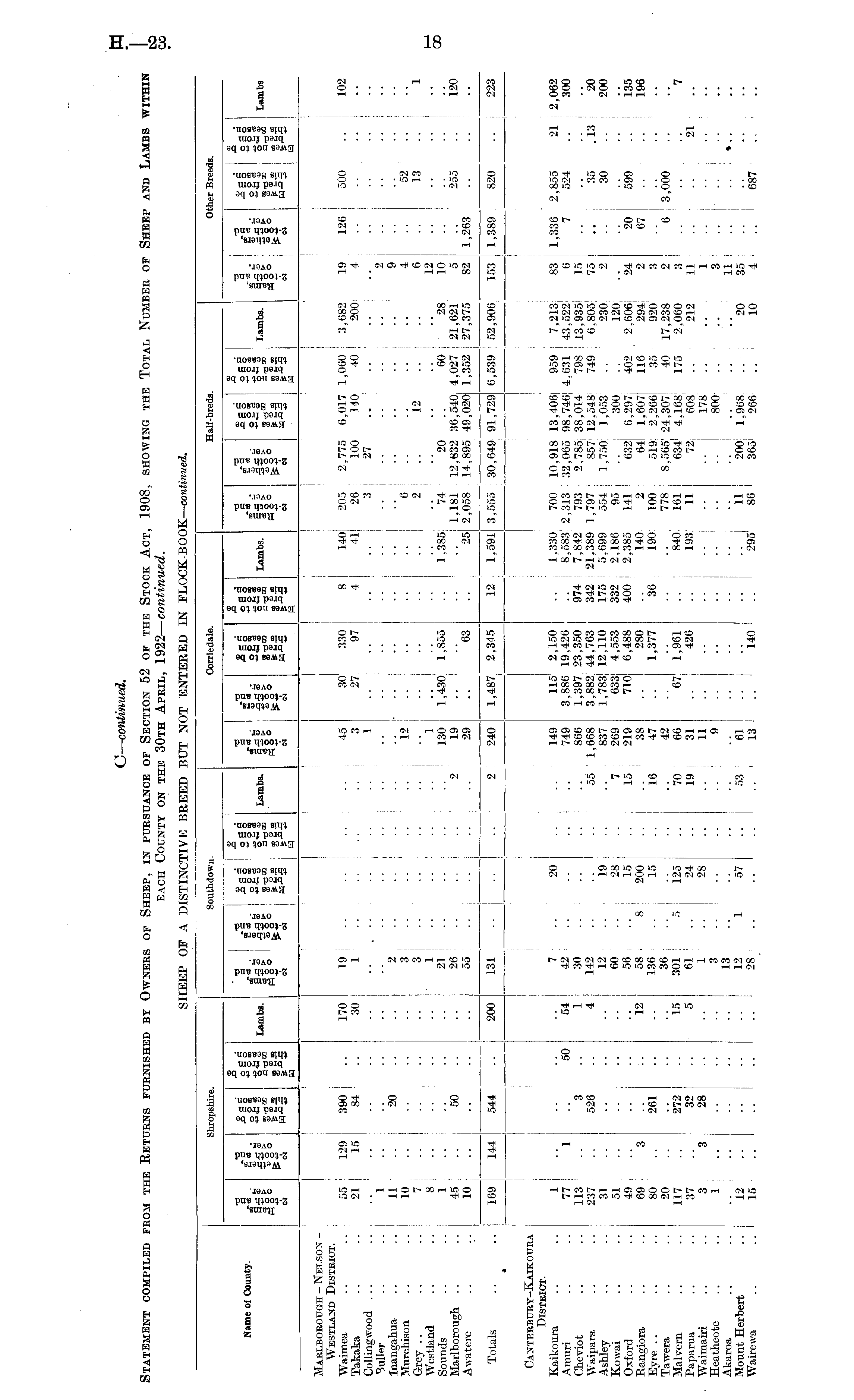 C— continued. Statement compiled from the Returns furnished by Owners of Sheep, in pursuance of Section 52 of the Stock Act, 1908, showing the Total Number of Sheep and Lambs within each County on the 30th April, 1922— continued. SHEEP OF A DISTINCTIVE BREED BUT NOT ENTERED IN FLOCK-BOOK— continued.