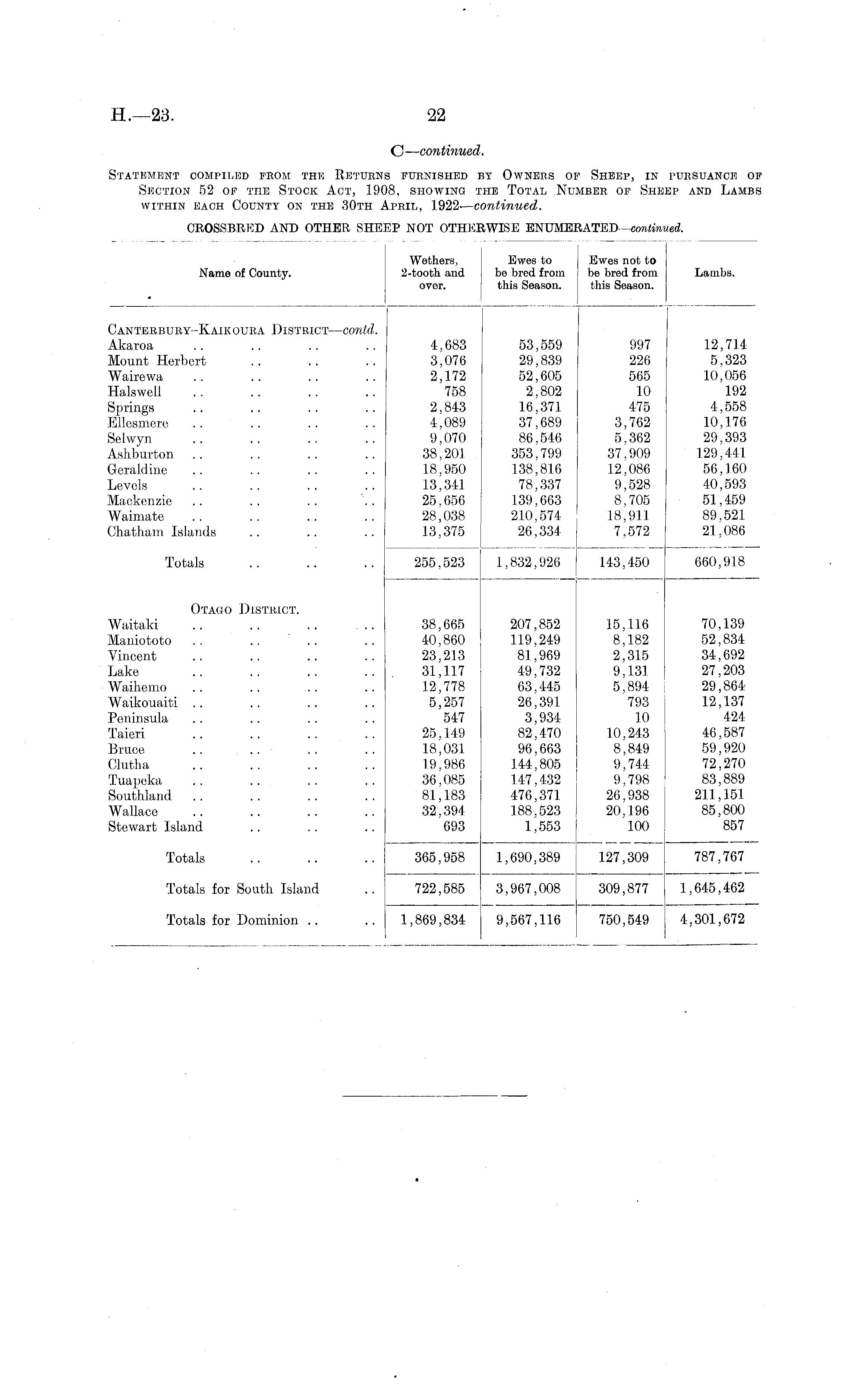 C — continued. Statement compiled from the Returns furnished by Owners of Sheep, in pursuance of Section 52 of the Stock Act, 1908, showing the Total Number of Sheep and Lambs within each County on the 30th April, 1922— continued. CROSSBRED AND OTHER SHEEP NOT OTHERWISE ENUMERATED— continued.