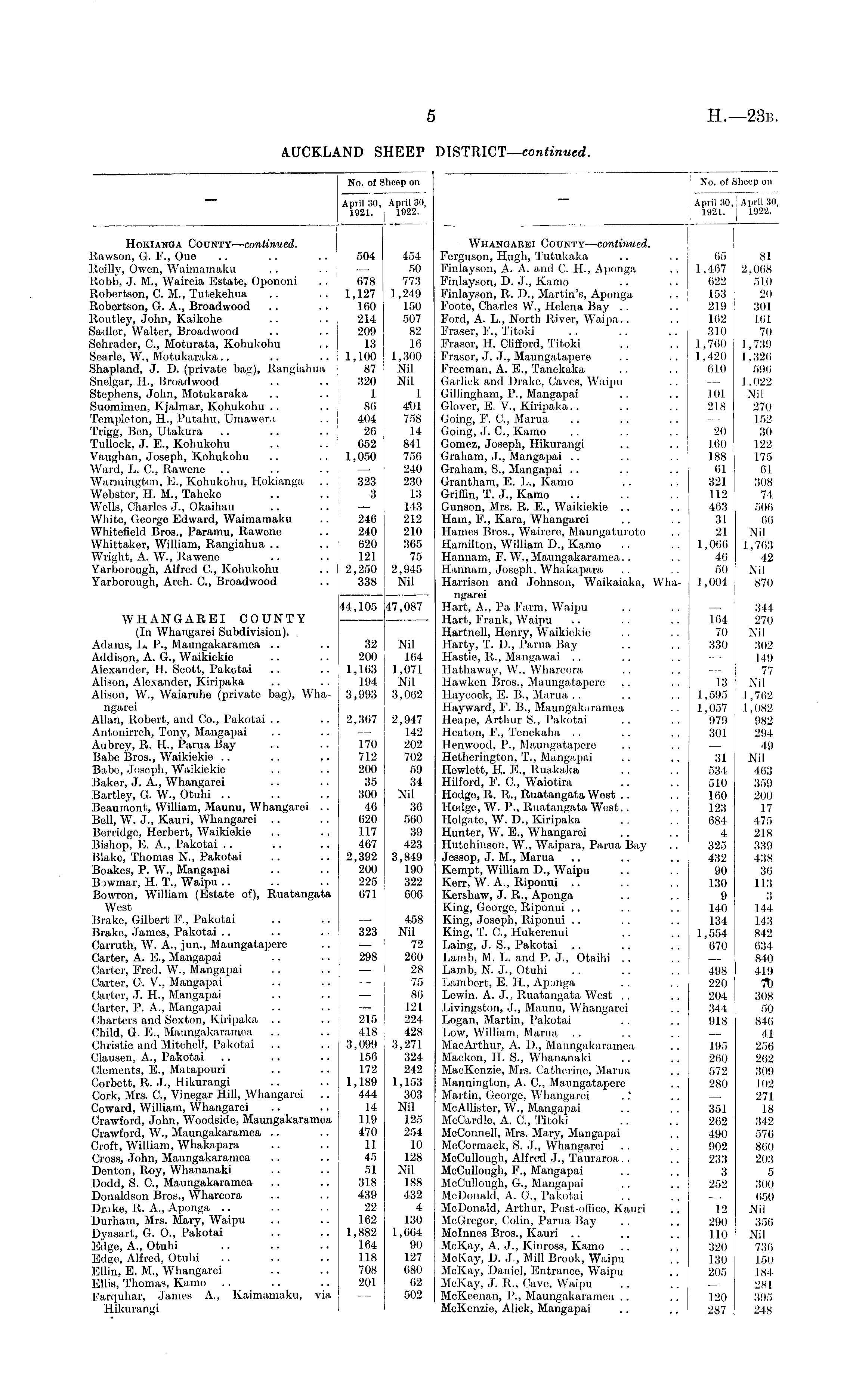 No. of Sheep on April 30,1 April 30, 1921. 1922. No. of Sheep on April 30,! April 30, 1921. | 1922. Hokianoa County— continued. Itawson, G. FT, Oue .. .. .. 504 Iteilly, Owen, Waimamaku .. Robb, J. M., Waireia Estate, Opononi . . 678 Robertson, C. M., Tutekehua .. .. 1,127 Robertson, G. A., Broadwood .. .. 160 Routloy, John, Kaikohe .. .. 214 Sadler, Walter, Broadwood .. .. 209 Schrader, ft, Moturata, Kohukohu .. 13 Searle, W., Motukaraka.. .. .. 1,100 Shapland, J. D. (private bag), Rangiahua ; 87 Snelgar, H., Broadwood .. .. 320 Stephens, John, Motukaraka .. .. 1 Suomimen, Kjalmar, Kohukohu .. .. 80 Templeton, H., Putahu, Umawera . . 404 Trigg, Ben, Utakura .. .. .. 26 Tullock, J. E., Kohukohu .. .. 652 Vaughan, Joseph, Kohukohu .. .. 1,050 Ward, L. ft, Rawene .. .. .. — Warmington, E., Kohukohu, Hokianga . . 323 Webster, II. M., Taheko .. .. 3 Wells, Charles J., Okaihau .. .. —- White, Georgo Edward, Waimamaku .. 240 Whitefield Bros., Paramu, Rawene .. 240 Whittaker, William, Rangiahua .. .. 620 Wright, A. W., Rawene .. .. 121 Yarborough, Alfred ft, Kohukohu .. 2,250 Yarborough, Arch, ft, Broadwood .. 338 454 50 773 1,249 150 507 82 16 1,300 Nil Nil 1 4'01 758 14 841 756 240 230 13 143 212 210 365 75 2,945 Nil Whangarei County— continued. Ferguson, Hugh, Tutukaka Finlayson, A. A. and C. H., Aponga Finlayson, D. J., Kamo Finlayson, R. D., Martin's, Aponga F'oote, Charles W., Helena Bay Ford, A. L., North Itiver, Waipa.. F'raser, P., Titoki Fraser, H. Clifford, Titoki Fraser, J. J., Maungatapere Freeman, A. E., Tanekaka Garlick and Drake, Caves, Waipu Gillingham, P., Mangapai Glover, E. V., Kiripaka.. Going, F. ft, Marua Going, J. ft, Kamo Gomez, Joseph, Hikurangi Graham, J., Mangapai Graham, S., Mangapai Grantham, E. L., Kamo Grillin, T. J., Kamo Gunson, Mrs. It. E., Waikiekie Ham, F., Kara, Whangarei Hames Bros., Wairore, Maungaturoto Hamilton, William D., Kamo Hannam, F. W., Maungakaramea.. Hannam, Joseph, Whakapara Harrison and Johnson, Waikaiaka, Whangarei Hart, A., Pa F'arm, Waipu Hart, F'rank, Waipu Hartnell, Henry, Waikiekie Harty, T. I)., Parua Bay Hastie, It., Mangawai Hathaway, W., Whareora Hawken Bros., Maungatapere Hayoock, E. B,, Marua Hayward, F. B., Maungakaramea Heape, Arthur S., Pakotai Heaton, F., Tcnekaha Henwood, P., Maungatapere Hctherington, T., Mangapai Hewlett, H. E., Buakaka Hilford, F'. ft, Waiotira Hodge, R. R., Ruatangata West Hodge, W. P., Ruatangata West.. Holgate, W. D., Kiripaka Hunter, W. E., Whangarei Hutchinson, W., Waipara, Parua Bay Jessop, J. M., Marua Kempt, William D., Waipu Kerr, W. A., Riponui Kershaw, J. R., Aponga King, Goorgo, Riponui King, Joseph, Riponui King, T. ft, Hukeronui Laing, J. S., Pakotai Lamb, M. L. and P. J., Otaihi .. Lamb, N. J., Otuhi Lambert, E. TL, Aponga Lewin. A. J., Ruatangata West Livingston, J., Maunu, Whangarei Logan, Martin, Pakotai Low, William, Mania MacArthur, A. I)., Maungakaramea Macken, H. S., Whananaki MacKenzie, Mrs. Catherine, Marua Mannington, A. ft, Maungatapere Martin, George, Whangarei McAllister, W., Mangapai McCardle, A. ft, Titoki McConnell, Mrs. Mary, Mangapai McCormack, S. J., Whangarei McCullough, Alfred J., Tauraroa.. McCullough, F., Mangapai McCullough, G., Mangapai MoDonald, A. G, Pakotai McDonald, Arthur, Post-offico, Kauri McGregor, Colin, Parua Bay Mclnnes Bros., Kauri McKay, A. J., Kinross, Kamo McKay, D. J., Mill Brook, Waipu McKay, Daniel, Entrance, Waipu McKay, J. R., Cave, Waipu McKeenan, P., Maungakaramea McKenzie, Alick, Mangapai 65 1,467 622 153 219 162 310 1,760 1,420 610 101 218 20 160 188 61 321 112 463 31 21 1,066 46 50 1,004 81 2,068 510 20 301 1.61 70 1,739 1,326 596 1 ,022 Nil 270 152 30 122 175 01 308 74 506 66 Nil 1,763 42 Nil 870 44,105 WHANGAREI COUNTY (In Whangarei Subdivision). Adams, L. P., Maungakaramoa .. .. 32 Addison, A. G., Waikiekie .. .. 200 Alexander, H. Scott, Pakotai .. .. 1,103 Alison, Alexander, Kiripaka .. .. I 194 Alison, W., Waiaruhe (privato bag), Wha- 3,993 ngarei Allan, Robert, and Co., Pakotai .. .. 2,367 Anfonirrch, Tony, Mangapai .. .. —• Aubrey, R. H., Parua Bay .. .. 170 Babe Bros., Waikiekie .. .. .. 712 Babe, Joseph, Waikiekie . . . . 200 Baker, J. A., Whangarei .. .. 35 Bartley, G. W., Otuhi .. .. .. 300 Beaumont, William, Maunu, Whangarei .. 46 Bell, W. J., Kauri, Whangarei .. .. 620 Bcrridge, Herbert, Waikiekio .. .. 117 Bishop, E. A., Pakotai .. .. .. 467 Blake, Thomas N., Pakotai .. .. 2,392 Boakes, P. W., Mangapai .. .. 200 Bowmar, H. T., Waipu .. .. .. 225 Bowron, William (Estate of), Ruatangata 671 Wost Brake, Gilbert F'., Pakotai .. .. — Brake, James, Pakotai .. .. .. 323 Carruth, W. A., jun., Maungatapere .. — Carter, A. E., Mangapai .. .. 298 Carter, Fred. W., Mangapai .. .. — Carter, G. V., Mangapai .. .. — Carter, J. H., Mangapai .. .. — Carter, P. A., Mangapai .. .. — Charters and Sexton, Kiripaka .. .-. 215 Child, G. E., Maungakaramea .. .. 418 Christie and Mitchell, Pakotai .. .. 3,099 Clausen, A., Pakotai .. .. .. 156 Clements, E., Matapouri .. .. 172 Corbett, R. J., Hikurangi .. .. 1,189 Cork, Mrs. ft, Vinegar Hill, Whangarei .. 444 Coward, William, Whangarei .. .. 14 Crawford, John, Woodside, Maungakaramea 119 Crawford, W., Maungakaramea .. .. 470 Croft, William, Whakapara .. .. 11 Cross, John, Maungakaramea .. .. 45 Denton, Roy, Whananaki .. .. 51 Dodd, S. ft, Maungakaramoa .. .. 318 Donaldson Bros., Whareora .. . . 439 Drake, R. A., Aponga .. .. . . 22 Durham, Mrs. Mary, Waipu .. .. 162 Dyasart, G. O., Pakotai .. .. 1,882 Edge, A., Otuhi . ■ • • • • 164 Edge, Alfred, Otuhi .. .. .. 118 Ellin, E. M., Whangarei .. .. 708 Ellis, Thomas, Kamo .. .. .. 201 Farquhar, James A., Kaimamaku, via —■ Hikurangi 44,105 47,087 164 70 330 344 270 Nil 302 149 77 Nil 1,762 1,082 982 294 49 Nil 463 359 200 17 475 218 339 438 36 113 3 144 143 842 634 840 419 1t) 308 50 846 41 256 262 309 102 271 18 342 576 860 203 5 300 650 Nil 356 Nil 736 150 184 281 395 248 32 200 1,163 194 3,993 Nil 164 1,071 Nil 3,002 13