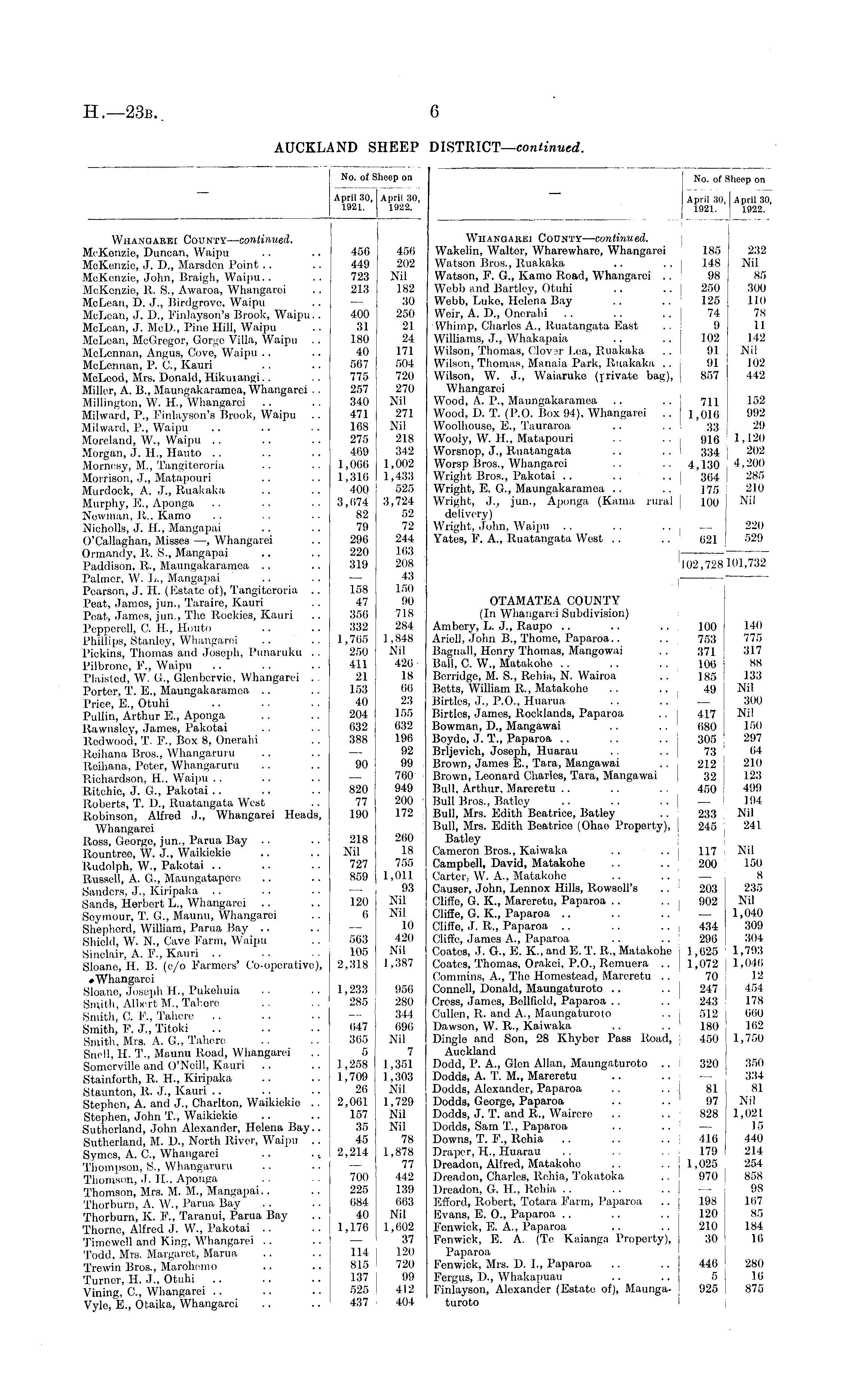 No. of Sheop on April 30, April 30, 1921. 1922. No. of Sheep on April 30, April 30 1921. 1922. Whangarei County— continued. McKouzie, Duncan, Waipu McKenzie, J. D., Marsden Point McKenzie, John, Braigh, Waipu.. McKenzie, It. S., Awaroa, Whangarei McLean, D. J., Birdgrovo, Waipu McLean, J. D., Finlayson's Brook, Waipu.. McLean, J. McD., Pine Hill, Waipu McLoan, McGregor, Gorgo Villa, Waipu . . McLonnan, Angus, Cove, Waipu McLennan, P. ft, Kauri McLeod, Mrs. Donald, Hikuiangi.. Miller, A. B., Maungakaramea, Whangarei . . Millington, W. H., Whangarei Milward, P., Finlayson's Brook, Waipu Mil ward, P., Waipu Moreland, W., Waipu Morgan, J. H., Hauto Morncsy, M., Tangiteroria Morrison, J., Matapouri Murdock, A. J., Ruakaka Murphy, FT, Aponga Newman, it.. Kamo Nicholls, J. H., Mangapai O'Callaghan, Misses —, Whangarei Ormandy, It. S., Mangapai Paddison, R., Maungakaramea Palmer, W. L., Mangapai Pearson, J. H. (Estate of), Tangiteroria .. Peat, Jamos, jun., Taraire, Kauri Peat, James, jun., The Rockies, Kauri Pepperell, C. H., Houto Phillips, Stanloy, Whangarei Piokins, Thomas and Joseph, Punaruku . . Pilbrone, F., Waipu Plaistcd, W. G., Glenbcrvie, Whangarei . . Portor, T. E., Maungakaramoa Price, E., Otuhi Pullin, Arthur E., Aponga Rawnsley, James, Pakotai Redwood, T. P., Box 8, Onerahi Reihana Bros., Whangaruru Reihana, Peter, Whangaruru Riohardson, IL. Waipu Ritchie, J. G, Pakotai Roberts, T. D., Ruatangata West Robinson, Alfred J., Whangarei Heads, Whangarei Ross, George, jun., Parua Bay Itountreo, W. J., Waikiekie Rudolph, W., Pakotai Russell, A. G, Maungatapere Sanders, J., Kiripaka Sands, Herbert L., Whangarei Soymour, T. G, Maunu, Whangarei Shepherd, William, Parua Bay Shield, W. N., Cave Farm, Waipu Sinclair, A. F., Kauri Sloano, H. B. (e/o Farmers' Co-oporativo), ♦Whangarei Sloano, Joseph IL, Pukehuia Smith, Albert M., Tahere Smith, C. P., Tahcre Smith, F. J., Titoki Smith. Mrs. A. G, Tahcre Snell, H. T., Maunu Boad, Whangarei Somerville and O'Noill, Kauri Stainforth, R. H., Kiripaka Staunton, It. J., Kauri Stephen, A. and J., Charlton, Waikiekie . . Stephen, John T, Waikiekie Sutherland, John Aloxandor, Helena Bay.. Sutherland, M. I)., North River, Waipu .. Symes, A. ft, Whangarei .. . i Thompson, S., Whangaruru Thomson, .1. II., Aponga Thomson, Mrs. M. M., Mangapai.. Thorbum, A. W., Parua Bay Thorburn, K. FT, Taranui, Parua Bay Thorne, Alfred J. W., Pakotai Timewell and King, Whangarei Todd, Mrs. Margaret, Marua Trewin Bros., Marohemo Turner, H. J., Otuhi Vining, ft, Whangarei Vyle, E., Otaika, Whangarei 456 449 723 213 400 31 180 40 567 775 257 340 471 168 275 469 1,066 1,316 400 3,674 82 79 296 220 319 456 202 Nil 182 30 250 21 24 171 504 720 270 Nil 271 Nil 218 342 1,002 1,433 525 3,724 52 72 244 163 208 43 150 90 718 284 1,848 Nil 42018 66 23 155 632 196 92 99 760 949 200 172 Whangarei County— continued. Wakelin, Walter, Wharewhare, Whangarei 185 232 Watson Bros., Ruakaka .. . . j 148 Nil Watson, F. G, Kamo Road, Whangarei .. 98 85 Webb and Bartley, Otuhi .. .. | 250 300 Webb, Luke, Helena Bay .. .. 125 110 Weir, A. D., Onerahi . . .. .. j 74 78 Whimp, Charles A., Ruatangata East .. 9 11 Williams, J., Whakapaia .. .. 102 142 Wilson, Thomas, Olovur Lea, Ruakaka . . 91 Nil Wilson, Thomas, Manaia Park, Ruakaka .. 91 102 Wilson, W. J., Waiaruke (private bag), j 857 442 Whangarei Wood, A. P., Maungakaramea .. .. 711 152 Wood, D. T. (P.O. Box 94), Whangarei .. 1,016 992 Woolhouse, E., Tauraroa .. .. 33 29 Wooly, W. H., Matapouri .. .. j 916 1,120 Worsnop, J., Ruatangata .. .. | 334 j 202 Worsp Bros., Whangarei .. .. 4,130 4,200 Wright Bros., Pakotai .. .. .. 364 285 Wright, E. G, Maungakaramoa .. .'. 175 210 Wright, J., jun., Aponga (Kama rural | 100 Nil delivery) Wright, John, Waipu . . .. ■ • — 22 ° Yates, F. A., Ruatangata West .. .. 621 529 102,728101,732 158 47 356 332 1,765 250 411 21 153 40 204 632 388 OTAMATEA COUNTY (In Whangarei Subdivision) Ambery, L. J., Raupo .. .. .. 100 140 Aricll, John B., Thome, Paparoa.. .. 753 775 Bagnall, Henry Thomas, Mangowai .. 371 317 Ball, C. W., Matakoho .. .. .. 106 88 Borridge, M. S., Rchia, N. Wairoa .. 185 133 Botts, William It., Matakoho .. .. 49 Nil Birtles, J., P.O., Huarua .. .. — 300 Birtles, James, ltocklands, Paparoa . . j 417 Nil Bowman, D., Mangawai .. .. 680 150 Boydo, J. T„ Paparoa .. .. .. j 305 297 Brljevich, Joseph, Huarau .. .. ! 73 64 Brown, James E., Tara, Mangawai . . . 212 j 210 Brown, Leonard Charles, Tara, Mangawai 32 123 Bull, Arthur, Mareretu . . .. . . 450 499 Bull Bros., Batley .. .. .. — 194 Bull, Mrs. Edith Beatrice, Batley .. 233 Nil Bull, Mrs. Edith Beatrice (Ohao Property), I 245 j 241 Batley Camoron Bros., Kaiwaka . . .. 117 Nil Campbell, David, Matakohe .. .. 200 150 Carter, W. A., Matakohe . . .. — I 8 Causer, John, Lennox Hills, Rowsell's .. 203 235 Cliffe, G. K, Mareretu, Paparoa .. ... 902 Nil Cliffe, G. K., Paparoa .. .. .. _ 1,040 Cliffe, J. R., Paparoa .. .. .. , 434 309 Cliffe, James A., Paparoa .. .. 296 304 Coates, J. G., E. K, and E.'P. It., Matakohe 1,625 ' 1,793 Coates, Thomas, Orakei, P.O., Rcmucra .. 1,072 1,046 Commins, A., The Homestead, Mareretu .. 70 12 Connell, Donald, Maungaturoto .. .. I 247 454 Cross, James, Bclllichl, Paparoa .. .. 243 178 Cullcn, R. and A., Maungaturoto .. 1 512 060 Dawson, W. R., Kaiwaka .. .. 180 162 Dinglo and Son, 28 Khybor Pass Road, I 450 1,750 Auckland Dodd, P. A., Glon Allan, Maungaturoto .. I 320 350 Dodds, A. T. M., Mareretu .. .. j — 334 Dodds, Alexander, Paparoa .. ... 81 81 Dodds, George, Paparoa .-. .. j 97 Nil Dodds, J. T. and R., Wairere .. .. 828 1,021 Dodds, Sam T, Paparoa .. .. j — 15 Downs, T. I'., Rehia .. .. .. 416 440 Draper, H., Huarau . . .. .. 179 214 Dreadon, Alfred, Matakoho .. .. 1,025 254 Dreadon, Charles, Rehia, Tokatoka .. 970 858 Dreadon, G. H., Rchia .. .. .. — 98 Efford, Robert, Totara F'arm, Paparoa .. 198 167 Evans, E. O., Paparoa .. .. .. 120 85 Fenwick, E. A., Paparoa .. .. 210 184 Fenwick, E. A. (T
