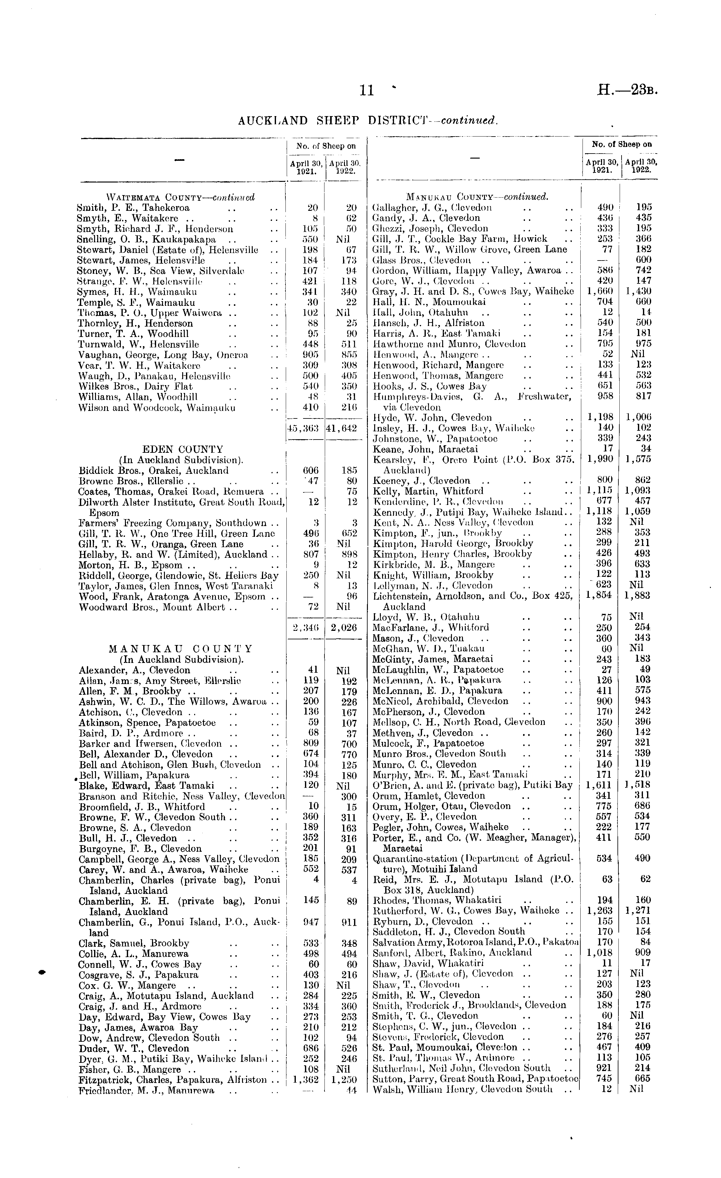No. of Sheep on April 30, April 30. 1921. 1922. No. of Sheep on April 30, I April 30, 1921. 1922. Waitemata County— continued Smith, P. FT, Tahokoroa Smyth, E., Waitakere Smyth, Richard J. P., Henderson Snelling, O. B., Kaukapakapa Stewart, Daniel (Estate of), Helensville Stewart, James, Helensville Stonoy, W. B., Sea View, Silverdale Strange, F, W., Helensville Symes, II. H., Waimauku Temple, S. F\, Waimauku Thomas, P. O., Upper Waiwera Thornley, H., Henderson Turner, T. A., Woodhill Turnwald, W., Helensville Vaughan, George, Long Bay, Oneroa Year, T. W. H,, Waitakere Waugh, IX, Panakau, Helensville Wilkes Bros., Dairy Flat Williams, Allan, Woodhill Wilson and Woodcock, Waimauku EDEN COUNTY (In Auckland Subdivision). Biddiok Bros., Orakei, Auckland Browne Bros., Ellerslie Coates, Thomas, Orakei Road, Remuera .. Dilworth Alster Institute, Great South Road,! Epsom Farmers' Freezing Company, Southdown . . Gill, T. It. W., One Tree Hill, Green Lano Gill, T. R. W., Oranga, Green Lane Hellaby, R. and W. (Limited), Auckland . . Morton, H. B., Epsom Riddoll, Goorge, Glendowio, St. Heliers Bay Taylor, Jamos, Glen Innes, West Taranaki Wood, F'rank, Aratonga Avenue, Epsom .. Woodward Bros., Mount Albert MANUKAU COUNTY (In Auckland Subdivision). Alexander, A., Clevedon Allan, Jam: s. Amy Street, Ellerslie Allen, FT M , Brookby Ashwin, W. C. IX, The Willows, Awaroa .. Atchison, ft, Clevedon .. Atkinson, Spence, Papatoetoe Baird, D. P., Ardmore Barker and Ifwersen, Clovodon .. Boll, Alexander D., Clevedon Boll and Atchison, Glen Bush, Clevedon . . , Bell, William, Papakura Blake, Edward, East Tamaki Branson and Ritchie. Ness Valley, Clevedon Broomfield, J. B., Whitford Browne, F. W., Clevedon South Browne, S. A,, Clevedon .. Bull, H. J., Clevedon Burgoyne, F. B., Clevedon .. .. i Campboll, George A., Ness Valley, Clevedon Carey, W. and A., Awaroa, Waiheke Chamberlin, Charles (private bag), Ponui Island, Auckland Chamberlin, E. H. (private bag), Ponui Island, Auckland Chamberlin, G., Ponui Island, P.O., Auckland Clark, Samuel, Brookby Collie, A. li., Manurewa Connell, W. J., Cowos Bay Cosgrave, S. J., Papakura Cox. G. W., Mangere Craig, A., Motutapu Island, Auckland Craig, J. and H., Ardmore Day, Edward, Bay View, Cowes Bay Day, James, Awaroa Bay Dow, Andrew, Clevedon South Duder, W. T., Clevedon Dyer, G. M., Putiki Bay, Waiheke Island .. Fisher, G. B., Mangere Fitzpatrick, Charles, Papakura, Alfriston . . Fricdlander, M. J., Manurewa 20 8 105 550 198 184 107 421 341 30 102 88 95 448 905 309 500 540 48 41.0 +5,363 606 47 12 3 496 36 807 9 250 8 72 2,346 20 62 50 Nil 67 173 94 118 340 22 Nil 25 90 511 855 308 405 350 31 21.6 41,642 185 80 75 12 3 652 Nil 898 12 Nil 13 96 Nil 2,026 Manukau County— continued. Gallagher, J. G, Clovedon Gandy, J. A., Clevedon Ghezzi, Joseph, Clevedon Gill, J. T., Cockle Bay Farm, Howick Gill, T. It. W., Willow Grove, Green Lane Glass Bros., Clevedon Gordon, William, Happy Valley, Awaroa .. Gore, W. J., Clovedon Gray, J. H. and IX S., Cowes Bay, Waiheke Hall, 11. N., Moumoukai Hall, John, Otahuhu llansch, J. H., Alfriston Harris, A. R., East Tamaki Hawthorne and Munro, Clevedon Henwood, A., Mangere Henwood, Richard, Mangere Henwood, Thomas, Mangere Hooks, J. S., Cowes Bay Hiimphrcys-Davios, G. A., Freshwater, via Clevedon Hyde, W. John, Clevedon Insley, IT. J., Cowes Bay, Waiheke Johnstone, W., Papatoetoe Keane, John, Maraetai Kearslcy, F, Orcro Point (P.O. Box 375. Auckland) Keeney, J., Clevedon Kelly, Martin, Whitford Kenderdine, P. R., Clevedon .. .. Kennedy. J., Putipi Bay, Waiheke Island.. Kent, N. A.. Ness Valley, Clevedon Kimpton, P., jun., Brookby .. Kimpton, Harold George, Brookby .. i Kimpton, Henry Charles, Brookby Kirkbride, M. B., Mangere Knight, William, Brookby Lellyman, N. J., Clevedon Lichtenstein, Arnoldson, and Co., Box 425, Auckland Lloyd, W. B., Otahuhu MacFarlane, J., Whitford Mason, J., Clevedon . . .. Median, W. I)., Tuakau .. MoGinty, James, Maraetai McLaughlin, W., Papatoetoe .. McLennan, A. I!.. Papakura .. McLennan, E. IX, Papakura .. McNicol, Archibald, Clevodon .. McPherson, J., Clevodon .. Mellsop, C. IL, North Boad, Clevedon Methven, J., Clevedon .. .. Mulcook, F'., Papatootoe .. Munro Bros., Clevedon South Munro, C. ft, Clevodon Murphy, Mrs. E. M.. Easl Tamaki O'Brien, A. and li. (private bag), Putiki Bay Orum, Hamlet, Clovodon Orum, Holger, Otau, Clevedon .. I Ivery, IT P., I llevedon Peglor, John, Cowos, Waiheke Porter, E., and Co. (W. Moagher, Manager), Maraetai Quarantine-station (Department of Agriculture), Motuihi Island Reid, Mrs. E. J., Motutapu Island (P.O. Box 318, Auckland) Rhodes, Thomas, Whakatiri Rutherford, W. G, Cowes Bay, Waiheke .. Ryburn, D., Clevodon Saddleton, H. J., Clevedon South Salvation Army, Rotoroa Island, P.O., Pakatoa San lord, Albert, Rakino, Auckland Shaw, David, Whakatiri Shaw, J. (Estate of), Clovedon Shaw, T., Clevodon Smith, E. W., Clevedon Smith, Frederick J., BrooklatuP, Clevedon Smith, T. G., Clevedon Stephens, C. W., jun., Clevedon Stevens, Frederiok, Clevedon St. Paul, Moumoukai, Clevedon St. Paul, Thomas W., Ardmore Sutherland, Neil John, Clovedon South Sutton, Parry, Great South Road, Pap itoetoo Walsh, William Henry, Clevedon South .. 490 436 333 253 77 586 420 1,660 704 12 540 154 795 52 133 441 651 958 1,198 140 339 17 1,990 800 1.115 677 1,118 132 288 299 426 396 122 "623 1,854 75 250 360 60 243 27 126 411 900 170 350 260 297 314 140 171 1,611 341 775 557 222 411 195 435 195 366 182 000 742 147 1,430 060 14 500 181 975 Nil 123 532 563 817 1,006 102 243 34 1,575 862 1,093 457 1,059 Nil 358 211 493 633 113 Nil 1,883 Nil 254 343 Nil 183 49 103 575 943 242 390 142 321 339 119 210 1,518 311 686 534 177 550 41 119 207 200 I 36 59 68 809 074 104 394 120 Nil 192 179 226 167 107 37 700 770 125 180 Nil 300 15 311 163 316 91 209 537 4 10 360 189 352 201 185 552 4 534 490 63 02 145 89 194 1,263 155 170 170 1,018 11 127 203 350 188 60 184 276 467 113 921 745 12 160 1,271 151 154 84 909 17 Nil 123 280 175