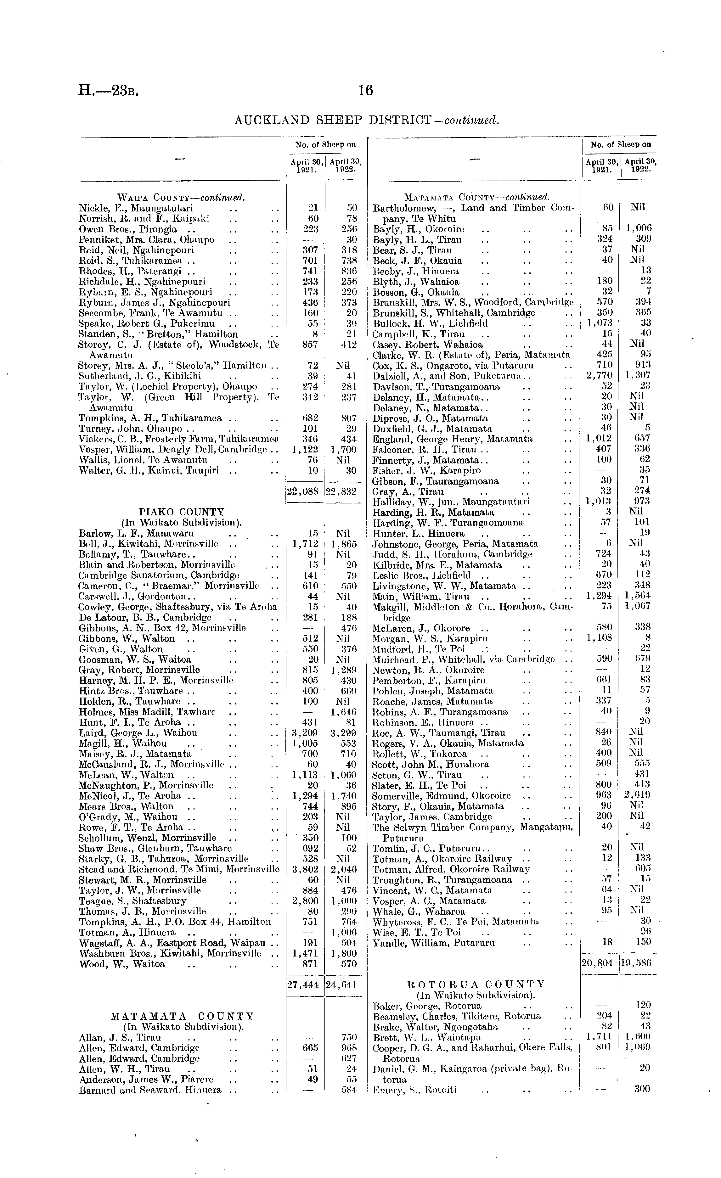 Waipa County— continued. Nickle, FT, Maungatutari Norrish, It. and P., Kaipaki Owen Bros., Pirongia Penniket, Mrs. Clara, Ohaupo Reid, Neil, Ngahinepouri Reid, S., Tuhikaramea Rhodes, H., Paterangi Richdalc, FL, Ngahinepouri Ryburn, E. S., Ngahinepouri Ryburn, James J., Ngahinepouri Seecombe, F'rank, To Awamutu Speake, Robert G, Pukorimu Standen, S., " Bretton," Hamilton Storey, C. J. (Fstate of), Woodstock, Te Awamutu Storey, Mrs. A. J., "Steele's," Hamilton . . Sutherland, J. G, Kihikihi Taylor, W. (Lochiel Property), Ohaupo Taylor, W. (Green Hill Property), Te Awamutu Tompkins, A. H., Tuhikaramea Turney, John, Ohaupo Vickers, C. B., Frosterly F'arm, Tuhikaramea Vosper, William, Peiigly Dell, Cambridge .. Wallis, Lionel, Te Awamutu Walter, G. H., Kainui, Taupiri No. of Sheep on April 30,1 April 30, 1921. | 1922. 21 50 60 ; 78 223 256 30 307 : 318 701 I 738 741 836 233 256 173 220 436 373 160 ' 20 55 30 8 I 21 857 412 Mata m ata County— continued,. Bartholomew, —, Land and Timber Com- 60 pany, Te Whitu Bayly, IL, Okoroire .. .. .. 85 Bayly, H. L., Tirau .. .. .. 324 Bear, S. J., Tirau .. .. .. 37 Beck, J. P., Okauia .. .. .. 40 Booby, J., Hinuera Blyth, J., Wahaioa .. .. .. 180 Bosson, G., Okauia .. ... .. 32 Brunskill, Mrs. W. S., Woodford, Cambridge 570 Brunskill, S., Whitehall, Cambridge .. , 350 Bullock, H. W., Lichfield .. ..11,073 Campbell, K, Tirau .. .. .. 15 Casey, Robert, Wahaioa .. .. j 44 Clarke, W. R. (Estate of), Peria, Matamata ; 425 Cox, K. S., Ongaroto, via Putaruru .. ' 710 Dalziell, A., and Son, Puketurua. . .. 2,770 Davison,'P.,-Turangamoana .. .. ! 52 Delaney, H., Matamata.. .. .. 20 Delaney, N., Matamata.. .. .. | 30 Diprose, J. O., Matamata .. .. 30 Duxfield, G. J., Matamata .. .. 46 England, George Henry, Matamata .. 1,012 Falconer, R. H., Tirau .. .. .. 407 Finnerty, J., Matamata.. .. .. 100 Fisher, J. W., Karapiro .. .. — Gibson, P., Taurangamoana .. .. 30 Gray, A., Tirau .. .. .. 32 H'alliday, W., jun., Maungatautari .. 1,013 Harding, H. R., Matamata .. .. 3 Harding, W. P., Turangaomoana .. 57 Hunter, L., Hinuera Johnstone, George, Peria, Matamata .. 6 Judd, S. IL, Horahora, Cambridge .. 724 Kilbride, Mrs. E., Matamata .. .. 20 Leslie Bros., Lichfield .. . . . . 670 Livingstone, W. W., Matamata .. .. 223 Main,' Will'am, Tirau .. .. .. 1,294 Makgill, Middleton & Co., Horahora, Cam- 75 bridge McLaren, J., Okorore .. .. .. 580 Morgan, W. S., Karapiro . . . . 1,108 Mudford, IT., Te Poi Muirhead, P., Whitehall, via Cambridge .. 590 Newton, It. A., Okoroire .. .. — Pemberton, F., Karapiro .. .. 661 Pohlcn, Joseph, Matamata .. .. 11 Roaehe, James, Matamata .. .. 337 Robins, A. F., Turangamoana .. .. 40 Robinson, E., Hinuora .. — Roe, A. W., Taumangi, Tirau .. .. 840 Rogers, V. A., Okauia, Matamata . . 26 Rollett, W., Tokoroa .. .. .. 400 Scott, John M., Horahora .. .. 509 Seton, G. W., Tirau Slater, E. H., Te Poi .. .. .. 800 Somerville, Edmund, Okoroire .. .. 963 Story, F., Okauia, Matamata .. .. 96 Taylor, James, Cambridge .. .. 200 The Selwyn Timber Company, Mangatapu, 40 Putaruru Tomlin, J. ft, Putaruru.. .. .. 20 Totman, A., Okoroire Railway • • ■. 12 Totman, Alfred, Okoroire Railway Troughton, R., Turangamoana .. .. 57 Vincent, W. ft, Matamata .. .. 64 Vosper, A. ft, Matamata .. .. 13 Whale, G., Waharoa .. .. .. 95 Whytcross, F. ft, Te Poi, Matamata Wise. E. T., To Poi Yandle, William, Putaruru .. .. 18 20.804 No. of Sheep on April 30, April 30, 1921. 1922. Nil 1,006 309 Nil Nil 13 22 7 394 365 33 40 Nil 95 913 1,307 23 Nil Nil Nil 5 657 336 62 35 71 274 973 Nil 101 19 Nil 43 40 112 348 1,504 1,067 72 Nil 39 : 41 274 281 342 ' 237 682 807 101 29 346 434 1,122 1,700 76 Nil 10 i 30 PIAKO COUNTY (In Waikato Subdivision). Barlow, L. F., Manawaru Bell, J., Kiwitahi, Morrinsville Bellamy, T., Tauwhare.. Blain and Robertson, Morrinsville . .. Cambridge Sanatorium, Cambridge Cameron, ft, " Braemar," Morrinsville Carswell, J., Gordonton.. Cowley, George, Shaftesbury, via Te Aroha De Latour, B. B., Cambridge Gibbons, A. N., Box 42, Morrinsville Gibbons, W., Walton Given, G., Walton Goosman, W. S., Waitoa Gray, Robert, Morrinsville Harney, M. H. P. E., Morrinsvillo Hintz Bros., Tauwhare Holden, R., Tauwhare Holmes, Miss Madill, Tawhare Hunt, F. I., To Aroha Laird, George L., Waihou Magill, H., Waihou Maiscy, R. J., Matamata McCausland, R. J., Morrinsville McLean, W., Walton McNaughton, P., Morrinsvillo McNicol, J., Te Aroha Mears Bros., Walton O'Grady, M., Waihou Rowe, F. T., Te Aroha Scholium, Wenzl, Morrinsville Shaw Bros., Glcnburn, Tauwhare Starky, G. B., Tahuroa, Morrinsville Stead and Richmond, Te Mimi, Morrinsville Stewart, M. R., Morrinsville Taylor, J. W., Morrinsville Teaguc, S., Shaftesbury Thomas, J. B„ Morrinsvillo Tompkins, A. H., P.O. Box 44, Hamilton Totman, A., Hinuera Wagstaff, A. A., Eastport Road, Waipau .. Washburn Bros., Kiwitahi, Morrinsvillo .. Wood, W., Waitoa 22,088 122,832 15 Nil 1,712 I 1,865 91 j Nil 15 ' 20 141 i 79 610 i 550 44 Nil 15 ! 40 281 ', 188 476 512 Nil 550 376 20 Nil 815 1,289 805 430 400 660 100 Nil — 1,646 431 81 3,209 3,299 1,005 553 700 710 60 40 1,113 1,060 20 36 1,294 1,740 744 895 203 Nil 59 Nil " 350 100 092 52 528 Nil 3,802 2,046 60 Nil 884 476 2,800 1,000 80 290 751 764 1.000 191 504 1,471 1,800 871 570 338 8 22 679 12 83 57 5 9 20 Nit Nil Nil 555 431 413 2,619 Nil Nil 42 Nil 133 605 15 Nil 22 Nil 30 96 150 It () T O R U A CO UN T Y (In Waikato Subdivision). Baker, George, Rotorua Beamslcy, Charles, Tikitere, Rotorua .. 204 Brake, Walter, Ngongotaha .. .. 82 Brett, W. L., Waiotapu .. .. 1 ,711 Cooper, D. G. A., and Raharhui, Okere Falls, 801 Rotorua Daniel, G. M., Kaingaroa (private bag), Rotorua Kmery, S., Rotoiti .. .. ... 20,804 19,586 27,444 24,641 MATAMATA COUNTY (In Waikato Subdivision). Allan, J. S., Tirau Allen, Edward, Cambridge Allen, Edward, Cambridge Allen, W. H., Tirau Anderson, James W., Piarere Barnard and Seaward, Hinuera 750 968 627 24 55 584 204 82 1,711 801 120 22 43 1,600 1.069 66