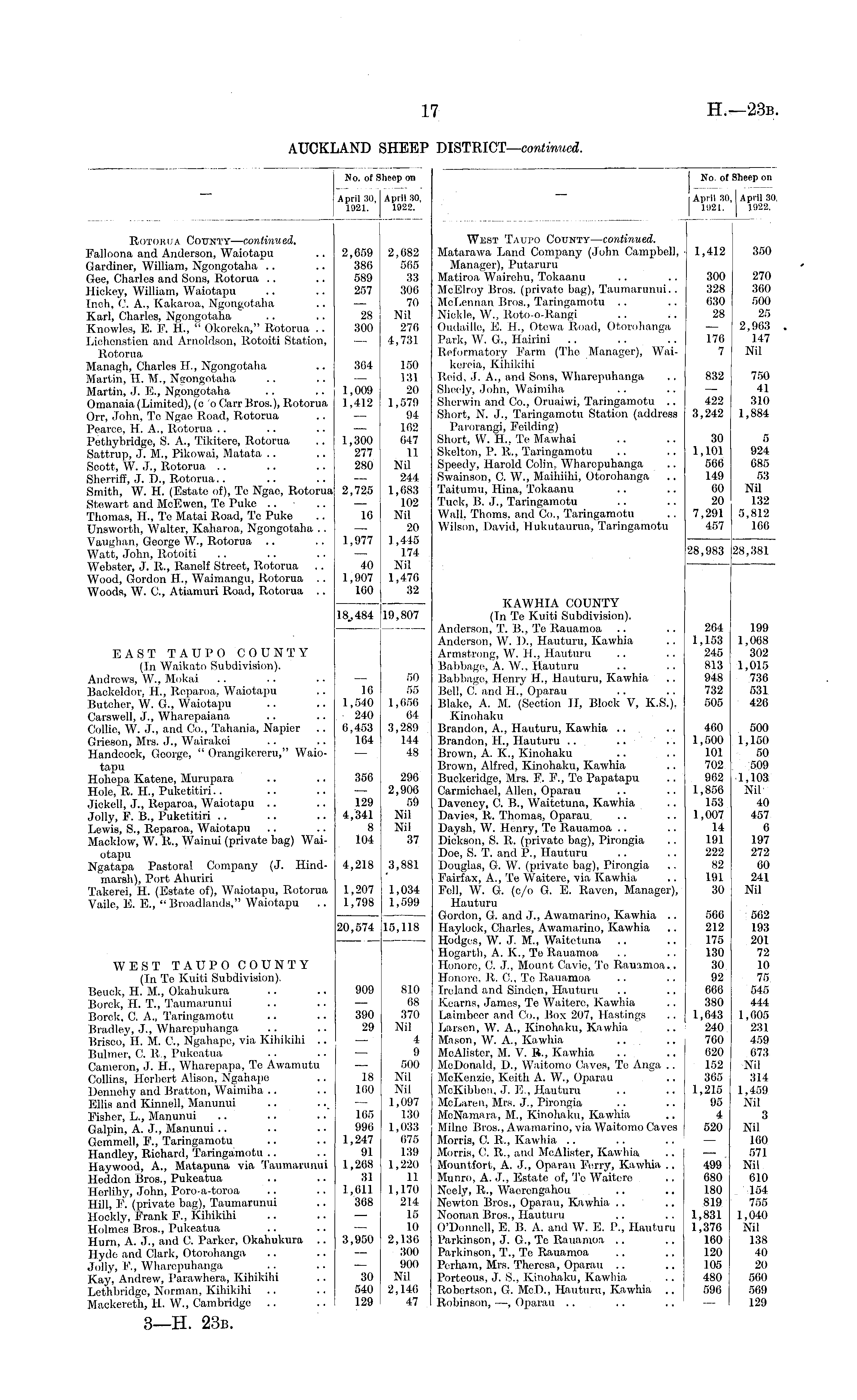 No. of! April 30, 1921. Sheop on April 30, 1922. I No. of ! I April 30, 1921. Sheep on I April 30, 1922. Rotorua County—con,ri)mecJ. Falloona and Anderson, Waiotapu Gardinor, William, Ngongotaha Gee, Charles and Sons, Rotorua Hickey, William, Waiotapu Inch, C. A., Kakaroa, Ngongotaha Karl, Charles, Ngongotaha Knowles, E. F. TL, " Okoroka," Rotorua .. Liohonstien and Arnoldson, Rotoiti Station, Rotorua Managh, Charles If., Ngongotaha Martin, H. M., Ngongotaha Martin, J. E., Ngongotaha Omanaia (Limited), (c o Carr Bros.), Rotorua Orr, John, To Ngao Road, Rotorua Pearce, H. A., Rotorua Pcthybridge, S. A., Tikitere, Rotorua Sattrup, J. M., Pikowai, Matata Scott, VV. J., Rotorua ShorrifT, J. D., Rotorua.. Smith, W. H. (Estate of), To Ngac, Rotorua Stewart and MeEwen, Te Puke Thomas, H., Te Matai Road, Te Puke Unsworth, Walter, Kaharoa, Ngongotaha .. Vaughan, Georgo W., Rotorua Watt, John, Rotoiti Webster, J. It., Itanelf Street, Rotorua Wood, Gordon H., Waimangu, Rotorua .. Woods, W. ft, Atiamuri Road, Rotorua .. 2,659 386 589 257 28 300 364 1,009 1,412 2,682 565 33 306 70 Nil 276 4,731 150 131 20 1,579 94 162 647 11 Nil 244 1,683 102 Nil 20 1,445 174 Nil 1,476 32 West Taupo County— continued. Matarawa Land Company (John Campbell, Manager), Putaruru Matiroa Wairehu, Tokaanu McElroy Bros, (privato bag), Taumarunui.. McLennan Bros., Taringamotu .. Nickle, W., Roto-o-Rangi Oudaille, li. 11., Otewa Road, Otorohanga Park, W. G„ Hairini Iteformatory F'arm (The Manager), Waikereia, Kihikihi Reid, .1. A., and Sons, Wharepuhanga Sheely, John, Waimiha Shcrwin and Co., Oruaiwi, Taringamotu .. Short, N. J., Taringamotu Station (address Parorangi, Foilding) Short, VV. H., To Mawhai Skelton, P. R., Taringamotu Speedy, Harold Colin, Wharepuhanga Swainson, C. W., Maihiihi, Otorohanga Taitumu, ilina, 'Tokaanu Tuck, B. J., Taringamotu Wall. Thorns, and Co., Taringamotu Wilson, David, llukutaurua, Taringamotu 1,412 300 328 630 28 176 7 832 422 3,242 350 270 360 500 25 2,963 147 Nil 750 41 310 1,884 1,300 277 280 2,725 30 1,101 566 149 60 20 7,291 457 5 924 685 53 Nil 132 5,812 166 10 1,977 40 1,907 160 28,983 28,381 EAST TAUPO COUNTY (In Waikato Subdivision). Andrews, W., Mokai Baokeldor, H., Reparoa, Waiotapu Butcher, W. G., Waiotapu Carswell, J., Wliarepaiana Collie, W. J., and Co., Tahania, Napier Grieson, Mrs. J., Wairakei Handoock, George, " Orangikoreru," Waiotapu Hohopa Kateno, Murupara Hole, R. IL, Puketitiri.. Jiekell, J., Reparoa, Waiotapu Jolly, F. B., Puketitiri Lewis, S., Reparoa, Waiotapu Macklow, W. It., Wainui (private bag) Waiotapu Ngatapa Pastoral Company (J. Hindmarsh), Port Ahuriri Takerei, H. (Estate of), Waiotapu, Rotorua Vailo, E. E., " Broadlands," Waiotapu WEST TAUPO COUNTY (In Te Kuiti Subdivision). Bouck, H. M., Okahukura Borok, H. T., Taumarunui Borck, ft A., Taringamotu Bradley, J., Wharepuhanga Brisco, H. M. ft, Ngahape, via Kihikihi .. Buhner, C. It., Pukeatua Cameron, J. FL, Wharepapa, Te Awamutu Collins, Herbert Alison, Ngahape Dennehy and Bratton, Waimiha Ellis anil Kinnell, Manunui F'ishcr, L., Manunui Galpin, A. J., Manunui Gemmell, P., Taringamotu Handley, Richard, 'Taringamotu Haywood, A., Matapuna via Taumarunui Heddon Bros., Pukeatua Hcrlihy, John, Poro-a-toroa Hill, F. (privato bag), Taumarunui Hockly, Frank P., Kihikihi Holmes Bros., Pukeatua Hum, A. J., and ft Parker, Okahukura .. Hyde and Clark, Otorohanga Jolly, F., Wharepuhanga Kay, Andrew, Parawhera, Kihikihi Lethbridge, Norman, Kihikihi Mackereth, II. W., Cambridge 18., 484 20,574 16 1,540 240 6,453 164 356 129 4,341 8 104 4,218 1,207 1,798 19,807 50 55 1,056 64 3,289 144 48 296 2,906 59 Nil Nil 37 3,881 1,034 1,599 15,118 KAWHIA COUNTY (In Te Kuiti Subdivision). Anderson, T. B., Te Rauamoa Anderson, W. IX, Hauturu, Kawhia Armstrong, W. IL, Hauturu Babbage, A. W., Hauturu Babbage, Henry H., Hauturu, Kawhia Bell, C. and FL, Oparau Blake, A. M. (Section II, Block V, K.S.). Kinohaku Brandon, A., Hauturu, Kawhia Brandon, IL, Hauturu .. .. Brown, A. K., Kinohaku Brown, Alfred, Kinohaku, Kawhia Buckeridge, Mrs. FT F'., Te Papatapu Carmichael, Allen, Oparau Daveney, C. B., Waitetuna, Kawhia Davies, R. Thomas, Oparau, Daysh, W. Henry, To Rauamoa Dickson, S. It. (privato bag), Pirongia Doc, S. T. and P., Hauturu Douglas, G. W. (privato bag), Pirongia Fairfax, A., Te Waitere, via Kawhia Fell, W. G. (c/o G. E. Raven, Manager), Hauturu Gordon, G. and J., Awamarino, Kawhia .. Haylock, Charles, Awamarino, Kawhia Hodges, W. J. M., Waitetuna Hogarth, A. K., To Rauamoa Honore, C. J., Mount Cavie, To Rauamoa.. Honore, It. ft, To Rauamoa Ireland and Sinden, Hauturu Kearns, James, Te Waitere, Kawhia Laimbeer and Co., Box 207, Hastings Larsen, W. A., Kinohaku, Kawhia Mason, W. A., Kawhia .... McAlister, M. V. R., Kawhia McDonald, D., Waitomo Cavos, To Anga .. McKenzie, Keith A. W., Oparau McKibbon, J. FT, Hauturu McLaren, Mrs. J., Pirongia MoNamara, M., Kinohaku, Kawhia Milne Bros., Awamarino, via Waitomo Caves Morris, ft R., Kawhia A [orris, C. R., and McAlister, Kawhia Mounlfort, A. J., Oparau Ferry, Kawhia .. Munro. A. J., Estate of, To Waitere Necly, It., Waerengahou Newton Bros., Oparau, Kawhia Noonan Bros., Hauturu O'Donnell, E. B. A. and W. E. P., Hauturu Parkinson, J. G, To Rauamoa Parkinson, T., To Rauamoa Perham, Mrs. Theresa, Oparau Portcous, J. K., Kinohaku, Kawhia, Robertson, G. MoIX, Hauturu, Kawhia .. j Robinson, —, Oparau .. .. 204 1,153 245 813 948 732 505 460 1,500 101 702 962 1,856 153 1,007 14 191 222 82 191 30 566 212 175 130 30 92 666 380 1,643 240 760 620 152 365 1,215 95 4 520 199 1,068 302 1,015 736 531 426 500 1,150 50 509 1,103 Nil 40 457 6 197 272 60 241 Nil 562 193 201 72 10 75 545 444 1,005 231 459 673 Nil 314 1,459 Nil 3 Nil 160 571 Nil 610 154 755 1,040 Nil 138 40 20 560 569 129 909 810 68 370 Nil 390 29 18 160 165 996 1,247 91 1,268 31 1,611 368 4 9 500 Nil Nil 1,097 130 1,033 675 139 1,220 11 1,170 214 15 10 2,130 300 900 Nil 2,140 47 499 080 180 819 1,831 1,376 160 120 105 480 596 3,950 30 54