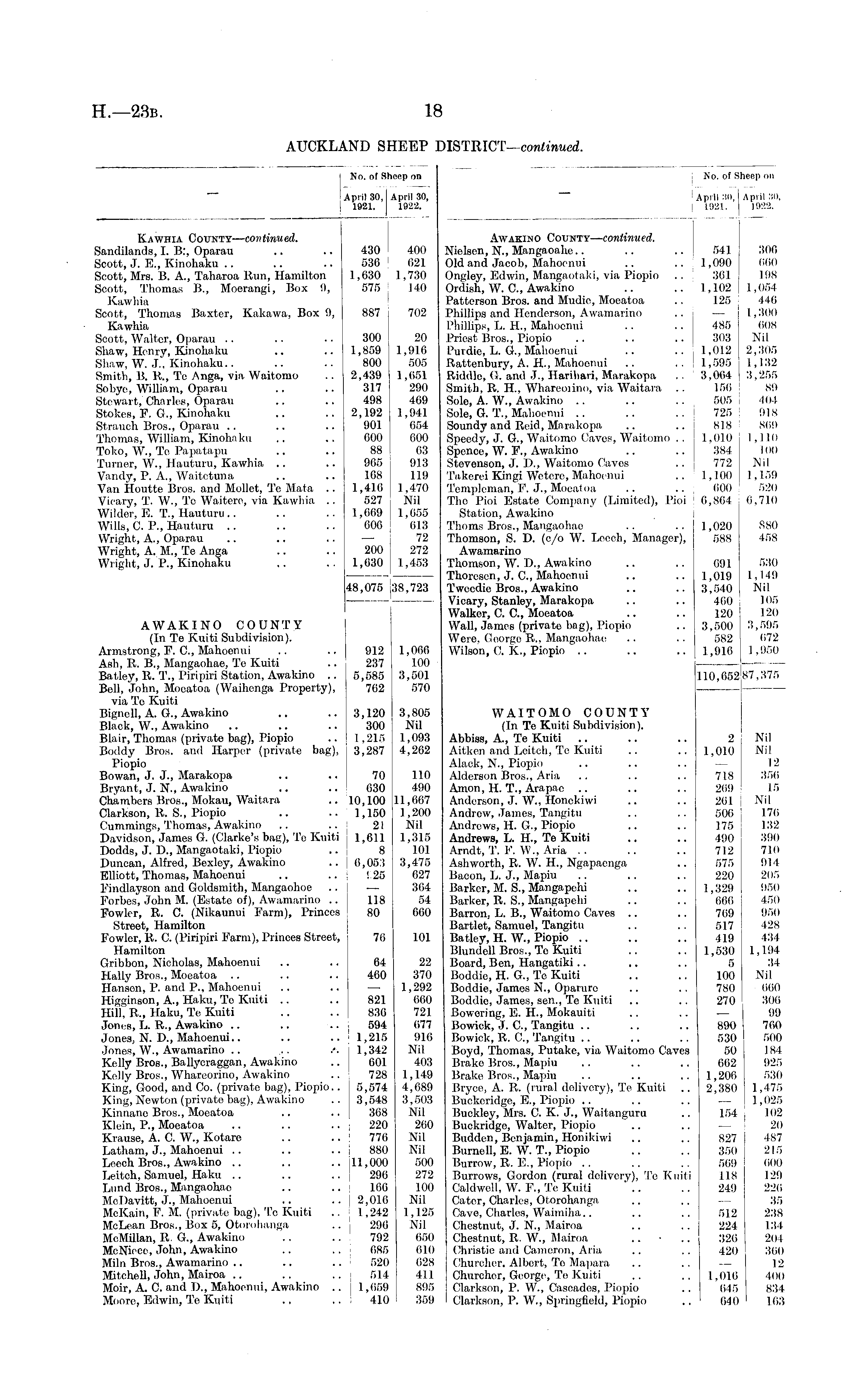 No. of Sheep on April 30,1 April 30, 1921. 1922. No. of SI Iheep on Arril 30,1 1021. I April 30, 1922. Kawhia County— continued. Sandilands, I. B:, Oparau Scott, J. E., Kinohaku Scott, Mrs. B. A., Taharoa Run, Hamilton Scott, Thomas B., Moerangi, Box 9, Kawhia Scott, Thomas Baxter, Kakawa, Box 9, Kawhia Scott, Walter, Oparau Shaw, Henry, Kinohaku Shaw, W. J., Kinohaku.. Smith, B. It., Te Anga, via Waitomo Sobye, William, Oparau Stewart, Charles, Oparau Stokes, F. G, Kinohaku Strauch Bros., Oparau Thomas, William, Kinohaku Toko, W., To Papatapu Turner, W., Hauturu, Kawhia Vandy, P. A., Waitetuna Van Houtte Bros, and Mollet, Te Mata .. Vieary, T. W., Te Waitere, via Kawhia .. Wilder, FT T., Hauturu Wills, C. P., Hauturu Wright, A., Oparau Wright, A. M., Te Anga Wright, J. P., Kinohaku 430 536 1,630 575 i 887 300 1,859 800 2,439 317 498 2,192 901 600 88 965 168 1,416 527 1,669 606 400 621 1,730 140 702 20 1,916 505 1,651 290 469 1,941 654 600 03 913 119 1,470 Nil 1,055 613 72 272 1,453 Awakino County— continued. Nielsen, N., Mangaoahe.. .. .. 541 Old and Jacob, Mahoenui .. .. 1,090 Ongley, Edwin, Mangaotaki, via Piopio .. 361 Ordish, W. ft, Awakino .. .. 1,102 Patterson Bros, and Mudio, Moeatoa .. 125 Phillips and Henderson, Awamarino .. — Phillips, L. IL, Mahoenui .. .. 485 Priest Bros., Piopio .. .. .. 303 Purdie, L. G, Mahoonui .. .. 1,012 Rattenbury, A. IL, Mahoenui .. .. 1,595 Riddle, G. and J., Harihari, Marakopa .. 3,064 Smith, R. H., Whareorino, via Waitara .. ! 156 Sole, A. W., Awakino .. .. ... 505 Sole, G. T., Mahoenui .. .. .. I 725 Soundy and Roid, Marakopa .. .. 818 Speedy, J. G., Waitomo Caves, Waitomo . . 1,010 Spence, W. F., Awakino .. .. 384 Stevenson, J. P., Waitomo Caves .. 772 Takerci Kingi Wotcrc, Mahoenui .. 1,100 Templeman, F. J., Moeatoa .. .. 600 Tho Pioi Estate Company (Limited), Pioi 6,864 Station, Awakino Thorns Bros., Mangaohae .. .. 1,020 Thomson, S. D. (e/o W. Leech, Manager), 588 Awamarino Thomson, W. D., Awakino .. .. 691 Thorescn, J. ft, Mahoenui .. .. 1,019 Tweedie Bros., Awakino .. .. 3,540 Vieary, Stanley, Marakopa .. .. 460 Walker, C. ft, Moeatoa .. .. 120 Wall, James (privato bag), Piopio .. 3,500 Were. George R., Mangaohae .. .. 582 Wilson, O. K., Piopio .. .. .. 1,916 306 66(1 198 1,054 446 1,300 608 Nil 2,305 1,132 3.255 89 404 918 869 1,110 100 Nil 1,159 520 6,710 880 458 200 1,630 530 1,149 Nil 105 120 3,595 072 1 ,950 48,075 38,723 AWAKINO COUNTY (In Te Kuiti Subdivision). Armstrong, F. ft, Mahoenui Ash, It. B., Mangaohae, Te Kuiti Batley, It. 1'., Piripiri Station, Awakino .. Boll, John, Moeatoa (Waihenga Property), via To Kuiti Bigncll, A. G., Awakino Black, W., Awakino Blair, Thomas (privato bag), Piopio Boddy Bros, and Harper (private bag), Piopio Bowan, J. J., Marakopa Bryant, J. N., Awakino Chambers Bros., Mokau, Waitara Clarkson, It. S., Piopio Cummings, Thomas, Awakino Davidson, James G (Clarke's bag), Te Kuiti Dodds, J. IX, Mangaotaki, Piopio Duncan, Alfred, Bexley, Awakino Fllliott, Thomas, Mahoonui F'indlayson and Goldsmith, Mangaohoe Forbes, John M. (Estate of), Awamarino .. Fowler, R. C. (Nikaunui F'arm), Princes Street, Hamilton Fowler, R. C. (Piripiri Farm), Princes Street, Hamilton Gribbon, Nicholas, Mahoenui Hally Bros., Moeatoa .. Hanson, P. and P., Mahoenui Higginson, A., Haku, Te Kuiti Hill', R., Haku, Te Kuiti Jones, L. R., Awakino Jones, N. D., Mahoenui.. Jones, W., Awamarino .. ... .». Kelly Bros., Ballycraggan, Awakino Kelly Bros., Whareorino, Awakino King, Good, and Co. (private bag), Piopio.. King, Newton (private bag), Awakino Kinnane Bros., Moeatoa Klein, P., Moeatoa Krause, A. C. W., Kotare Latham, J., Mahoenui Leech Bros., Awakino Loitch, Samuel, Haku Lund Bros., Mangaohae McDavitt, J., Mahoenui McKain, F. M. (private bag). Te Kuiti McLean Bros., Box 5, Otorohanga McMillan, R. G., Awakino McNiece, John, Awakino Miln Bros., Awamarino Mitchell, John, Mairoa Moir, A. C. and IX, Mahoenui, Awakino .. Moore, Edwin, Te Kuiti 912 237 5,585 762 3,120 300 1 1,215 3,287 70 630 10,100 1,150 21 1,611 8 6,063 '..25 118 80 76 64 460 1,066 100 3,501 570 3,805 Nil 1,093 4,262 110 490 11,667 1,200 Nil 1,315 101 3,475 627 364 54 660 101 22 370 1,292 660 721 677 916 Nil 403 1,149 4,689 3,503 Nil 260 Nil Nil 500 272 100 Nil 1,125 Nil 650 610 028 411 895 359 110,652 WAITOMO COUNTY (In To Kuiti Subdivision). Abbiss, A., Te Kuiti .. .. .. 2 Aitken and Leitch, Te Kuiti .. .. 1,010 Alack, N., Piopio .. .. .. — Alderson Bros., Aria .. .. .. 718 Amon, H. T., Arapao .. .. .. 269 Anderson, J. W., Honekiwi .. .. 261 Andrew, James, Tangitu .. .. 506 Andrews, H. G., Piopio .. .. 175 Andrews, L. H., Te Kuiti .. .. 490 Arndt, T. F. W., Aria .. .. .. 712 Ashworth, R. W. H., Ngapaenga .. 575 Bacon, L. J., Mapiu .. .. .. 220 Barker, M. S., Mangapehi .. .. 1,329 Barker, R. S., Mangapehi .. .. 666 Barron, L. B., Waitomo Caves .. .. 769 Bartlot, Samuel, Tangitu .. .. 517 Batley, H. W., Piopio .. .. .. 419 Blundell Bros., To Kuiti .. .. 1,530 Board, Ben, Hangatiki.. .. .. 5 Boddic, H. G., Te Kuiti .. .. 100 Boddic, James N., Oparure .. .. 780 Boddie, James, sen., To Kuiti .. .. 270 Boworing, E. H., Mokauiti .. .. — Bowick, J. ft, Tangitu .. .. .. 890 Bowick, R. ft, Tangitu .. .. .. 530 Boyd, Thomas, Putake, via Waitomo Caves 50 Brake Bros., Mapiu .. .. .. 662 Brake Bros., Mapiu .. .. .. 1,206 Bryce, A. R. (rural delivery), To Kuiti .. 2,380 Buckcridge, E., Piopio .. .. .. — Buckley, Mrs. ft K. J., Waitanguru .. 154 Buckridge, Walter, Piopio Budden, Benjamin, Honikiwi .. .. 827 Burnell, E. W. T., Piopio .. .. 350 Burrow, R. H., Piopio .. .. .. 569 Burrows, Gordon (rural delivery), Te Kuiti 118 Caldwell, W. F., To Kuiti .. .. 249 Cater, Charles, Otorohanga .. ,. — Cave, Charles, Waimiha.. .. .. 512 Chestnut, J. N., Mairoa .. .. 224 Chestnut, R. W., Mairoa .. • .. 326 Christie and Cameron, Aria .. .. 420 Churcher. Albert, To Mapara .. .. — Churchcr, George, Te Kuiti .. .. 1,016 Clarkson, P. W., Casoados, Piopio .. 045 Clarkson, P. W., Spring