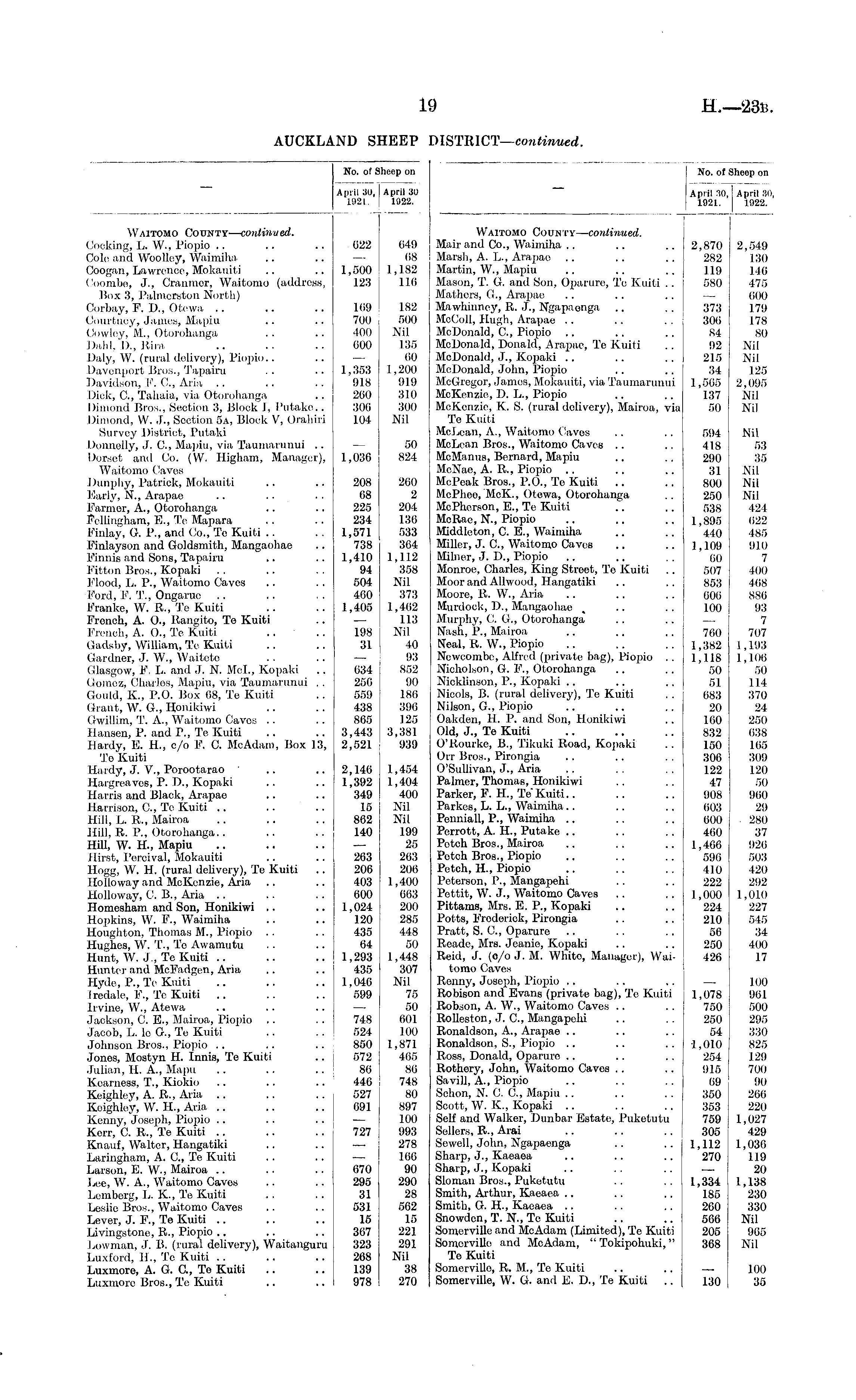 No. of I April 30, 1921. Iheep on I April 30 | 1022. No. of Sheep on April 30, April 30, 1921. 1922. Waitomo County— continued. (kicking, L. W., Piopio .. Coh; and Woolley, Waimiha, Coogan, Lawrence, Mokauiti Coombe, J., Cranmcr, Waitomo (address, Box 3, Palmorston North) Corbay, F. D., Otewa Courtney, James, Mapiu Cowley, M., Otorohanga Dahl, D., Bira Daly, W. (rural delivery), Piopio.. Davenport Bros., Tapairu Davidson, I''. ft, Aria .. Dick, ft, Tahaia, via Otorohanga Dimond Bros., Section 3, Block I, Putake.. Dimond, W. J., Section 5a, Block V, Orahiri Survey District, Putaki Donnelly, J. ft, Mapiu, via Taumarunui .. Dorset and Co. (W. Higham, Manager), Waitomo Cavos Dunphy, Patrick, Mokauiti Early, N., Arapao Parmer, A., Otorohanga Pellingham, IT, Te Mapara F'inlay, G. P., and Co., To Kuiti Finlayson and Goldsmith, Mangaohae Finnis and Sons, Tapairu Fitton Bros., Kopaki F'lood, L. P., Waitomo Caves Ford, F. T., Ongaruo Franke, W. R., Te Kuiti French, A. O., Rangito, To Kuiti French, A. O., Te Kuiti Gadsby, William, Te Kuiti Gardner, J. W., Wailcte Glasgow, F', L. and J. N. McL, Kopaki Gomez, Charles, Mapiu, via Taumarunui . . Gould, K, P.O. Box 68, Te Kuiti Grant, W. G., Honikiwi Gwillim, T. A., Waitomo Cavos Hansen, P. and P., Te Kuiti Hardy, E. H., c/o F. C. McAdam, Box 13, To Kuiti Hardy, J. V., Porootarao Hargreavcs, P. IX, Kopaki Harris and Black, Arapae Harrison, ft, Te Kuiti Hill, L. It., Mairoa Hill. R. P., Otorohanga.. Hill, W. H., Mapiu Hirst, Percival, Mokauiti Hogg, W. H. (rural delivery), Te Kuiti Holloway and McKenzie, Aria Holloway, 0. B., Aria .. Homesham and Son, Honikiwi Hopkins, W. F., Waimiha Houghton, Thomas M., Piopio Hughes, W. T., To Awamutu Hunt, W. J, Te Kuiti .. Hunter and McFadgen, Aria Hyde, P., Te Kuiti Iredale, P., To Kuiti Irvine, W., Atewa Jackson, 0. E., Mairoa, Piopio Jacob, L. lo G., Te Kuiti Johnson Bros., Piopio Jones, Mostyn H. Innis, Te Kuiti Julian, H. A., Mapu Koarness, T., Kiokio Keighley, A. R., Aria Koighley, W. H., Aria Kenny, Joseph, Piopio Kerr, C. R., Te Kuiti Knauf, Walter, Hangatiki Laringham, A. ft, Te Kuiti Larson, E. W., Mairoa Lee, W. A., Waitomo Caves Lomberg, L. K., Te Kuiti Leslie Bros., Waitomo Caves Lever, J. F, Te Kuiti .. Livingstone, R., Piopio Lowman, J. B. (rural delivory), Waitanguru Luxford, II., Te Kuiti .. Luxmore, A. G. ft, Te Kuiti Luxmorc Bros., To Kuiti 622 1,500 123 169 700 400 600 1,353 918 260 300 104 1,036 208 68 225 234 1,571 738 1,410 94 504 400 1,405 198 31 634 256 559 438 865 3,443 2,521 649 68 1,182 116 182 500 Nil 135 00 1,200 919 310 300 Nil 50 824 260 2 204 136 533 364 1,112 358 Nil 373 1,462 113 Nil 40 93 852 90 186 396 125 3,381 939 Waitomo County— continued. Mair and Co., Waimiha Marsh, A. L., Arapao Martin, W., Mapiu .. .. .. Mason, T. G. and Son, Oparure, To Kuiti . . Mathers, (,',, Arapae Mawhinney, R. J., Ngapaenga McColl, Hugh, Arapae McDonald, ft, Piopio McDonald, Donald, Arapao, Te Kuiti McDonald, J., Kopaki McDonald, John, Piopio McGregor, James, Mokauiti, via 'Taumarunui McKenzie, D. L., Piopio McKenzie, K. S. (rural delivery), Mairoa, via Te Kuiti McLean, A., Waitomo Cavos McLean Bros., Waitomo Caves McManus, Bernard, Mapiu McNao, A. It., Piopio .. McPoak Bros., P.O., To Kuiti McPheo, McK., Otewa, Otorohanga McPherson, E., Te Kuiti McRae, N., Piopio Middleton, C. E., Waimiha Miller, J. ft, Waitomo Caves Milner, J. D., Piopio Monroe, Charles, King Street, To Kuiti Moor and Allwood, Hangatiki Mooro, It. W., Aria Murdoch, 1)., Mangaohae Murphy, C. G., Otorohanga Nash, P., Mairoa Meal, R. W., Piopio Newcombe, Alfred (private bag), Piopio .. Nicholson, G. P., Otorohanga Nicklinson, P., Kopaki Nicols, B. (rural delivory), To Kuiti Nilson, G, Piopio Oakden, 11. P. and Son, Honikiwi Old, J., To Kuiti O'Bourke, B., Tikuki Road, Kopaki Orr Bros., Pirongia O'Sullivan, J., Aria Palmer, Thomas, Honikiwi Parker, F. H., To Kuiti Parkes, L. L., Waimiha Penniall, P., Waimiha Pcrrott, A. H., Putake Petch Bros., Mairoa Petch Bros., Piopio Potch, IL, Piopio Peterson, P., Mangapehi Pottit, W. J., Waitomo Caves Pittams, Mrs. E. P., Kopaki Potts, Frederiok, Pirongia Pratt, S. ft, Oparure Readc, Mrs. Jeanio, Kopaki Reid, J. (o/o J. M. White, Manager), Waitomo Caves Ronny, Joseph, Piopio Robison and Evans (private bag), Te Kuiti Robson, A. W., Waitomo Caves Rolleston, J. ft, Mangapohi Ronaldson, A., Arapae Ronaldson, S., Piopio Ross, Donald, Oparure Rothery, John, Waitomo Cavos Savill, A., Piopio Schon, N. C. ft, Mapiu Scott, W. K., Kopaki .. Self and Walker, Dunbar Estate, Puketutu Sellers, R., Arai Sewoll, John, Ngapaenga Sharp, J., Kaeaea Sharp, J., Kopaki Sloman Bros., Puketutu Smith, Arthur, Kaeaea Smith, G. H., Kaeaea Snowdon, T. N., To Kuiti Somerville and McAdam (Limited), Te Kuiti Somerville and McAdam, " Tokipohuki," Te Kuiti Somerville, R. M., Te Kuiti Somerville, W. G. and E. D., Te Kuiti .. ti in in vii 'ai2,870 2,549 282 130 119 146 580 475 600 373 179 306 178 84 80 92 Nil 215 Nil 34 125 i 1,565 2,095 137 Nil ia 50 Nil 594 Nil 418 53 290 35 31 Nil 800 Nil 250 Nil 538 424 1,895 622 440 485 1,109 910 60 7 507 400 853 468 606 886 100 93 7 760 707 1,382 1,193 1,118 1,106 50 50 51 114 683 370 20 24 160 250 832 638 150 105 306 309 122 120 47 50 908 900 603 29 600 280 460 37 1,466 920 596 503 410 420 222 292 1,000 1,010 224 227 210 545 56 34 250 400 426 17 2,870 282 119 580 373 306 84 92 215 34 1,565 137 50 594 418 290 31 800 250 538 1,895 440 1,109 00 507 853 606 100 760 1,382 1,118 50 51 683 20 160 832 150 306 122 47 908 603 600 460 1,466 596 410 222 1,000 224 210 56 250 426 2,146 1,392 349 15 862 140 1,454 1,404 400 Nil Nil 199 25 263 206 1,400 663 200 285 448 50 1,448 307 Nil 75 50 601 100 1,871 465 80 748 80 897 100 993 278 166 90 290 28 562 15 221 291 Nil 38 270 263 206 403 600 1,024 120 435 64 1,293 435 1,046 599 748 524 850 572 86 446 527 691 uii iti aii iti tu liti i," — 100 1,078 961 750 500 250 295 54 330 1,010 825 254 129 915 700 69 90 350 266 353 220 759 1,027 305 429 1,112 1,036 270 1