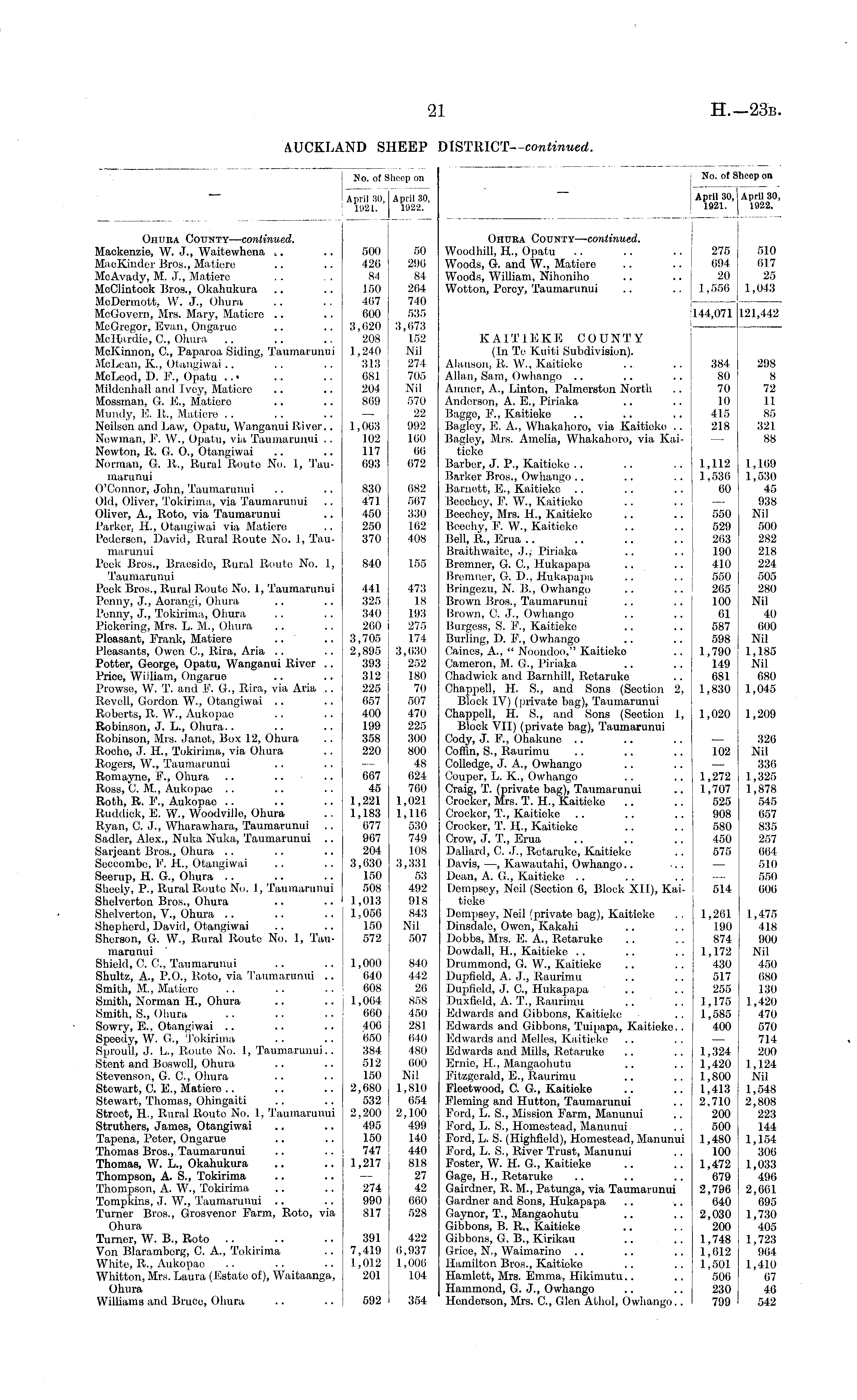No. of S April 30, 1921. Iheep on April 30, 1922. No. of S April 30, 1921. Ihcep on April 30, 1922. Ohura County— continued. Mackenzie, W. J., Waitewhena ,. MacKinder Bros., Matiere McAvady, M. J., Matiere MoClintoek Bros., Okahukura McDermott, W. J., Ohura McGovern, Mrs. Mary, Matioro McGregor, Evan, Ongarue McHardie, ft, Ohura McKinnon, ft, Paparoa Siding, Taumarunui McLean, K., Otangiwai McLeod, D. FT, Opatu Mildonhall and Ivey, Matioro Mossman, G. li., Matiere Mundy, FT ].!., Matiere Neilson and Law, Opatu, Wanganui Itiver.. Newman, F. W., Opatu, via Taumarunui .. Newton, R. G. O., Otangiwai Norman, G. it., Rural Route No. 1, Taumarunui O'Connor, John, Taumarunui Old, Oliver, 'tokirima, via Taumarunui Oliver, A., Roto, via Taumarunui Parker, IL, Otangiwai via Matiere Podcrsen, David, Rural Routo No. 1, Taumarunui Peek Bros., Braesido, Rural Route No. 1, Taumarunui Peek Bros., Rural Routo No. 1, Taumarunui Penny, J., Aorangi, Ohura Penny, J., Tokirima, Ohura Pickoring, Mrs. L. M., Ohura Ploasant, F'rank, Matiere Pleasants, Owen ft, Itira, Aria Potter, Georgo, Opatu, Wanganui River .. Price, William, Ongarue Prowse, W. T. and F. G., Rira, via Aria . . Itovell, Gordon W., Otangiwai Roberts, R. W., Aukopae Robinson, J. L., Ohura.. Robinson, Mrs. Janet, Box 12, Ohura Rooho, J. H., Tokirima, via Ohura Rogers, W., Taumarunui Romayne, P., Ohura Ross, C. M., Aukopae Roth, R. F., Aukopae Ituddick, FT W., Woodvillo, Ohura Ryan, C. J., Wharawhara, Taumarunui Sadler, Alex., Nuka Nuka, Taumarunui .. Sarjeant Bros., Ohura Soccombo, F. H., Otangiwai Seerup, H. G., Ohura Sheely, P., Rural Route No. 1, Taumarunui Sholverton Bros., Ohura .. .. ' Shelverton, V., Ohura Shepherd, David, Otangiwai Shorson, G. W., Rural Route No. 1, Taumarunui Shield, C. ft, Taumarunui Shultz, A., P.O., Roto, via Taumarunui .. Smith, M., Matiere Smith, Norman H., Ohura Smith, S., Ohura Sowry, E., Otangiwai Speedy, W. G., 'Tokirima Sproull, J. L., Bioute No. 1, Taumarunui.. Stent and Bos well, Ohura Stevenson, G. ft, Ohura Stewart, C. E., Matiere Stewart, Thomas, Ohingaiti Street, IL, Rural Route No. 1, Taumarunui Struthers, James, Otangiwai Tapcna, Peter, Ongarue Thomas Bros., Taumarunui Thomas, W. L., Okahukura Thompson, A. S., Tokirima Thompson, A. W., Tokirima Tompkins, J. W., Taumarunui Turner Bros., Grosvenor F'arm, Roto, via Ohura Turner, W. B., Roto Von Blaramborg, C. A., Tokirima White, R., Aukopae Whitton, Mrs. Laura (Estate of), Waitaanga, Ohura Williams and Bruce, Ohura 500 426 84 150 407 600 3,020 208 1,240 313 681 204 869 1,063 102 117 093 830 471 450 250 370 840 441 325 340 260 3,705 2,895 393 312 | 225 657 400 199 358 220 50 296 84 264 740 535 3,673 152 Nil 274 705 Nil 570 22 992 100 60 672 682 567 330 162 408 155 473 18 193 275 174 3,630 252 180 70 507 470 225 300 800 48 624 760 1,021 1,116 530 749 108 3,331 53 492 918 843 Nil 507 Ohura County— continued. Woodhill, IL, Opatu Woods, G. and W., Matiere Woods, William, Nihoniho Wotton, Percy, Taumarunui KAITIEKE COUNTY (In To Kuiti Subdivision). Alanson, R. W., Kaitieke Allan, Sam, Owhango Amnor, A., Linton, Palmerston North Anderson, A. E., Piriaka Bagge, P., Kaitieko Bagley, FT A., Whakahoro, via Kaitieko .. Bagley, Mrs. Amelia, Whakahoro, via Kai tieke Barber, J. P., Kaitieke Barker Bros., Owhango Barnett, E., Kaitieko Beechey, F. W., Kaitieko Beechey, Mrs. IL, Kaitieko Beeehy, F. W., Kaitieko Bell, R., Erua Braithwaite, J.,- Piriaka Bromner, G. ft, Hukapapa Bremner, G. D., Hukapapa Bringezu, N. B., Owhango Brown Bros., Taumarunui Brown, ft J., Owhango Burgess, S. P., Kaitieke Burling, D. P., Owhango Cainos, A., " Noondoo," Kaitieke Cameron, M. G., Piriaka Chadwick and Barnhill, Retaruke Chappell, H. S., and Sons (Section 2, Block IV) (private bag), Taumarunui Chappoll, H. S., and Sons (Section I, Block VII) (private bag), Taumarunui Cody, J. F, Ohakune Coffin, S., Raurimu Colledge, J'. A., Owhango Couper, L. K., Owhango Craig, T. (private bag), Taumarunui Crocker, Mrs. T. H., Kaitieke Crocker, T., Kaitieke Crocker, T. H., Kaitieke Crow, J. T., Erua Dallard, C. J., Retaruko, Kaitieke Davis, —, Kawautahi, Owhango Dean, A. G, Kaitieke Dempsey, Noil (Section 0, Block XII), Kaitieke 275 694 20 1,556 144,071 384 80 70 10 415 218 i 1,112 1,536 60 550 529 263 190 410 550 265 100 01 587 598 1,790 149 681 1,830 1,020 102 1,272 1,707 525 908 580 450 575 510 617 25 1,043 121,442 298 8 72 II 85 321 88 1,169 1,530 45 938 Nil 500 282 218 224 505 280 Nil 40 600 Nil 1,185 Nil 680 1,045 1,209 326 Nil 336 1,325 1,878 545 657 835 257 664 510 550 606 667 45 1,221 1,183 677 967 204 3,630 150 508 1,013 1,056 150 572 514 1,000 640 608 1,004 660 406 650 384 512 150 2,080 532 2,200 495 150 747 1,217 840 442 26 858 450 281 640 480 600 Nil 1,810 654 2,100 499 140 440 818 27 42 660 528 Dompsey, Neil (private bag), Kaitieke Dinsdale, Owon, Kakahi Dobbs, Mrs. E. A., Retaruke Dowdall, H., Kaitieke Drummond, G. W., Kaitieke Dupfield, A. J., Raurimu Dupfiold, J. ft, Hukapapa Duxfield, A. T., Raurimu Edwards and Gibbons, Kaitieko Edwards and Gibbons, Tuipapa, Kaitieke.. F'dwards and. Melles, Kaitieko Edwards and Mills, Retaruke Ernie, H., Mangaohutu F'itzgerald, E., Raurimu Fleetwood, C. G., Kaitieke F'leming and Hutton, Taumarunui F'ord, L. S., Mission Farm, Manunui Ford, L. S., Homestead, Manunui F'ord, L. S. (Highfiold), Homestead, Manunui Ford, L. S., River Trust, Manunui Foster, W. H. G., Kaitieke Gage, H., Retaruke Gairdner, R. M., Patunga, via Taumarunui Gardner and Sons, Hukapapa Gaynor, T., Mangaohutu Gibbons, B. R., Kaitieke Gibbons, G. B., Kirikau Grice, N., Waimarino Hamilton Bros., Kaitieko Hamlett, Mrs. Emma, Hikimutu.. Hammond, G. J., Owhango Henderson, Mrs. ft, Glen Athol, Owhango.. 1,261 190 874 1,172 430 517 255 1,175 1,585 400 1,475 418 900 Nil 450 680 130 1,420 470 570 714 200 1,124 Nil 1,548 2,808 223 144 1,154 306 1,033 496 2,661 695 1,730 405 1,723 964 1,41.0 67 46 542 1,324 1,420 1,800 1,413 2,710 200 500 1,480 100 1,472 679 2,796 640 2,030 200 1,748 1,612 1,501