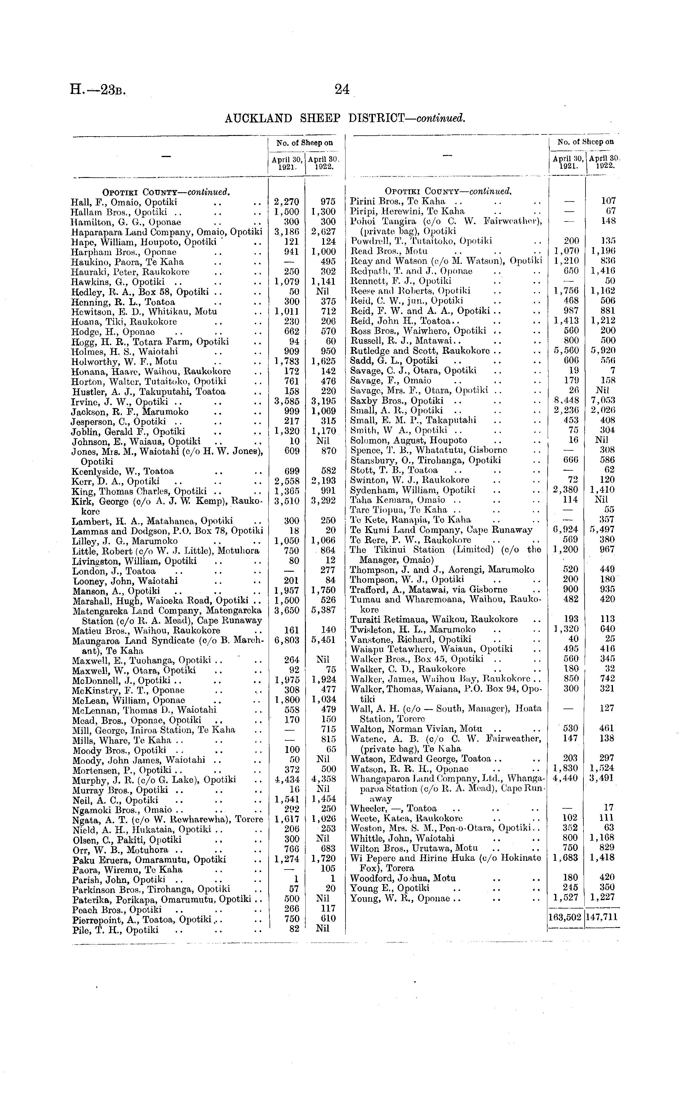 No. of Sheep on April 30, April 30 1921. 1922. No. of £ April 30, 1921. Sheep on I April 30 1922. Opotiki County— continued. Hall, F., Omaio, Opotiki Hallam Bros., Opotiki Hamilton, G. G., Oponae Haparapara Land Company, Omaio, Opotiki Hapo, William, Houpoto, Opotiki Haiphani Bros., Oponae llaukino, Paora, Te Kaha Hauraki, Peter, Raukokore Hawkins, G., Opotiki .. Hedley, It. A., Box 58, Opotiki Henning, R. L., Toatoa Howitson, FT IX, Whitikau, Motu Hoana, Tiki, Raukokore Hodge, FL, Oponae Hogg, H. R., Totara Farm, Opotiki Holmes, H. S., Waiotahi Holworthy, W. FT, Motu Honana, Haare, Waihou, Raukokore Horton, Walter, Tutaitoko, Opotiki Hustler, A. J., Takuputahi, Toatoa Irvine, J. W., Opotiki Jackson, R. F., Marumoko Jesporson, ft, Opotiki Joblin, Gerald F., Opotiki Johnson, E., Waiaua, Opotiki Jones, Mrs. M., Waiotahi (e/o H. W. Jones), Opotiki Kcenlyside, W., Toatoa Kerr, D. A., Opotiki King, Thomas Charles, Opotiki Kirk, Georgo (e/o A. J. W Kemp), Raukokore Lambert, II. A., Matahanea, Opotiki Lammas and Dodgson, P.O. Box 78, Opotiki Lilley, J. G., Marumoko Little, Robert (c/o W. J. Littlo), Motuhora Livingston, William, Opotiki London, J., Toatoa Looney, John, Waiotahi Manson, A., Opotiki Marshall, Hugh, Waioeka Road, Opotiki .. Matongareka Land Company, Matongareka Station (c/o R. A. Mead), Cape Runaway Maticu Bros., Waihou, Raukokore, Maungaroa Land Syndicate (c/o B. Marchant), Te Kaha Maxwell, E., Tuohanga, Opotiki Maxwell, W., Otara, Opotiki McDonnell, J., Opotiki MrKinstry, I'. T., Oponae Mo Lean, William, Oponae McLennan, Thomas D., Waiotahi Mead, Bros., Oponae, Opotiki Mill, George, Iniroa Station, To Kaha Mills, Whare, Te Kaha Moody Bros., Opotiki Mood}', John Jamos, Waiotahi .. Mortonsen, P., Opotiki Murphy, J. B. (c/o G. Lake), Opotiki Murray Bros., Opotiki Neil, A. ft, Opotiki Ngamoki Bros., Omaio Ngata, A. T. (c/o W. ltcwharewha), Torere Nield, A. H., Hukataia, Opotiki Olsen, ft, Pakiti, Opotiki Orr, W. B., Motuhora Paku Eruera, Omaramutu, Opotiki Paora, Wiremu, Te Kaha Parish, John, Opotiki Parkinson Bros., Tirohanga, Opotiki Paterika, Porikapa, Omarumutu, Opotiki .. Poach Bros., Opotiki Pierrepoint, A., Toatoa, Opotiki... Pile, T. IL, Opotiki 2,270 1,500 300 3,186 121 941 250 1.079 50 300 1,011 230 662 94 909 1,783 172 761 158 3,585 999 217 1,320 10 609 699 2,558 1,365 3,510 300 18 1,050 750 80 975 1,300 300 2,627 124 1,000 495 302 1,141 Nil 375 712 206 570 60 950 1,625 142 476 220 3,195 1,009 315 1,170 Nil 870 682 2,193 991 3,292 250 20 1,066 864 12 277 84 1,750 526 5,387 Opotiki County— continued. Pirini Bros., To Kaha Piripi, Herewini, Te Kaha Pohoi Tangira (c/o ft W. Fairweather), (private bag), Opotiki Powdrell, T., Tutaitoko, Opotiki Read Bros., Motu Reay and Watson (c/o M. Watson), Opotiki Itcdpath, T. and J., Oponae Rennctt, P. J., Opotiki Reese and Roberts, Opotiki Reid, C. W., jun., Opotiki Reid, P. W. and A. A., Opotiki Reid, John IL, Toatoa.. Ross Bros., Waiwhero, Opotiki Russell, R. J., Matawai.. Rutledge and Scott, Raukokore Sadd, G. L., Opotiki Savage, C. J., Otara, Opotiki Savage, F., Omaio Savage, Mrs. F., Otara, Opotiki Saxby Bros., Opotiki Small, A. It., Opotiki Small, E. M. P., Takaputahi Smith, W A., Opotiki Solomon, August, Houpoto Spence, T. B., Whatatutu, Gisborno Stansbury, 0., Tirohanga, Opotiki Stott, T. B., Toatoa Swinton, W. J., ltaukokoro Sydonham, William, Opotiki Taha Komara, Omaio Tare, Tiopua, 'To Kaha To Kete, Ranapia, To Kaha Te Kumi Land Company, Cape Runaway To Rore, P. W., Raukokore The Tikinui Station (.Limited) (c/o the Manager, Omaio) 'Thompson, J. and J., Aorcngi, Marumoko Thompson, W. J., Opotiki Trafford, A., Matawai, via Gisborne Tuman and Wharcmoana, Waihou, Raukokore Turaiti Retimaua, Waikou, Raukokore Twisleton, IL L., Marumoko Vanstone, Richard, Opotiki Waiapu Tetawhero, Waiaua, Opotiki Walker Bros., Box 45, Opotiki Walker, C. I)., Raukokore Walker, James, Waihou Bay, Raukokore .. Walker, Thomas, Waiana, P.O. Box 94, Opotiki Wall, A. H. (c/o — South, Manager), Hoata Station, Torero Walton, Norman Vivian, Motu Watene, A. B. (c/o C. W. Fairweather, (privato bag), Te Kaha Watson, Edward George, Toatoa Watson, R. R. H., Oponae Whangaparoa Land (lompany, Ltd., Whangaparoa Station (o/o It. A. Mead), Capo I inn away Wheeler, —, Toatoa Wccte, Katea, Raukokore Weston, Mrs. S. M., Pen-o-Otara, Opotiki.. Whittle, John, Waiotahi Wilton Bros., Urutawa, Motu Wi Pepero and Ilirino Huka (c/o Hokinato Fox), Torera Woodford, Jo -hua, Motu Young FT, Opotiki Young, W. It., Oponae 200 1,070 1,210 650 1,756 468 987 1,413 560 800 5,560 600 19 179 26 8,448 2,236 453 75 16 666 72 2,380 114 6,924 569 1,200 107 67 148 135 1,196 836 1,416 50 1,162 506 881 1,212 200 500 5,920 556 7 158 Nil 7,053 2,020 408 304 Nil 308 586 02 120 1,410 Nil 55 357 5,497 380 967 201 1,957 1,500 3,050 520 200 900 482 449 180 935 420 101 6,803 264 92 1,975 308 1,800 558 1.70 140 5,451 Nil 75 1,924 477 1,034 479 150 715 815 65 Nil 500 4,358 Nil 1,454 250 1,026 253 Nil 683 1,720 105 1 20 Nil 117 610 Nil 193 1,320 40 495 560 180 850 300 113 040 25 416 345 32 742 321 127 530 147 401 138 100 50 372 4,434 16 1,541 292 1,617 200 300 706 1,274 203 1,830 4,440 297 1,524 3,491 17 111 03 1,168 829 1,418 102 352 800 750 1,683 1 57 500 266 750 82 180 215 1,527 420 350 1,227 163,502 147,711