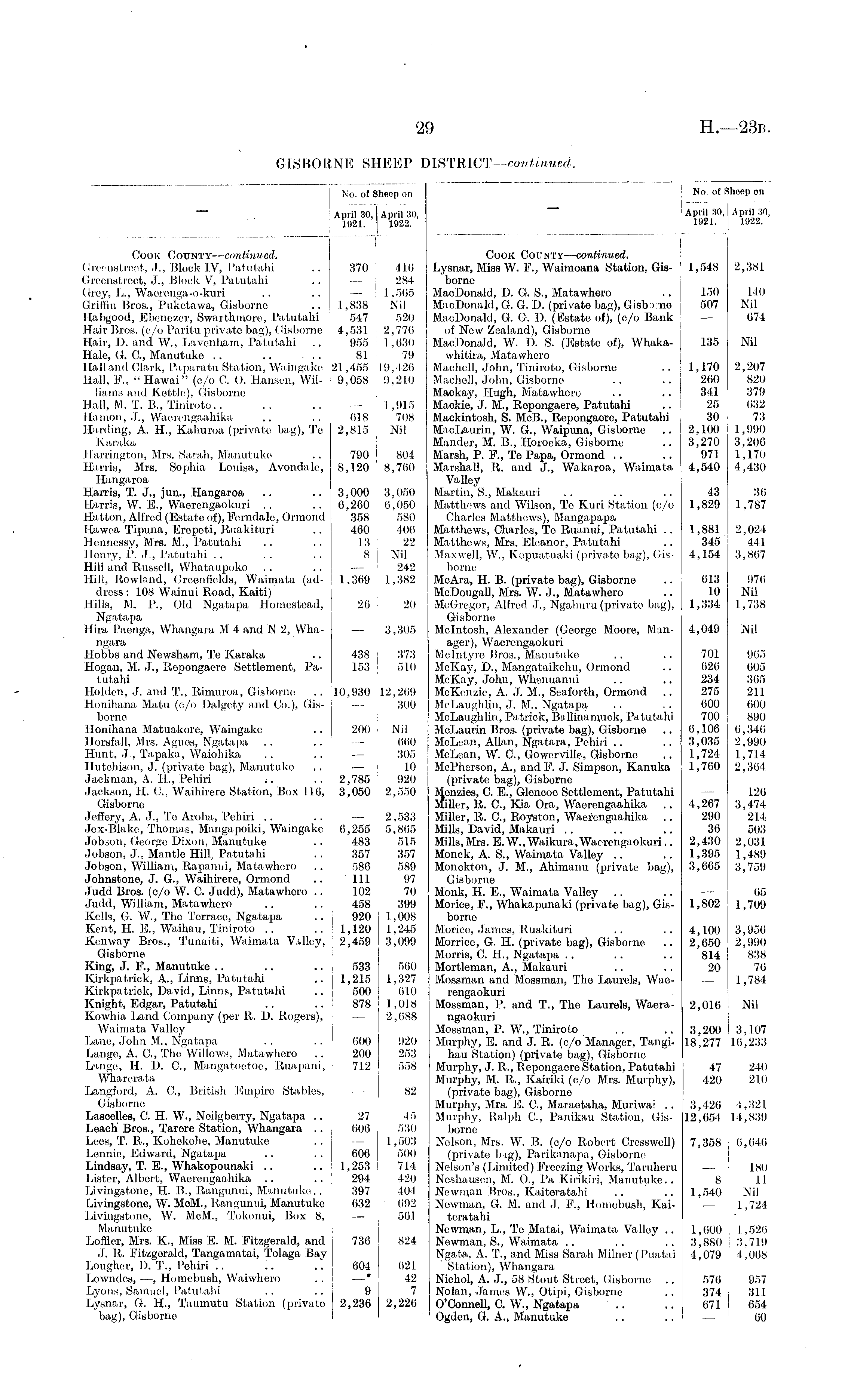 No. o( Sheep on No. of S Iheep on April 30, April 80, 1U21. 1922. April 30, 1021. April 30. 1922. ! Cook County— continued. Greenstreet, J., Block IV, Patutahi .. 370 416 Greenstroet, J., Blook V, Patutahi .. — : 284 Grey, L., Waerenga-o-kuri .. .. — i 1,565 Griffin Bros., Puketawa, Gisborno .. 1,838 Nil Habgood, Ebonezer, Swarthmore, Patutahi 547 : 520 Hair Bros, (c/o Paritu private bag), Gisborne 4,531 2,776 Hair, IX and W.. Lavenham, Patutahi .. 955 1,630 Hale, G. ft, Manutuke .. 81 79 Halland Clark, Paparatu Station, Waingake 21,455 19,426 Hall, P., " Flawai" (c/o 0. O. Hansen, Wil- 9,058 9,21.0 liains and Kettle), Gisborne Hall, M. T. B., Tiniroto.. .. . . 1,915 Hamon, J., Waerengaahika .. .. 618 708 Harding, A. H., Kahuroa (private bag), To 2,815 Nit Karaka Harrington, Mrs. Sarah, Manutuke .. 790] 804 Harris, Mrs. Sophia Louisa, Avondale, 8,120 8,760 Hangaroa Harris,' T. J., jun., Hangaroa .. .. 3,000 ; 3,050 Harris, W. E., Waercngaokuri .. .. 0,260 6,050 Hatton, Alfred (Estate of), Ferndale, Ormond 358 580 Hawea Tipuna, Erepcti, Ruakituri .. 460 406 Hennessy, Mrs. M., Patutahi .. .. 13! 22 Henry, P. J., Patutahi .. .. .. 8 | Nil Hill and Russell, Whataupoko .. .. —• 242 Hill, Rowland, Greenfields, Waimata (ad- 1.369 1,382 dress: 108 Wainui Road, Kaiti) Hills, M. P., Old Ngatapa Homestead, 26 20 Ngatapa Hira Paenga, Whangara M 4 and N 2, Wha- — 3,305 ngara Hobbs and Newsham, Te Karaka .. 438 | 373 Hogan, M. J., Repongaere Settlement, Pa- 153 | 510 tutahi Holden, J. and T., Rimuroa, Gisborne .. TO,930 12,269 Honihana Matu (c/o Dalgety and Co.), Gis- — 300 borne Honihana Matuakore, Waingake .. 200 i Nil HorsfalI, Mrs. Agnes, Ngatapa .. .. 66(1 Hunt, J., Tapaka, Waiohika .. ..J — 305 Hutchison, J. (private bag), Manutuke .. 10 Jackman, A. IL, Pehiri .. .. '2,785 920 Jackson, II. ft, Waihirere Station, Box 110, 3,050 2,550 Gisborne Jeffery, A. J., Te Aroha, Pehiri .. .. — I 2,533 Jox-Blake, Thomas, Mangapoiki, Waingake " 6,255 5,865 Jobson, George Dixon, Manutuke .. 483 515 Jobson, J., Mantle Hill, Patutahi ... 357 357 Jobson, William, Rapanui, Matawhero .. \ 586 589 Johnstone, J. G., Waihirere, Ormond .. Ill 97 Judd Bros, (c/o W. ft Judd), Matawhero .. 102 70 Judd, William, Matawhero .. .. 458 399 Kelts, G. W., The Terrace, Ngatapa .. 920 j 1,008 Kent, H. E., Waihau, Tiniroto .. ..1,120 1,245 Kenway Bros., Tunaiti, Waimata Villcy, 2,459 i 3,099 Gisborne King, J. F., Manutuke .. .. .. 533 560 Kirkpatrick, A., Linns, Patutahi .. 1,215 1,327 Kirkpatrick, David, Linns, Patutahi .. 500 610 Knight, Edgar, Patutahi .. .. 878 j 1,018 Kowhia Land Company (per it. D. Rogers), — 2,088 Waimata Valloy Lane, John M., Ngatapa . . .. I 600 920 Lange, A. ft, The Willows, Matawhero ... 200 253 Lange, H. D. ft, Mangatoetoc, Ruapani, | 712 558 Wharerata Langford, A. ft, British Empire Stables, j — 82 Gisborne Laseelles, C. H. W., Noilgberry, Ngatapa .. 27 45 Leach Bros., Tarore Station, Whangara .. 606 530 Lees, T. R., Kohekohe, Manutuke .. — 1,503 Lcnnic, Edward, Ngatapa .. . . 606 500 Lindsay, T. E., Whakopounaki .. .. 1,253 714 Lister, Albert, Waerengaahika .. .. 294 -120 Livingstone, H. B., Rangunui! Manutuke.. \ 397 404 Livingstone, W. McM., Rangunui, Manutuke 632 692 Livingstone, W. McM., Tokonui, Box 8, | — 56.1 Manutuke Loftier, Mrs. K., Miss E. M. Fitzgerald, and j 736 824 J. R. Fitzgerald, Tangamatai, Tolaga Bav Tougher, P. T., Pohiri .. .. .'. 604 621 Lowndes, —, Homebush, Waiwhero .. I —* 42 Lyons, Samuel, Patutahi .. .. i 9 7 Lysnar, G. H., Taumutu Station (privato 2,236 2,226 bag), Gisborne Cook County— continued. Lysnar, Miss W. F., Waimoana Station, Gisborne MacDonald, D. G. S., Matawhero MacDonald, G. G. D. (private bag), Gisborne MacDonald, G. G. D. (Estate of), (c/o Bank of New Zealand), Gisborno MacDonald, W. D. S. (Estato of), Whakawhitira, Matawhero Madid], John, Tiniroto, Gisborne Machell, John, Gisborne Mackay, Hugh, Matawhero Maokie, J. M., Repongaere, Patutahi Mackintosh, S. McB., Repongaere, Patutahi MacLaurin, W. G., Waipuna, Gisborno Mander, M. B., Horooka, Gisborne Marsh, P. F'., Te Papa, Ormond Marshall, It. and J., Wakaroa, Waimata Valley Martin, S., Makauri Matthews and Wilson, To Kuri Station (c/o Charles Matthews), Mangapapa Matthews, Charles, To Ruanui, Patutahi .. Matthews, Mrs. Eleanor, Patutahi Maxwell, W., Kopuatuaki (private bog), Gisborne McAra, H. B. (private bag), Gisborne McDougall, Mrs. W. J., Matawhero McGregor, Alfred J., Ngahuru (private bag), Gisborne Mcintosh, Alexander (George Moore, Manager), Waercngaokuri Mclntyre Bros., Manutuke McKay, D., Mangataikchu, Ormond McKay, John, Whenuanui McKenzie, A. J. M., Seaforth, Ormond McLaughlin, J. M., Ngatapa McLaughlin, Patrick, Ballinamuck, Patutahi McLaurin Bros, (private bag), Gisborne McLean, Allan, Ngatara, Pehiri McLean, W. ft, Goworville, Gisborne MoPherson, A., and P. J. Simpson, Kanuka (private bag), Gisborne Menzies, C. E., Glencoc Settlement, Patutahi Miller, R. ft, Kia Ora, Waerengaahika Miller, It. ft, Royston, Waerengaahika Mills, David, Makauri Mills,Mrs. E. W.,Waikura,Waercngaokuri,. Monck, A. S., Waimata Valley Monckton, J. M., Ahimanu (private bag), Gisborne Monk, H. FT, Waimata Valley Moricc, F., Whakapunaki (private bag), Gisborne Morice, James, Ruakituri Morrice, G. H. (private bag), Gisborno Morris, C. il., Ngatapa Mortleman, A., Makauri Mossman and Mossman, Tho Laurels, Waerengaokuri Mossman, I'. and T., The Laurels, Waerangaokuri Mossman, P. W., Tiniroto Murphy, E. and J. R. (c/o Manager, Tangihau Station) (private bag), Gisborne Murphy, J. It., Repongaere Station, Patutahi Murphy, M. R., Kairiki (e/o Mrs. Murphy), (private bag), Gisborne Murphy, Mrs. E. ft, Maraetaha, Muriwai .. Murphy, Ralph ft, Panikau Station, (lis borne Nelson, Mrs. W. B. (c/o Robert Cressweli) (privato big), Parikanapa, Gisborne Nelson's (Limited) Freezing Works, Taruheru Neshausen, M. O., Pa Kirikiri, Manutuke.. Newman Bros., Kaiteratahi Newman, G. M. and J. F'., Homebush, Kaiteratahi