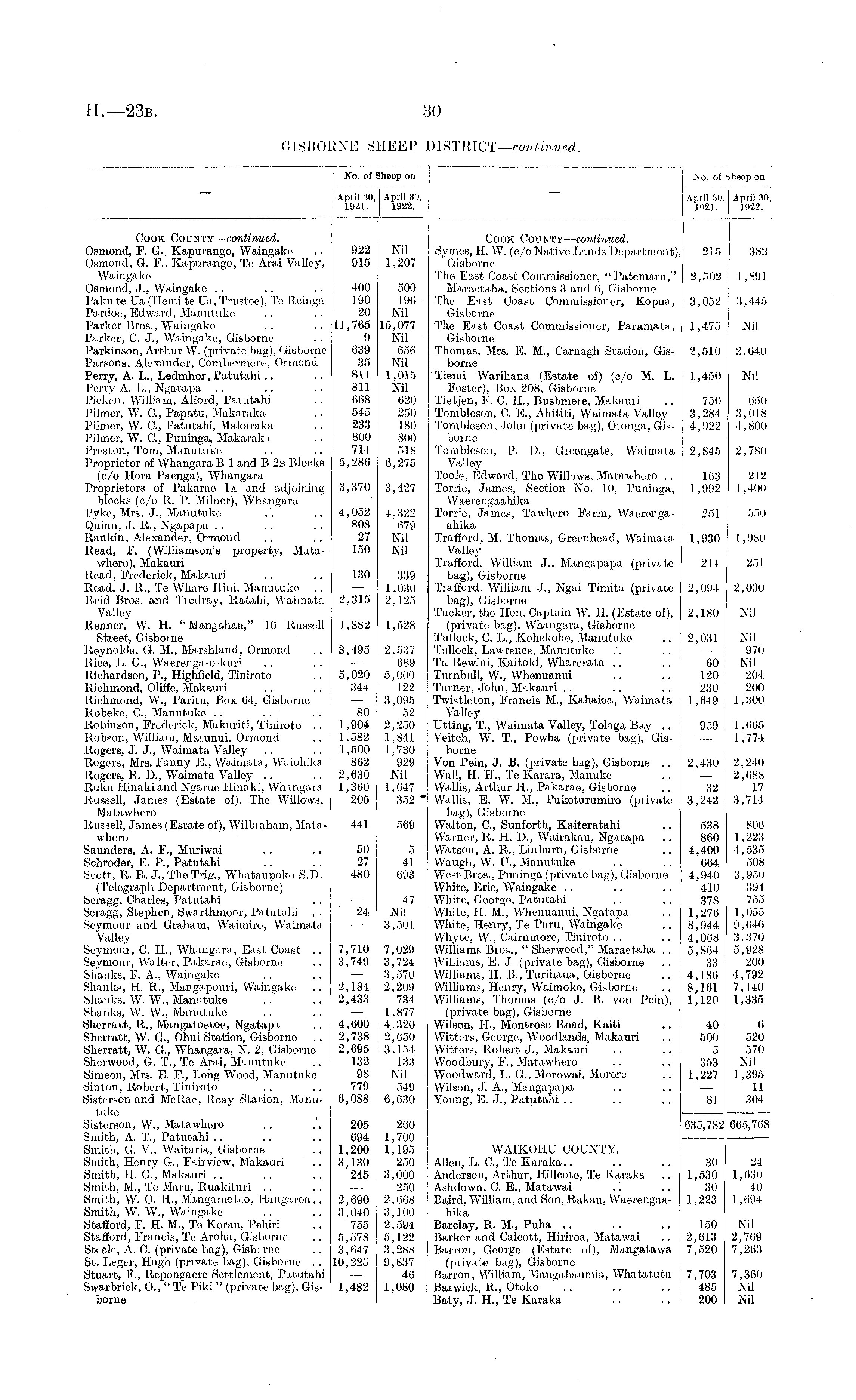 No. of Sheep on April 30, I April 30, 1921. 1922. No. of Sheep on April 30,1 April 30, 1921. 1922. Cook County— continued. Osmond, F. G, Kapurango, Waingake Osmond, G. P., Kapurango, Te Arai Valley, Waingake Osmond, J., Waingake Baku te Ua (Hemi te Ua, Trustee), Te Reinga Pardoo, Edward, Manutuke Parker Bros., Waingake Parker, C. J., Waingake, Gisborne Parkinson, Arthur W. (private bag), Gisborno Parsons, Alexander, Combermere, Ormond Perry, A. L., Ledmhor, Patutahi Perry A. L., Ngatapa Pickcii, William, Alford, Patutahi Pilmer, W. ft, Papatu, Makaraka Pilmer, W. ft, Patutahi, Makaraka Pilmer, W. ft, Puninga, Makarak i Preston, Tom, Manutuke Proprietor of Whangara B 1 and B 2n Blocks (o/o Hora Paenga), Whangara Proprietors of Pakarao Ia and adjoining blocks (c/o R. P. Milncr), Whangara Pyke, Mrs. J., Manutuke Quinn. J. R., Ngapapa Rankin, Alexander, Ormond ltoad, F. (Williamson's property, Matawhero), Makauri Read, Frederick, Makauri Read, J. R., Te Whare Hini, Manutuke Reid Bros, and Trodray, Ratahi, Waimata Valley Renner, W. H. "Mangahau," 16 Russell Street, Gisborne Reynolds, G. M., Marshland, Ormond Riee, L. G, Waerenga-o-kuri Richardson, P., Highlield, Tiniroto Richmond, Oliffe, Makauri Richmond, W., Paritu, Box 64, Gisborne Robeke, ft, Manutuke Robinson, Frederick, Makuriti, Tiniroto . . Robson, William, Maiunui, Ormond Rogers, J. J., Waimata Valley Rogers, Mrs. Fanny E., Waimata, Waiohika Rogers, It. D., Waimata Valley Riiku Hinakiand Ngaruc Hinaki, Whangara Russell, James (Estate of), The Willows, Matawhero Russell, James (Estate of), Wilbraham, Matawhero Saunders, A. F., Muriwai Schroder, E. P., Patutahi Scott, R. R. J., The Trig., Whataupoko S.D. (Telegraph Department, Gisborne) Scragg, Charles, Patutahi Scragg, Stephen, Swarthmoor, Patutahi , , Seymour and Graham, Waimiro, Waimata Valloy Seymour, C. H., Whangara, East Coast . . Seymour, Walter, Pakarae, Gisborne Shanks, P. A., Waingake Shanks, H. R., Mangapouri, Waingake Shanks, W. W., Manutuke Shanks, W. W., Manutuke Sherratt, It., Mangatoetoe, Ngatapa Sherratt, W. G, Ohui Station, Gisborne Sherratt, W. G., Whangara, N. 2, Gisborno Sherwood, G. T., Te Arai, Manutuke Simeon, Mrs. E. F., Long Wood, Manutuke Sinton, Robert, Tiniroto Sisterson and Mcltac, Hcay Station, Manutuke Sisterson, W., Matawhcro Smith, A. T., Patutahi Smith, G. V., Waitaria, Gisborne Smith, Henry G, Fairview, Makauri Smith, FL G.', Makauri Smith, M., To Mara, Ruakituri Smith, W. 0. IL, Mangamotco, Hangaroa.. Smith, W. W., Waingake Stafford, F. H. M., Te Korau, Pehiri Stafford, F'rancis, 'Te Aroha, Gisborne Steele, A. C. (private bag), Gisb. me St. Leger, Hugh (private bag), Gisborno .. Stuart, FT, Repongaere Settlement, Patutahi Swarbrick, O., " Te Piki " (private, bag), Gisborne 922 915 400 190 20 11,705 9 639 35 811 811 668 545 233 800 714 5,280 3,370 4,052 808 27 150 130 2,315 1,882 3,495 5,020 344 Nil 1,207 500 196 Nil 1.5,077 Nil 656 Nil 1,015 Nil 620 250 180 800 518 6,275 3,427 4,322 079 Nil Nil 339 1,030 2,125 1,528 2,537 689 5,000 122 3,095 52 2,250 1,841 1,730 929 Nil 1,647 352 • Cook County— continued. Symes, IT. W. (e/o Native Lands Department), 215 I 382 Gisborne The East Coast Commissioner, "Patemaru," 2,502 I 1,891 Maraetaha, Sections 3 and 6, Gisborne Tho East Coast Commissioner, Kopua, 3,052 3,445 Gis borne Tho East Coast Commissioner, Paramata, 1,475 ! Nil Gisborne Thomas, Mrs. E. M., Carnagh Station, Gis- 2,510 I 2,640 borne Tiemi Warihana (Estate of) (c/o M. L. 1,450 Nil Foster), Box 208, Gisborne Tietjen, P. C. H., Bushmeie, Makauri .. 750 650 Tombleson, C. E., Ahititi, Waimata Valley 3,284 3,018 Tombleson, John (private bag), Otonga, Gis- 4,922 4,800 borne Tombleson, P. .IX, Giecngate, Waimata 2,845 2,780 Valley Toole, Edward, The Willows, Matawhcro .. 103 212 Torrie, James, Section No. 10, Puninga, 1,992 1,400 Waerengaahika Torrie, Jamos, Tawhoro Farm, Waerenga- 251 550 ahika Trafford, M. Thomas, Creenhead, Waimata 1,930 1,980 Valley Trafford, William J., Mangapapa (private 214 251 bag), Gisborne Trafford. William J., Ngai Timita (private 2,094 2,030 bag), Gisborne Tucker, tho Hon. Captain W. H. (Estate of), 2,180 Nil (private bag), Whangara, Gisborno Tullock, C. L., Kohekohe, Manutuke .. 2,031 Nil Tullock, Lawrence, Manutuke .'. . . — ! 970 Tu Rewini, Kaitoki, Wharerata .. .. 60 Nil Turnbull, W., Whenuanui .. .. 120 204 Turner, John, Makauri .. .. .. 230 200 Twistleton, Francis M., Kahaioa, Waimata 1,049 1,300 Valloy Utting, T., Waimata Valley, Tolaga Bay .. 959 1,665 Veitch, W. T., Powha (privato bag), Gis- — 1,774 borne Von Pein, J. B. (private bag), Gisborne .. 2,430 2,240 Wall, H. 11,, Te Karara, Manuke .. — 2,088 Wallis, Arthur IL, Pakarae, Gisborne .. 32 17 Wallis, E. W. M„ Puketurumiro (private 3,242 3,714 bag), Gisborne Walton, ft, Sunforth, Kaiteratahi .. 538 806 Warner, R. H. D., Wairakau, Ngatapa .. 860 1,223 Watson, A. R., Linburn, Gisborne .. 4,400 4,535 Waugh, W. U., Manutuke .. . . 664 508 West Bros., Puninga (private bag), Gisborne 4,940 3,950 White, Eric, Waingake .. .. .. 410 391 White, George, Patutahi. .. .. 378 755 White, IT. M., Whenuanui. Ngatapa .. 1,276 1,055 White, Henry, To Puru, Waingake .. 8,944 9,646 Whyte, W., Cairnmorc, Tiniroto . . .. 4,068 3,370 Williams Bros., " Sherwood," Maraetaha .. 5,864 5,928 Williams, E. J. (private bag), Gisborne .. 33 200 Williams, H. B., Turihaua, Gisborne .. 4,186 4,792 Williams, Henry, Waimoko, Gisborne .. 8,161 7,140 Williams, Thomas (o/o J. B. von Pein), 1,120 1,335 (private bag), Gisborno Wilson, IL, Montrose Road, Kaiti .. 40 6 Witters, George, Woodlands, Makauri .. 500 520 Witters, Robert J., Makauri .. .. 5 570 Woodbury, F'., Matawhero . . . . 353 Nil Woodward, L. G, Morowai, Morere .. 1,227 1,395 Wilson, J. A., Mangapapa .. .. — 11 Young, E. J., Patutahi .. .. .. 81 304 80 1,904 1,582 1,500 862 2,030 1,360 205 441 569 50 27 480 5 41 693 ' 24 47 Nil 3,501 7,710 3,749 2,184 2,433 4,600 2,738 2,695 132 98 779 6,088 7,029 3,724 3,570 2,209 734 1,877 4.,