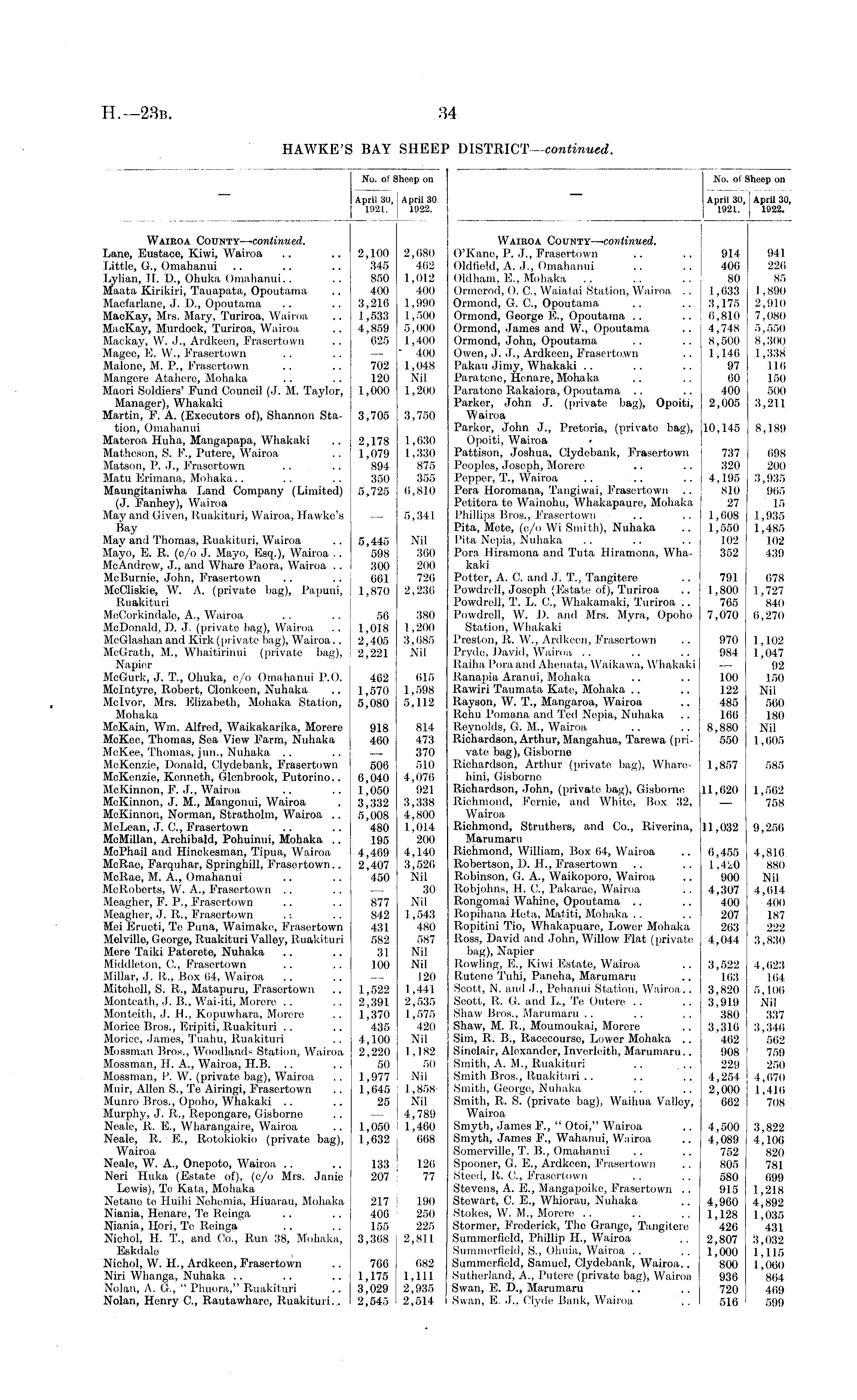 No. of S April 30, 1921. Iheop on April 30, 1922. No. of Sheep on April 30, April 30, 1921. 1922. Wairoa County— continued. Lane, Eustace, Kiwi, Wairoa Little, G, Omahanui Lylian, II. D., Ohuka Omahanui.. Maata Kirikiri, Tauapata, Opoutama Macfarlane, J. D., Opoutama MacKay, Mrs. Mary, Turiroa, Wairoa MacKay, Murdock, Turiroa, Wairoa Mackay, W. J., Ardkeen, Frasertown Magec, E. W., Frasertown Malonc, M. P., Frasertown Mangere Atahere, Mxihaka Maori Soldiers' F'und Council (J. M. Taylor, Manager), Whakaki Martin, FT, A. (Executors of), Shannon Station, Omahanui Materoa Huha, Mangapapa, Whakaki Matheson, S. F., Putere, Wairoa Matson, P. J., F'rasertown Matu Erimana, Mohaka Maungitaniwha Land Company (Limited) (J. Fanhey), Wairoa May and Given, Ruakituri, Wairoa, Hawke's Bay May and Thomas, Ruakituri, Wairoa Mayo, E. It. (c/o J. Mayo, Esq.), Wairoa . . McAndrow, J., and Whare Paora, Wairoa .. McBurnie, John, F'rasertown McCliskie, W. A. (privato bag), Papuni, Ruakituri McCorkindalo, A., Wairoa McDonald, D. J. (private bag), Wairoa McGlashan and Kirk (private bag), Wairoa.. McGrath, M., Whaitirinui (private bag), Napier McGurk, J. T., Ohuka, c/o Omahanui P.O. Mclntyre, Robert, Clonkoon, Nuhaka Mclvor, Mrs. Elizabeth, Mohaka Station, Mohaka McKain, Win. Alfred, Waikakarika, Morere McKee, Thomas, Sea View F'arm, Nuhaka McKee, Thomas, jun., Nuhaka McKenzie, Donald, Clydebank, Frasertown McKcn/.ie, Kenneth, Glenbrook, Putorino.. McKinnon, F. J., Wairoa McKinnon, J. M., Mangonui, Wairoa McKinnon, Norman, Stratholm, Wairoa .. McLean, J. ft, Frasertown McMillan, Archibald, Pohuinui, Mohaka .. MoPhail and Hinekosman, Tipua, Wairoa McRae, Farquhar, Springhill, Frasertown.. McRae, M. A., Omahanui MoRoberts, W. A., Frasertown Meagher, P. P., F'rasertown. Meagher, J. R., F'rasertown Mei Eruoti, To Puna, Waimako, Frasertown Melvillo, Georgo, Ruakituri Valley, Ruakituri More Taiki Paterete, Nuhaka Middleton, ft, Frasertown Millar, J. It., Box 64, Wairoa Mitchell, S. It., Matapuru, Frasertown Monteath, J. B., Wai-iti, Morore Monteith, J. H., Kopuwhara, Morere Morice Bros., Eripiti, Ruakituri Morice, James, Tuahu, Ruakituri Mossman Bros., Woodlands Station, Wairoa Mossman, II. A., Wairoa, H.B. Mossman, P. W. (private bag), Wairoa, Muir, Allen S., Te Airingi, Frasertown Munro Bros., Opoho, Whakaki .. Murphy, J. R., Repongare, Gisborne Neale, R. E., Wharangaire, Wairoa Neale, R. E., Rotokiokio (privato bag), Wairoa Neale, W. A., Onepoto, Wairoa Neri Huka (Estate of), (c/o Mrs. Janie Lewis), To Kata, Mohaka Netano te Iluihi Nehemia, Hiuarau, Mohaka Niania, Henare, Te Reinga Niania, Hori, Te Reinga Niehol, H. T., and Co., Run 38, Mohaka, Eskdale Niehol, W. H., Ardkeen, Frasertown Niri Whanga, Nuhaka Nolan, A. G., " Phuora," Ruakituri Nolan, Henry ft, Rautawhare, Ruakituri... 2,100 345 850 400 3,210 1,533 4,859 625 702 120 1,000 3,705 2,178 1,079 894 350 5,725 5,445 598 300 061 1,870 56 1,0.18 2,405 2,221 462 1,570 5,080 918 460 506 6,040 1,050 3,332 5,008 480 195 4,469 2,407 450 2,680 462 1,012 400 1,990 1,500 5,000 1,400 - 400 1,048 Nil 1,200 3,750 1,630 1,330 875 355 6,810 5,341 Nil 360 200 726 2,236 380 1,200 3,685 Nil 615 1,598 5,112 814 473 370 510 4,076 921 3,338 4,800 1,01.4 200 4,140 3,526 Nil 30 Nil 1,543 480 587 Nil Nil 120 1,441 2,535 1,575 420 Nil 1,182 50 Nil 1,858 Nil I 4,789 1,460 668 Wairoa County— con tinned. O'Kane, P. J., Frasertown Oldfield, A. J., Omahanui Oldham, E., Mohaka Ormcrod, 0. ft, Waiatai Station, Wairoa . . Ormond, G. ft, Opoutama Ormond, Goorge FT, Opoutama Ormond, James and W., Opoutama Ormond, John, Opoutama Owen, J. J., Ardkeen, Frasertown Pakau Jimy, Whakaki Para tone, Henare, Mohaka Paratene Rakaiora, Opoutama Parker, John J. (private bag), Opoiti, Wairoa Parker, John J., Pretoria, (private bag), Opoiti, Wairoa < Pattison, Joshua, Clydebank, F'rasertown Peoples, Joseph, Morere Pepper, T., Wairoa Pera Horomana, Tangiwai, Frasertown Petitora te Wainohu, Whakapaure, Mohaka Phillips Bros., F'rasertown Pita, Mote, (e/o Wi Smith), Nuhaka Pita Nepia, Nuhaka Pora Hiramona and Tuta Hiramona, Whakaki Potter, A. C. and J. T., Tangitere Powdrell, Josoph (Estate of), Turiroa Powdrell, T. L. ft, Whakamaki, Turiroa .. Powdrell, W. D. and Mrs. Myra, Opoho Station, Whakaki Preston, R. W., Ardkeen, F'rasertown Pryde, David, Wairoa .. Raiha Pora and Ahenata, Waikawa, Whakaki Ranapia Aran ui, Mohaka Rawiri Taumata Kate, Mohaka Rayson, W. T., Mangaroa, Wairoa Rchu Pomana and Ted Nepia, Nuhaka Reynolds, G. M., Wairoa Richardson, Arthur, Mangahua, Tarewa (private bag), Gisborne Richardson, Arthur (private bag), Wharehini, Gisborne Richardson, John, (privato bag), Gisborne Richmond, Fernie, and White, Box 32, Wairoa Richmond, Struthers, and Co., Rivcrina, Marumaru Richmond, William, Box 64, Wairoa Robertson, D. IT., Frasertown Robinson, G. A., Waikoporo, Wairoa Robjohns, 11. ft, Pakarae, Wairoa Rongomai Wahine, Opoutama Ropihana Heta, Matiti, Mohaka Ropitini Tio, Whakapuare, Lower Mohaka Ross, David and John, Willow F'lat (private bag), Napier Rowling, E., Kiwi Estate, Wairoa Rutene 'Tuhi, Panoha, Marumaru Scott, N. and J., Pehanui Station, Wairoa.. Scott, R. G. and L., Te Outere Shaw Bros., Marumaru Shaw, M. R., Moumoukai, Morore Sim, R. B., Racecourse, Lower Mohaka .. Sinclair, Alexander, Inverlcith, Marumaru.. Smith, A. M., Ruakituri Smith Bros., Ruakituri Smith, Georgo, Nuhaka Smith, R. S. (private bag), Waihua Valloy, Wairoa Smyth, James F., " Otoi," Wairoa Smyth, James F., Wahanui, Wairoa Somerville, T. B., Omahanui Spooner, G. E., Ardkeen, F'rasertown Steed, It. ft, Frasertown Stevens, A. E., Mangapoike, Frasertown . . Stewart, C. E., Whiorau, Nuhaka Stokes, W. M., Morere Stormer, F'rederick, Tho Grange, Tangitere Summorficld, Phillip H., Wairoa Suminorfield, S., Ohuia, Wairoa .. Summorficld, Samuel, Clydebank, Wairoa.. Sutherland, A., Putere (privato bag), Wairoa Swan, E. D., Marumaru Swan, E. J„ Clyde Bank, Wairoa 914 406 80 1,633 3,175 6,810 4,748 8,500 1,140 97 60 400 2,005 10,145