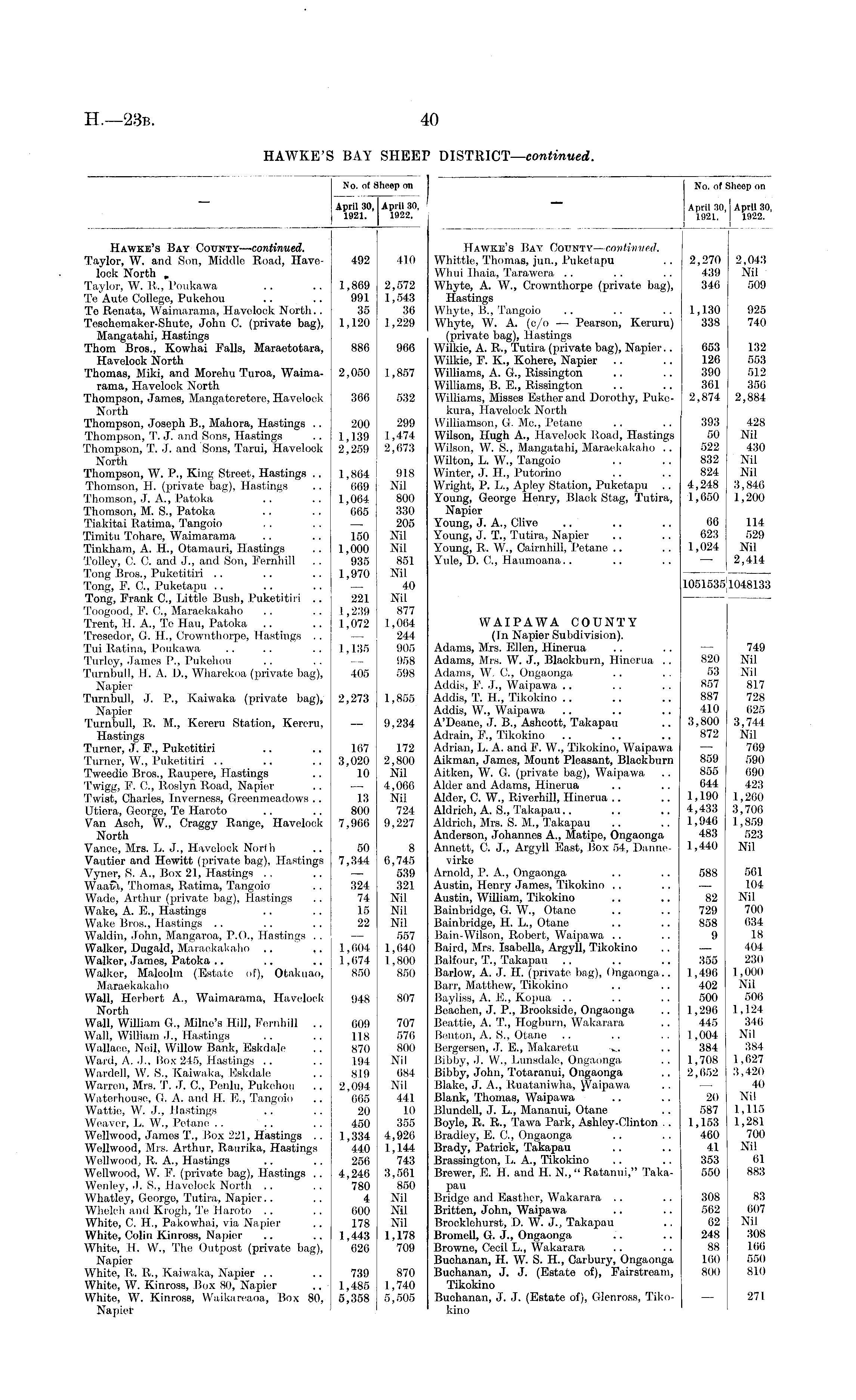 No. of Sheep on April 30, April 30, 1921. 1922. No. of Sheep on April 30,1 April 30, 1921. I 1922. I Hawke's Bay County— continued. Taylor, W. and Son, Middle Bioad, Haveloek North , Taylor, W. It., Poukawa Te Aute College, Pukehou To Renata, Waimarama, Haveloek North.. Tesehemaker-Shute, John C. (private bag), Mangatahi, Hastings Thom Bros., Kowhai Falls, Maraototara, Havolook North Thomas, Miki, and Morehu Turoa, Waimarama, Haveloek North Thompson, Jamos, Mangateretere, Haveloek North Thompson, Joseph B., Mahora, Hastings .. Thompson, T. J. and Sons, Hastings Thompson, T. J. and Sons, Tarui, Haveloek North Thompson, W. P., King Street, Hastings .. Thomson, H. (private bag), Hastings 'Thomson, J. A., Patoka Thomson, M. S., Patoka Tiakitai Ratima, Tangoio Timitu Tohare, Waimarama Tinkham, A. H., Otamauri, "Hastings Tolley, C. ft and J., and Son, Fernhill Tong Bros., Puketitiri Tong, F. ft, Puketapu Tong, Frank ft, Littlo Bush, Puketitiri .. Toogood, F. ft, Maraekakaho Trent, H. A., To Hau, Patoka .. Tresedor, G. H., Crownthorpe, Hastings .. Tui Ratina, Poukawa Tiirley, James P., Pukehou Turnbull, H. A. IX, Wharekoa (private bag), Napier Turnbull, J. P., Kaiwaka (private bag), Napier Turnbull, It. M., Kereru Station, Kereru, Hastings Turner, J. F., Puketitiri Turner, W., Puketitiri .. Tweedie Bros., Raupero, Hastings T'wigg, F. ft, Roslyn Road, Napier Twist, Charles, Inverness, Greenmeadows .. Otiora, George, Te Haroto Van Asch, W., Craggy Range, Haveloek North Vance, Mrs. L. J., Haveloek North Vautior and Hewitt (private bag), Hastings Vyner, S. A., Box 21, Hastings . . Waal i, Thomas, Ratima, Tangoio Wade, Arthur (private bag), Hastings Wake, A. E., Hastings Wake Bros., Hastings WaJdin, John, Mangaroa, P.O., Hastings .. Walker, Dngald, Maraekakaho Walker, James, Patoka Walker, Malcolm (Estate of), Otakuao, Maraekakaho Wall, Herbert A., Waimarama, Haveloek North Wall, William G, Milne's Hill, Fernhill .. Wall, William J., Hastings Wallace, Neil, Willow Bank, Eskdale Ward, A. J., Box 245, Hastings Wardell, W. S., Kaiwaka, Eskdale Warren, Mrs. T. J. ft, Penlu, Pukehou Waterhouse, G. A. and IL IT, Tangoio Wattie, W. J., Hastings Weaver, L. W., Petane .. Wellwood, James 'P., Box 221, Hastings .. Wellwood, Mrs. Arthur, Raurika, Hastings Wellwood, R. A., Hastings Wellwood, W. P. (private bag), Hastings .. Wenley, J. S., Haveloek North Whatley, George, Tutira, Napier.. Whelch and Krogh, Te Haroto White, ft H., Pakowhai, via Napier White, Colin Kinross, Napier White, H. W., The Outpost (private bag), Napier White, It. R., Kaiwaka, Napier White, W. Kinross, Box 80, Napier White, W. Kinross, Waikareaoa, Box 80, Napier 492 1.869 991 35 1,120 886 2,050 366 200 1,139 2,259 410 2,572 1,543 36 1,229 966 1,857 532 299 1,474 2,673 Hawke's Bay County— continued. Whittle, Thomas, jun., Puketapu Whui Ihaia, Tarawcra Whyte, A. W., Crownthorpe (privato bag), Hastings Whyte, B., Tangoio Whyte, W. A. (c/o — Pearson, Keruru) (private bag), Hastings Wilkie, A. R., Tutira (private bag), Napier.. Wilkie, F. K., Kohere, Napier Williams, A. G, Rissington Williams, B. E., Rissington Williams, Misses Esther and Dorothy, Pukekura, Haveloek North Williamson, G. Ma, Petane Wilson, Hugh A., Haveloek Road, Hastings Wilson, W. S., Mangatahi, Maraekakaho .. Wilton, L. W„ Tangoio Winter, J. H., Putorino Wright, P. L., Aplcy Station, Puketapu Young, George Honry, Black Stag, Tutira, Napier Young, J. A., Clive Young, J. T., Tutira, Napier Young, It. W., Cairnhill, Petane Yule, IX ft, Haumoana.. 2,270 2,043 439 Nil - 346 509 2,270 439 346 1,130 338 1,130 925 338 740 653 126 390 361 2,874 653 132 126 553 390 51.2 361 356 2,874 2,884 393 50 522 832 824 4,248 1,650 393 428 50 Nil 522 430 832 Nil 824 Nil 4,248 3,846 1,650 1,200 1,864 669 1,064 665 150 1,000 935 1,970 918 Nil 800 330 205 Nil Nil 851 Nil 40 Nil 877 1,064 244 905 958 598 66 623 1,024 66 114 623 529 1,024 Nil 2,414 1051535[l048133 221 1,239 1,072 1051535 1,135 405 2,273 167 3,020 10 13 800 7,966 50 7,344 324 74 15 22 1,604 1,674 850 1,855 9,234 172 2,800 Nil 4,066 Nil 724 9,227 8 6,745 539 321 Nil Nil Nil 557 1,640 1,800 850 WAIPAWA COUNTY (In Napier Subdivision). Adams, Mrs. Ellen, Hinerua Adams, Mrs. W. J., Blackburn, Hinerua .. Adams, W. ft, Ongaonga Addis, F. J., Waipawa Addis, T. H., Tikokino Addis, W., Waipawa A'Deane, J. B., Ashoott, Takapau A drain, P., Tikokino Adrian, L. A. and F. W., Tikokino, Waipawa Aikman, James, Mount Pleasant, Blackburn Aitken, W. G. (privato bag), Waipawa Alder and Adams, Hinerua Alder, C. W., Riverhill, Hinerua Aldrich, A. S., Takapau Aldrich, Mrs. S. M., Takapau Anderson, Johannes A., Matipe, Ongaonga Annett, C. J., Argyll East, Box 54, Dannevirke Arnold, P. A., Ongaonga Austin, Henry James, Tikokino Austin, William, Tikokino Bainbridge, G. W., Otane Bainbridge, H. L., Otane Bain-Wilson, Robert, Waipawa Baird, Mrs. Isabella, Argyll, Tikokino Balfour, T., Takapau Barlow, A. J. H. (private bag), Ongaonga.. Barr, Matthew, Tikokino Bayliss, A. E., Kopua Beaehen, J. P., Brookside, Ongaonga Beattie, A. T., Hogburn, Wakarara Benton, A. S,, Otane Bergersen, J. E., Makaretu Bibby, J. W., Lunsdalc, Ongaonga Bibby, John, Totaranui, Ongaonga Blake, J. A., Ruataniwha, Waipawa Blank, Thomas, Waipawa Blundell, J. L., Mananui, Otane Boylo, R. R., Tawa Park, Ashley-Clinton .. Bradley, E. ft, Ongaonga Brady, Patrick, Takapau Brassington, L. A., Tikokino Brewer, E. H. and IL N.," Ratanui," Takapau Bridge and Easthcr, Wakarara Britten, John, Waipawa Brocklehurst, D. W. J., Takapau Bromoll, G. J., Ongaonga Browne, Cecil L., Wakarara Buchanan, H. W. S. H., Carbury, Ongaonga Buchanan, J. J. (Estate of), Fairstream, Tikokino Buchanan, J. J. (Estate of), Glenross, Tikokino 749 820 Nil 53 Nil 857 817 887 728 410 625 3,800 3,744 872 Nil — 769 859 590 855 690 644 423 1,190 1,260 4,433 3,706 1,946 1,859 483 523 1,440 Nil 588 561 — 104 82 Nil 729 700 858 634 9 18 404 355 230 1,496 1,000 402 Nil 500 506 1,296 1,124 445 346 1,004 Nil 384 384 1,708 1,627 2