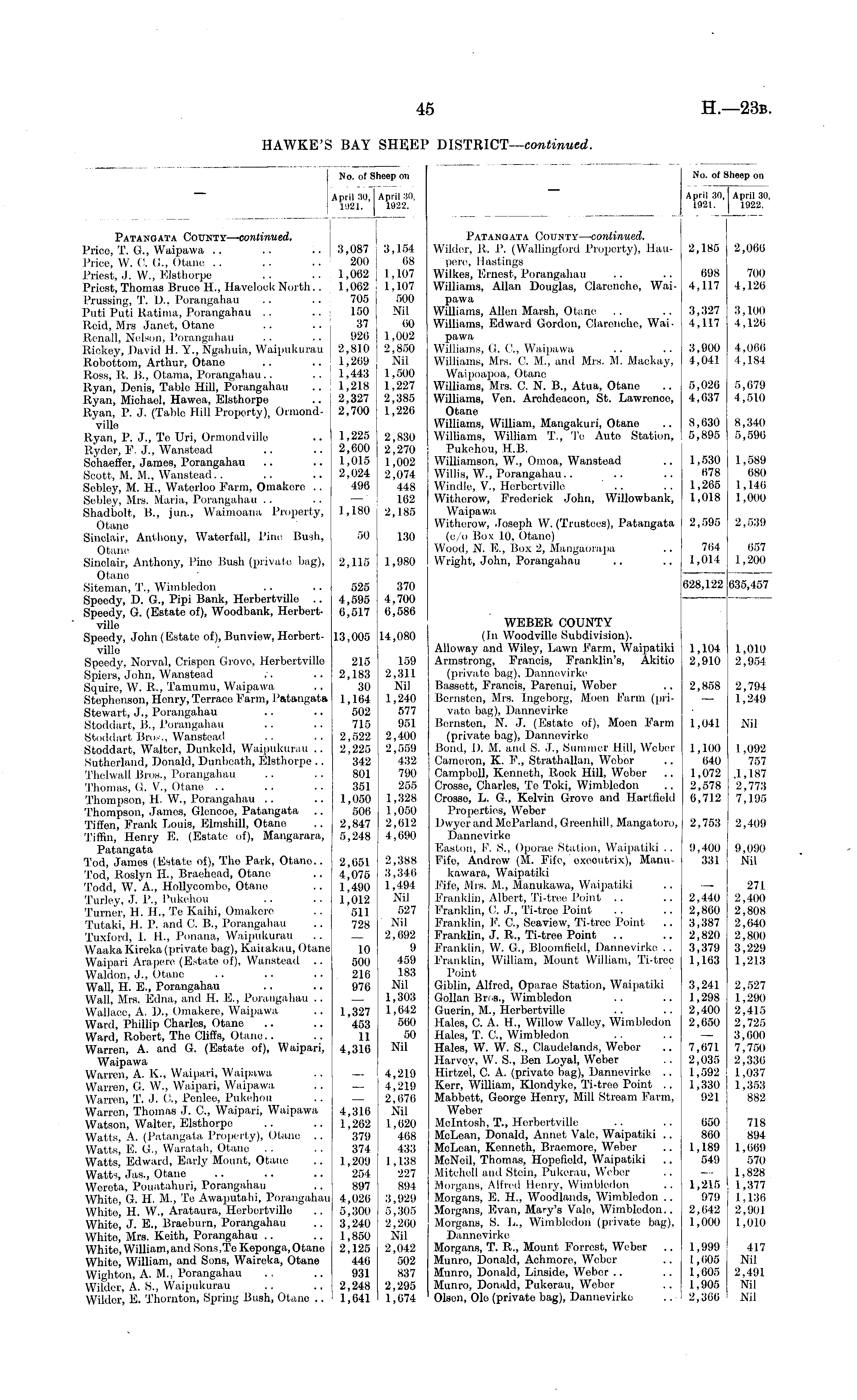 No. of Sheep on April 30, I April 30, 1921. 1922. No. of April 30, 1921. April 30 1922. Iheep on Patangata County— continued. Price, T. G, Waipawa .. .. .. 3,087 Price, W. 0. ft, Otano .. .. .. 200 Priest, J. W., Elsthorpe .. .. : 1,062 Priest, Thomas Bruce H., Haveloek North.. 1,062 Prussing, T. IX, Porangahau .. .. 705 Puti Puti Ratima, Porangahau .. .. 150 Reid, Mrs Janet, Otane .. .. 37 Renall, Nelson, Porangahau . . .. 926 ltickey, David H. Y., Ngahuia, Waipukurau 2,810 Robottom, Arthur, Otane .. .. 1,269 Ross, It. B., Otama, Porangahau.. .. 1,443 Ryan, Denis, Table Hill, Porangahau .. 1,218 Ryan, Michael, Hawea, Elsthorpe .. j 2,327 Ryan, P. J. (Table Hill Proporty), Ormond- 2,700 ville Ryan, P. J., Te Uri, Ormondville .. 1,225 Ryder, P, J., Wanstoad .. .. 2,600 Schaeffer, James, Porangahau .. .. 1,015 Scott, M. M., Wanstead.. .. .. 2,024 Sobley, M. H., Waterloo Farm, Omakoro .. 496 Sebley, Mrs. Maria, Porangahau .. .. —' Shadbolt, B., jun., Waimoana Property, 1,180 Otane Sinclair, Anthony, Waterfall, Pine Bush, 50 Otane Sinclair, Anthony, Pine Bush (private bag), 2,115 Otane Siteman,'!., Wimbledon .. .. 525 Speedy, D. G., Pipi Bank, Herbertvillo .. 4,595 Speedy, G. (Estate of), Woodbank, Herbert- 6,517 villo Speedy, John (Estate of), Bunview, Herbert- 13,005 ville Speedy, Norval, Crispen Grovo, Herbertvillo 215 Spiers, John, Wanstoad .•. .. 2,183 Squire, W. R., Tamumu, Waipawa .. 30 Stephenson, Henry, Terrace F'arm, Patangata 1,164 Stewart, J., Porangahau .. .. 502 Stoddart, B., Porangahau .. .. 715 Stoddart Bros., Wanstead .. .. 2,522 Stoddart, Walter, Dunkeld, Waipukurau .. 2,225 Sutherland, Donald, Dunboath, Elsthorpe .. 342 Thelwall Bros., Porangahau .. .. 801 Thomas, G. V., Otane .. .. .. 351 Thompson, H. W., Porangahau .. .. 1,050 Thompson, James, Glencoo, Patangata .. 506 Tiffen, Frank Louis, Elmshill, Otano .. 2,847 'Tiffin, Henry FT (Estate of), Mangarara, 5,248 Patangata Tod, James (Estate of), Tho Park, Otano.. 2,651 Tod, Roslyn II., Braehead, Otane .. 4,075 Todd, W. A., Hollycombo, Otano .. 1,490 Turkey, J. P., Pukehou .. .. 1,012 Turner, H. H., Te Kaihi, Omakere .. 511 Tutaki, H. P. and C. B., Porangahau .. 728 Tuxford, 1. li., Ponana, Waipukurau .. — WaakaKireka (private bag), Kairakau, Otane 10 Waipari Ara pere (Estate of), Wanstead .. 500 Waldon, J., Otano .. .. .. 216 Wall, H. E., Porangahau .. .. 976 Wall, Mrs. Edna, and H. IT, Porangahau .. — Wallace, A. IX, Omakere, Waipawa .. 1,327 Ward, Phillip Charles, Otane .. .. 453 Ward, Robert, Tho Cliffs, Otane.. .. 11 Warren, A. and G (Estate of), Waipari, 4,316 Waipawa Warren, A. K., Waipari, Waipawa .. — Warren, G. W., Waipari, Waipawa Warren, T. J. C., Penlee, Pukehou .. — Warren, Thomas J. ft, Waipari, Waipawa 4,316 Watson, Walter, Elsthorpe .. .. 1,262 Watts, A. (Patangata Property), Otane .. 379 Watts, E. G, Waratah, Otano .. .. 374 Watts, Edward, Early Mount, Otano .. 1,209 Watts, Jas., Otane .. .. .. 254 Wereta, Pouatahuri, Porangahau .. 897 White, G. H. M., Te Awaputahi, Porangahau 4,026 White, H. W., Arataura, Horbertville .. 5,300 White, J. E., Braeburn, Porangahau .. 3,240 White, Mrs. Keith, Porangahau .. .. 1,850 White, William, and Sons,Te Keponga, Otane 2,125 White, William, and Sons, Wairoka, Otane 440 Wighton, A. M., Porangahau ., .. 931 Wilder, A. S., Waipukurau .. .. 2,248 Wilder, E. Thornton, Spring Bush, Otane .. 1,641 3,154 08 1,107 1,107 500 Nil 60 1,002 2,850 Nil 1,500 1,227 2,385 1,220 Patangata County— continued. Wilder, It. P. (Wallingford Property), Hau- 2,185 pere, Hastings Wilkes, Ernest, Porangahau .. .. 698 Williams, Allan Douglas, Clarenehe, Wai- 4,117 pawa Williams, Allen Marsh, Otane .. .. 3,327 Williams, Edward Gordon, Clarenehe, Wai- 4,117 pawa Williams, G. ft, Waipawa .. .. 3,900 Williams, Mrs. C. M., and Mrs. M. Mackay, 4,041 Waipoapoa, Otane Williams, Mrs. C. N. B., Atua, Otane .. 5,026 Williams, Ven. Archdeacon, St. Lawrence, 4,637 Otane Williams, William, Mangakuri, Otane .. 8,630 Williams, William T., To Aute Station, 5,895 Pukehou, H.B. Williamson, W., Omoa, Wanstoad .. 1,530 Willis, W., Porangahau.. .. .. 678 Windio, V., Herbertvillc ' .. .. 1,265 Witherow, Frederick John, Willowbank, 1,018 Waipawa Witherow, Joseph W. (Trustees), Patangata 2,595 (c/o Box 10, Otane) Wood, N. E., Box 2, Mangaorapa .. 764 Wright, John, Porangahau .. .. 1,014 628,122 2,060 700 4,126 3,100 4,126 4,066 4,184 5,679 4,510 2,830 2,270 1,002 2,074 448 162 2,185 8,340 5,596 1,589 680 1,146 1,000 2,539 130 657 1,200 1,980 370 4,700 6,586 628,122 635,45' 14,080 159 2,311 Nil 1,240 577 951 2,400 2,559 432 790 255 1,328 1,050 2,612 4,690 2,388 3,346 1,494 Nil 527 Nil 2,692 9 459 183 Nil 1,303 1,642 560 50 Nil WEBER COUNTY (In Woodville Subdivision). Alloway and Wiley, Lawn F'arm, Waipatiki 1,104 Armstrong, Francis, Franklin's, Akitio 2,910 (private bag), Dannevirke Bassett, FVancis, Parenui, Wober .. 2,858 Bernsten, Mrs. Ingeborg, Moon F'arm (pri- — vate bag), Dannevirke Bornston,'N. J. (Estate of), Moen F'arm 1,041 (private bag), Dannevirko Bond, IX M. and S. J., Summer Hill, Weber 1,100 Camoron, K. F., Strathallan, Webor .. 640 Campbell, Kenneth, Rock Hill, Wober .. 1,072 Crosse, Charles, Te Toki, Wimbledon .. 2,578 Crosso, L. G., Kelvin Grovo and Harlfield 6,712 Properties, Weber Dwyer and MeParland, G reen hil I, Mangatoro, 2,753 Dannevirke Easton, F. S., Oporae Station, Waipatiki .. 9,400 Fife, Andrew (M. Fife, executrix), Manu- 331 kawara, Waipatiki Fife, Mrs. M., Manukawa, Waipatiki .. — Franklin, Albert, Ti-tree Point .. .. 2,440 Franklin, C. J., Ti-tree Point . . .. 2,860 Franklin, F. ft, Seaview, Ti-tree Point .. 3,387 Franklin, J. R., Ti-tree Point .. .. 2,820 Franklin, W. G, Bloomfield, Dannevirko .. 3,379 Franklin, William, Mount William, Ti-trco 1,163 Point Giblin, Alfred, Oparae Station, Waipatiki 3,241 Gollan Bros., Wimbledon .. .. 1,298 Guerin, M., Horbertville .. .. 2,400 Hales, C. A. H., Willow Valloy, Wimbledon 2,650 Hales, T. ft, Wimbledon Hales, W. W. S., Claudelan
