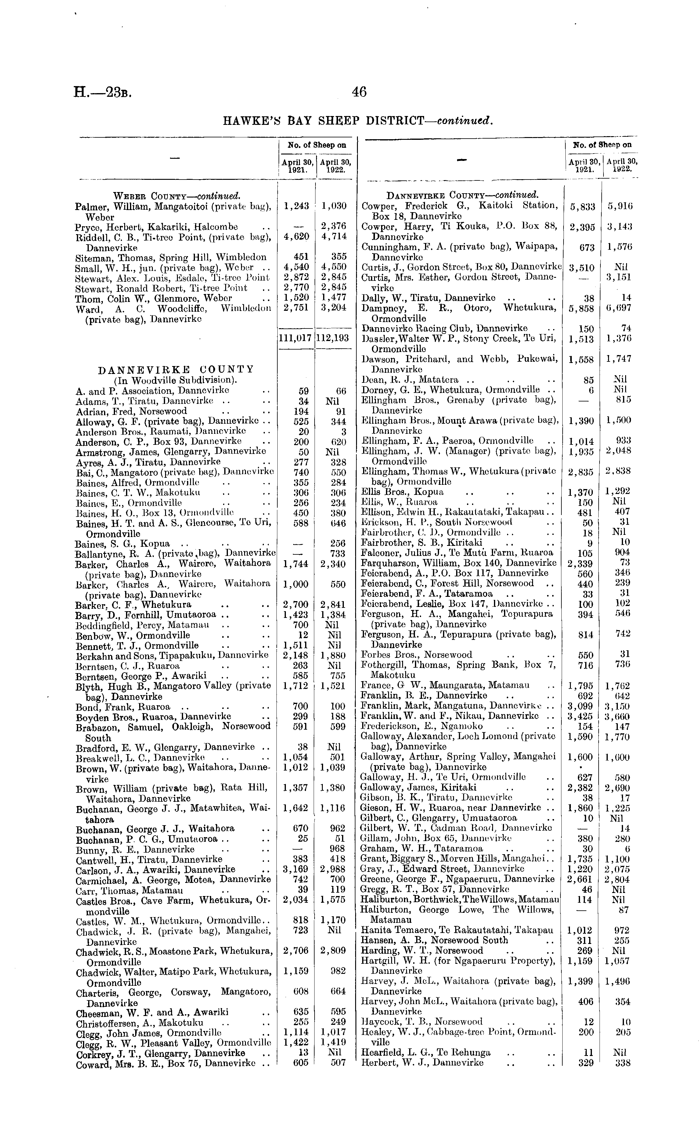 No. of April 30, 1921. Sheep on , April 30, 1922. No. of 8 April 30, 1921. Iheep on I April 30, 1922. Weber County— continued. Palmer, William, Mangatoitoi (private bag), Webor Pryco, Horbert, Kakariki, Halcombe Riddell, C. B., Ti-trco Point, (private bag), Dannevirke Siteman, Thomas, Spring Hill, Wimbledon Small, W. H., jun. (private bag), Weber .. Stewart, Alex. Louis, Esdale, Ti-tree Point Stewart, Ronald Robert, Ti-tree Point Thom, Colin W., Glenmore, Wober Ward, A. C. Woodcliffe, Wimbledon (private bag), Dannevirko DANNEVIRKE COUNTY (In Woodville Subdivision). A. and P. Association, Dannevirke Adams, T., Tiratu, Dannevirke Adrian, Fred, Norsewood Alloway, G. FT (private bag), Dannevirko .. Anderson Bros., Raumati, Dannevirko Anderson, C. P., Box 93, Dannevirke Armstrong, Jamos, Glengarry, Dannevirke Ayres, A. J., Tiratu, Dannevirke Bai, ft, Mangatoro (private bag), Dannevirke Baines, Alfred, Ormondville Baines, C. T. W., Makotuku Baines, E., Ormondville Baines, H. O., Box 13, Ormondvillo Baines, H. T. and A. S., Glencourse, Te Uri, Ormondvillo Baines, S. G., Kopua Ballantyne, R. A. (privato .bag), Dannevirke Barkor, Charles A., Wairero, Waitahora (private bag), Dannevirko Barkor, Charles A., Wairere, Waitahora (private bag), Dannevirke Barker, C. F-, Whetukura Barry, D., Fornhill, Umutaoroa Boddinglield, Percy, Matamau .. Benbow, W., Ormondville Bennett, T. J., Ormondville Borkahn and Sons, Tipapakuku, Dannevirke Berntsen, C. J., Ruaroa Borntsen, George P., Awariki Blyth, Hugh B., Mangatoro Valloy (private bag), Dannevirke Bond, Frank, Ruaroa Boyden Bros., Ruaroa, Dannevirke Brabazon, Samuel, Oakloigh, Norsewood South Bradford, E. W., Glengarry, Dannevirke .. Breakwell, L. ft, Dannevirke Brown, W. (private bag), Waitahora, Dannevirko Brown, William (private bag), Rata Hill, Waitahora, Dannevirke Buchanan, George J. J., Matawhitea, Waitahora Buchanan, George J. J., Waitahora Buchanan, P. C. G, Umutaoroa Bunny, R. E., Dannevirke Cantwell, H., Tiratu, Dannevirke Carlson, J. A., Awariki, Dannevirke Carmichael, A. George, Motoa, Dannevirke , Carr, Thomas, Matamau Castles Bros., Cave Farm, Whetukura, Ormondville Castles, W. M., Whetukura, Ormondville.. Chadwick, J. R. (private bag), Mangahei, Dannevirke Chadwick, R. S., Moastono Park, Whetukura, Ormondville Chadwick, Walter, Matipo Park, Whetukura, Ormondville Charteris, George, Corsway, Mangatoro, Dannevirke Cheesman, W. F. and A., Awariki Christofforsen, A., Makotuku Clogg, John James, Ormondville Clogg, R. W., Pleasant Valley, Ormondville Corkrey, J. T., Glengarry, Dannevirke Coward, Mrs. B. E., Box 75, Dannevirke .. 111,017 59 34 194 525 20 200 50 277 740 355 306 256 450 588 1,744 1,000 2,700 1,423 700 12 1,511 2,148 263 585 1,712 1,243 4,020 451 4,540 2,872 2,770 1,520 2,751 1112,193 1,030 2,376 4,714 355 4,550 2,845 2,845 1,477 3,204 66 Nil 91 344 3 620 Nil 328 550 284 306 234 380 646 256 733 2,340 550 2,841 1,384 Nil Nil Nil 1,880 Nil 755 1,521 Dannevirke County— continued. Cowper, Frederick G., Kaitoki Station, Box 18, Dannevirko Cowpor, Harry, Ti Kouka, P.O. Box 88, Dannevirke Cunningham, IT A. (privato bag), Waipapa, Dannevirko Curtis, J., Gordon Street, Box 80, Dannevirke Curtis, Mrs. Esther, Gordon Street, Dannevirko Dally, W., Tiratu, Dannevirko Dampnoy, E. R., Otoro, Whetukura, Ormondville Dannevirko Racing Club, Dannevirke Dassler,Walter W. P., Stony Creek, Te Uri, Ormondvillo Dawson, Pritchard, and Webb, Pukewai, Dannevirko Dean, It. J., Matatera Dornoy, G. E., Whetukura, Ormondvillo .. Ellingham Bros., Grenaby (private bag), Dannevirke Ellingham Bros., Mount Arawa (private bag), Dannevirke Ellingham, F. A., Paeroa, Ormondville Ellingham, J. W. (Managor) (private bag), Ormondvillo Ellingham, Thomas W., Whetukura (private bag), Ormondville Ellis Bros., Kopua Ellis, W., Ruaroa Ellison, Edwin II., Rakautataki, Takapau .. Eriekson, H. P., South Norsewood F'airbrofher, C. IX, Ormondville .. Fairbrothor, S. B., Kiritaki Falconer, Julius J., Te Mutii F'arm, Ruaroa F'arquharson, William, Box 140, Dannevirke Foiorabend, A., P.O. Box 117, Dannevirke Foiorabend, ft, F'orest Hill, Norsewood Fcierabond, I'. A., Tataramoa Foierabcnd, Leslie, Box 147, Dannevirke .. Ferguson, H. A., Mangahei, Tepurapura (private bag), Dannevirke Ferguson, H. A., Tepurapura (private bag), Dannevirke Forbes Bros., Norsewood Fothergill, Thomas, Spring Bank, Box 7, Makotuku France, G W., Maungarata, Matamau Franklin, B. E., Dannevirke Franklin, Mark, Mangatuna, Dannevirko .. Franklin, W. and F\, Nikau, Dannevirke .. Frederickson, E., Ngamoko Galloway, Alexander, Loch Lomond (private bag), Dannevirke Galloway, Arthur, Spring Valloy, Mangahei (private bag), Dannevirke Galloway, 11. J., Te Uri, Ormondville Galloway, James, Kiritaki Gibson, B. K., Tiratu, Dannevirke Gieson, H. W., Ruaroa, near Dannevirke .. Gilbert, ft, Glengarry, Umuataoroa Gilbert, W. T, Cadman Road, Dannevirke Gillam, John, Box 65, Dannevirko Graham, W. H., Tataramoa Grant, Biggary S.,Morven Hills, Mangahei. . Gray, J., Edward Street, Dannevirke Greene, Georgo F., Ngapacruru, Dannevirke Gregg, R. 'P., Box 57, Dannevirke Haliburton, Borthwick, The Willows, Matamau Haliburton, George Lowe, The Willows, Matamau Hanita Temaero, Te Rakautatahi, Takapau Hansen, A. B., Norsewood South Harding, W. T,, Norsewood Hartgill, W. H. (for Ngapaeruru Property), Dannevirke Harvey, J. McL., Waitahora (private bag), Dannevirke Harvey, John McL., Waitahora (private bag), Dannevirke Haycock, T. B., Norsewood Hoaloy, W. J., Cabbage-tree Point, Ormondvillo Hearfield, L. G., Te Rehunga Herbert, W. J., Dannevirke 5,833 2,395 673 3,510 38 5,858 150 1,513 1,558 85 6 1,390 1,014 1,935 2,835 1,370 150 481 50 18 9 105 2,339 560 440 33 100 394 814 5,916 3,143 1,576 Nil 3,1.51 14 6,697 74 1,376 1,747 Nil Nil 815 1,500 933 2,048 2,838 1,292 Nil 407 31 Nil 10 904 73 346 239 31 102 546 742 550 710 31 736 700 299 591 100 188 599 1,795 692 3,099 3,425 154 1,590 1,762 642 3,150 3,660 147 1,770 38 1,054 1,012 Nil 501 1,039 1,60