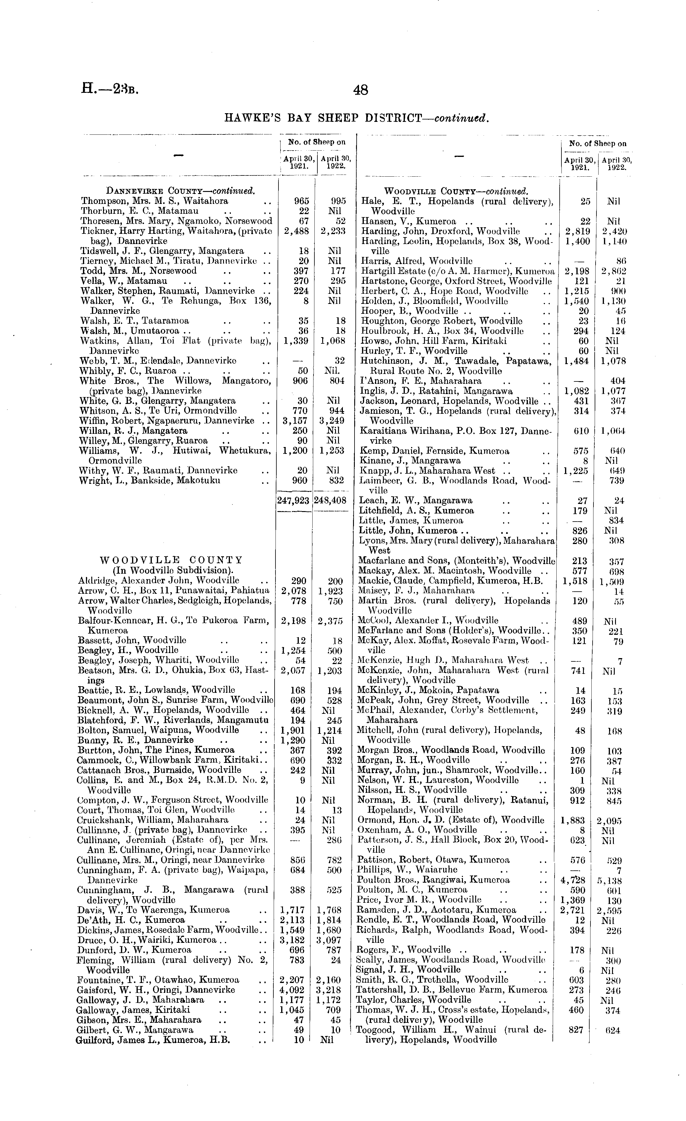 No. of Sheep on April 30, April 30, 1921. 1922. No. of Sheep on April 30, April 30, 1921. 1922. Dannevirke County— continued. Thompson, Mrs. M. S., Waitahora Thorburn, E. ft, Matamau Thoresen, Mrs. Mary, Ngamoko, Norsewood Tickner, Harry Harting, Waitahora, (privato bag), Dannevirke Tidswell, J. F., Glengarry, Mangatera Tierney, Michael M., Tiratu, Dannevirke .. Todd, Mrs. M., Norsewood Volla, W., Matamau Walker, Stephen, Raumati, Dannevirke .. Walker, W. G., Te Rehunga, Box 136, Dannevirke Walsh, FT T., Tataramoa Walsh, M., Umutaoroa Watkins, Allan, Toi Flat (private bag), Dannevirke Webb, T. M., Edendale, Dannevirko Whibly, F. ft, Ruaroa White Bros., The Willows, Mangatoro, (private bag), Dannevirke White, G. B., Glengarry, Mangatera Whitson, A. S., Te Uri, Ormondville Wiffin, Robert, Ngapaeruru, Dannevirke .. Willan, R. J., Mangatera Willoy, M., Glengarry, Ruaroa Williams, W. J., Hutiwai, Whetukura, Ormondville Withy, W. F., Raumati, Dannevirke Wright, L., Bankside, Makotuku 965 995 22 Nil 67 52 2,488 2,233 18 Nil 20 Nil 397 177 270 295 224 Nil 8 Nil 35 18 36 18 1,339 1,068 32 50 Nil. 906 804 Woodville County— continued. Hale, E. T., Hopolands (rural delivery), Woodville Hansen, V., Kumeroa Harding, John, Droxford, Woodville Harding, Leolin, Hopelands, Box 38, Woodville Harris, Alfred, Woodville Hartgill Estate (c/o A. M. Ilarmer), Kumeroa Hartstone, George, Oxford Street, Woodville Herbert, ft A., Hope Road, Woodvillo Holdcn, J'., Bloomfield, Woodville Hooper, B., Woodville Houghton, Goorge Robert, Woodvillo Houlbrook, H. A., Box 34, Woodville Howso, John, Hill Farm, Kiritaki Hurley, T. P., Woodville Hutchinson, J. M., Tawadalo, Papatawa, Rural Routo No. 2, Woodville I'Anson, P, IT, Maharahara Inglis, J. D., Ratahini, Mangarawa Jackson, Leonard, Hopelands, Woodville .. Jamieson, T. G, Hopelands (rural delivery), Woodville Karaitiana Wirihana, P.O. Box 127, Dannevirke Kemp, Daniel, F'ernside, Kumeroa Kinano, J., Mangarawa Knapp, J, L., Maharahara West Laimbeer, G. B., Woodlands Road, Woodville Leach, E. W., Mangarawa Litchfield, A. S., Kumeroa Little, James, Kumeroa Little, John, Kumeroa Lyons, Mrs. Mary (rural delivery), Maharahara 'West Macfarlane and Sons, (Monteith's), Woodville Mackay, Alex. M. Macintosh, Woodville .. Maekie, Claude, Campfield, Kumeroa, H.B. Maisey, F. J., Maharahara Martin Bros, (rural delivery), Hopelands Woodvillo MoCoo), Alexander I., Woodville McFarlane and Sons (Holder's), Woodvillo.. McKay, Alex. Moffat, Rosevalc Farm, Woodville McKenzie, Hugh D., Maharahara West .. McKenzie, John, Maharahara West (rural delivery), Woodvillo McKinloy, J., Mokoia, Papatawa McPeak, John, Grey Street, Woodville .. MoPhail-, Alexander, Corby's Settlement, Maharahara Mitchell, John (rural delivery), Hopelands, Woodvillo Morgan Bros., Woodlands Road, Woodvillo Morgan, R. IL, Woodville Murray, John, jun., Shamrock, Woodville.. Nelson, W. H., Laurcston, Woodvillo Nilsson, H. S., Woodville Norman, B. H. (rural delivery), Ratanui, Hopelands, Woodvillo Ormond, Hon. J. D. (Estate of), Woodville Oxenham, A. O., Woodville Patterson, J. S., Hall Block, Box 20, Woodville Pattison, Robert, Otawa, Kumeroa Phillips, W., Waiaruhe Poulton Bros., Rangiwai, Kumeroa Poulton, M. ft, Kumeroa Price, Ivor M. It., Woodville Ramsden, J. D., Aototaru, Kumoroa Rendle, E. T„ Woodlands Road, Woodville Richards, Ralph, Woodlands Road, Woodville Rogers, 1'., Woodville Seally, James, Woodlands Road, Woodville Signal, J. H., Woodville Smith, It. G., Trothella, Woodvillo Tattcrshall, D. B., Bellevue F'arm, Kumeroa Taylor, Charles, Woodville Thomas, W. J. II., Cross's estate, Hopolands, (rural deliveiy), Woodville Toogood, William H., Wainui (rural delivery), Hopolands, Woodville 25 Nil 22 Nil 2,819 2,420 1,400 1,140 — 86 2,198 2,862 121 21 1,215 90(1 1,540 1,130 20 45 23 16 294 124 60 Nil 60 Nil 1,484 1,078 30 Nil 770 944 3,157 3,249 250 Nil 90 Nil 1,200 1,253 — 404 1,082 1,077 431 367 314 374 610 1,064 20 Nil 960 832 575 640 8 Nil 1,225 649 - 739 247,923 248,408 27 24 179 Nil . — 834 826 Nil 280 308 WOODVILLE COUNTY (In Woodville Subdivision). Aldridge, Alexander John, Woodville Arrow, C. H., Box 11, Punawaitai, Pahiatua Arrow, Walter Charles, Sedgloigh, Hopolands, Woodvillo Balfour-Kenncar, H. G, Te Pukoroa Farm, Kumeroa Bassett, John, Woodvillo Beagley, H., Woodville Boagley, Joseph, Whariti, Woodville Beatson, Mrs. G. IX, Ohukia, Box 03, Hastings Boattie, It. FT, Lowlands, Woodvillo Beaumont, John S., Sunrise Farm, Woodvillo Bicknell, A. W., Hopelands, Woodville .. Blatchford, F. W., Riverlands, Mangamutu Bolton, Samuel, Waipuna, Woodville Bunny, R. li., Dannevirke Burtton, John, The Pines, Kumeroa Cammook, ft, Willowbank Farm, Kiritaki.. Cattanach Bros., Burnside, Woodville Collins, E. and M., Box 24, R.M.IX No. 2, Woodvillo Compton, J. W., Ferguson Street, Woodville Court, Thomas, Toi Glen, Woodville Cruickshank, William, Maharahara Cullinane, J. (private bag), Dannevirke Cullinane, Jeremiah (Estate of), per Mrs. Ann E. Cullinane, Oringi, near Dannevirko Cullinane, Mrs. M., Oringi, near Dannevirke Cunningham, F. A. (private bag), Waipapa, Dannevirke Cunningham, J. B., Mangarawa (rural delivery), Woodville Davis, W., To Waerenga, Kumeroa De'Ath, H. ft, Kumeroa Dickins, Jamos, Rosedale Farm, Woodville.. Druco, O. IL, Wairiki, Kumeroa Dunford, D. W., Kumeroa F'leming, William (rural delivery) No. 2, Woodville Fountaino, T. FT, Otawhao, Kumeroa Gaisford, W. H., Oringi, Dannevirke Galloway, J. D., Maharahara Galloway, Jamos, Kiritaki Gibson, Mrs. E., Maharahara Gilbert, G. W., Mangarawa Guilford, James L., Kumeroa, H.B. 290 2,078 778 2,198 12 1,254 54 2,057 168 690 464 194 1,901 1,290 367 690 242 9 200 1,923 750 2,375 18 500 22 1,203 194 528 Nil 245 1,214 Nil 392 332 Nil Nil 213 357 577 698 1,518 1,509 14 120 55 489 Nil 350 221 121 79 7 741 Nil 14 15 163 153 249 319 48 168 109 103 276 387 160 54 1 Nil 309 338 912 845 10 14 24 395 Nil 13 Nil Nil 280 1,883 2,095 8 Nil 023 Nil 856 684 782 500 576 529 
