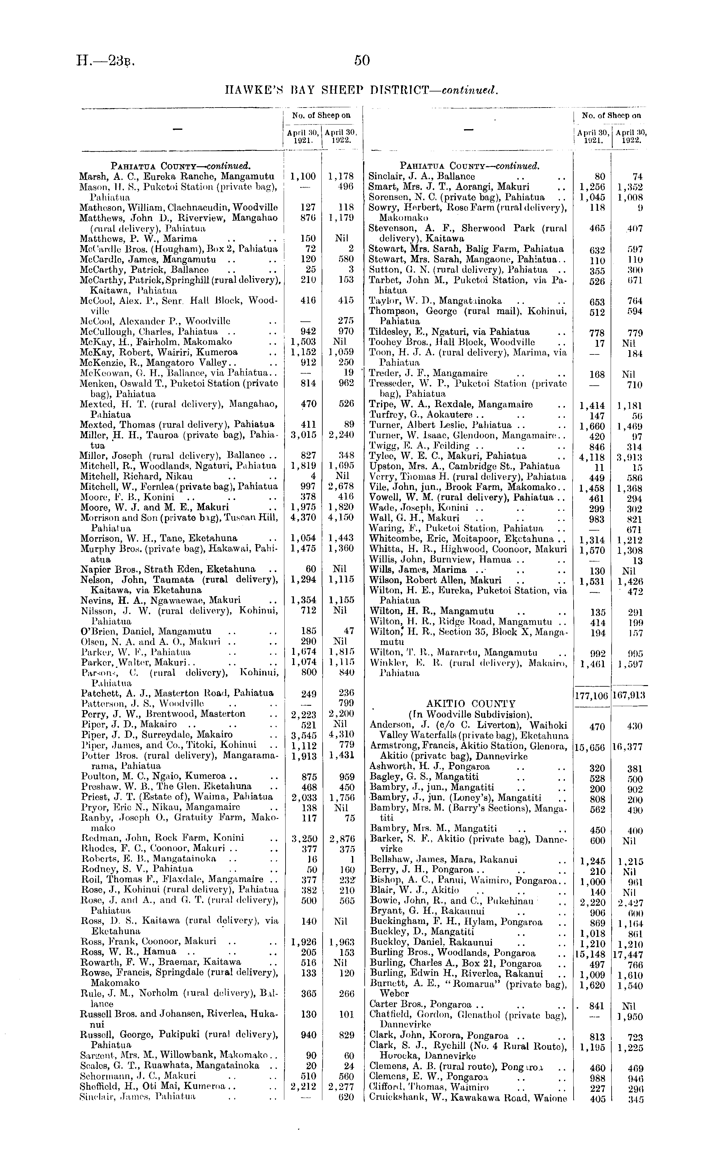 No. of Sheep on April 30,1 April 30, 1921. 1922. No. of Sheep on April 30, 1922. April 30 1921. Pahiatua County— continued. Marsh, A. ft, Eureka Rancho, Mangamutu Mason, II. S., Puketoi Station (privato bag), Pahiatua Matheson, William, Clachnaeudin, Woodvillo Matthews, John D., Riverview, Mangahao (rural delivery), Pahiatua Matthews, P. W., Marima McCardle Bros. (Hougham), Box 2, Pahiatua McCardlo, Jamos, Mangamutu McCarthy, Patrick, Ballanco McCarthy, Patrick, Springhill (rural delivery), Kaitawa, Pahiatua McCool, Alex. P., Senr Hall Block, Woodville MeCool, Alexander P., Woodville McCullough, Charles, Pahiatua McKay, 11., Fairholm, Makomako McKay, Robert, Wairiri, Kumeroa McKenzie, It., Mangatoro Valley McKoowan, G. FL, Ballance, via Pahiatua.. Menken, Oswald T., Puketoi Station (privato bag), Pahiatua Mexted, H. T. (rural delivery), Mangahao, Pahiatua Mexted, Thomas (rural delivery), Pahiatua Miller, H. IL, Tauroa (privato bag), Pahiatua Miller, Joseph (rural delivery), Ballance .. Mitchell, R., Woodlands, Ngaturi, Pahiatua Mitchell, Richard, Nikau Mitchell, W., F'crnlea(private bag), Pahiatua Moore, F. B., Konini Moore, W. J. and M. E., Makuri Morrison and Son (private big),Tuscan Hill, Pahiatua Morrison, W. H., Tane, Eketahuna Murphy Bros, (private bag), Hakawai, Pahiatua Napier Bros., Strath Eden, Eketahuna Nelson, John, Taumata (rural delivery), Kaitawa, via Eketahuna Nevins, H. A., Ngawaewae, Makuri Nilsson, J, W. (rural delivery), Kohinui, Pahiatua O'Brien, Daniel, Mangamutu Olsen, N. A. and A. O., Makuri Parker, W. i'., Pahiatua Parker,_Walter, Makuri.. Parsons, C. (rural delivery), Kohinui, Pahiatua Patchett, A. J., Masterton Road, Pahiatua Patterson, J. S., Woodville Perry, J. W., Brentwood, Masterton Piper, J. P., Makairo Pipor, J. D., Surreydale, Makairo Piper, Jamos, and Co., 'Titoki, Kohinui Potter Bros, (rural delivery), Mangatamarama, Pahiatua Poulton, M. ft, Ng.iio, Kumeroa Preshaw. W. B., The Glen. Eketahuna Priest, J. T. (Estate of), Waiuia, Pahiatua Pryor, Eric N., Nikau, Mangamaire Itanby, Joseph O., Gratuity F'arm, Makomako Rodman, John, Rock Farm, Konini Rhodes, F. ft, Coonoor, Makuri Roberts, E. B., Mangatainoka Rodney, S. V., Pahiatua Roil, Thomas F., F'iaxdale, Mangamaire .. itose, J., Kohinui (rural delivery), Pahiatua Rose, J. and A., and G. T. (rural delivery), Pahiatua Ross, D. S.. Kaitawa (rural delivery), via Eketahuna Ross, Frank, Coonoor, Makuri Ross, W. It., Hamua Rowarth, F. W., Braemar, Kaitawa Rowse, Francis, Springdalo (rural delivery), Makomako Rule, J. M., Norholm (rural delivery), Ballanoe Russell Bros, and Johansen, Riverlea, Hukanui Russell, George, Pukipuki (rural delivery), Pahiatua Sargent, Mrs. M., Willowbank, Makomako .. Scales, G. T., Ruawhata, Mangatainoka .. Schormann, J. ft, Makuri Sheffield, FL, Oti Mai, Kumeroa Sinclair, James. Pahiatua 1,100 127 876 150 72 120 25 210 416 942 1,503 1,152 912 814 470 411 3,015 827 1,819 4 997 378 1,975 4,370 1,054 1,475 60 1,294 1,354 712 185 290 1,674 1,074 800 1,178 496 118 1,179 Nil 2 580 3 153 415 275 970 Nil 1,059 250 19 962 526 89 2,240 348 1,695 Nil 2,678 416 1,820 4,150 1,443 1,360 Nil 1,115 1,155 Nil 47 Nil 1,815 1,115 840 Pahiatua County— continued. Sinclair, J. A., Ballance Smart, Mrs. J. T., Aorangi, Makuri Soronsen, N. C. (privato bag), Pahiatua Sowry, Herbert, Rose Farm (rural delivery), Makomako Stevenson, A. P., Shorwood Park (rural delivery), Kaitawa Stewart, Mrs. Sarah, Balig Farm, Pahiatua Stewart, Mrs. Sarah, Mangaone, Pahiatua.. Sutton, G. N. (rural delivery), Pahiatua .. Tarbet, John M., Puketoi Station, via Pahiatua Taylor, W. P., Mangattinoka Thompson, Georgo (rural mail), Kohinui, Pahiatua Tildcsley, E., Ngaturi, via Pahiatua Toohey Bros., Hall Block, Woodvillo Toon, H. J. A. (rural delivery), Marima, via Pahiatua Treder, J. P., Mangamaire Tresseder, W. P., Puketoi Station (private bag), Pahiatua Tripe, W. A., Rexdale, Mangamaire Turfroy, G., Aokautere Turner, Albert Leslie, Pahiatua Turner, W. Isaac, Glcndoon, Mangamaire.. Twigg, FT A., Feilding Tylee, W. E. ft, Makuri, Pahiatua Upston, Mrs. A., Cambridgo St., Pahiatua Verry, Thomas H. (rural delivery), Pahiatua Vile, John, jun., Brook F'arm, Makomako.. Vowell, W. M. (rural delivery), Pahiatua .. Wade, Joseph, Konini Wall, G. IT., Makuri Waring, F.', Puketoi Station, Pahiatua Whiteombc, Eric, Meitapoor, Eketahuna .. Whitta, II. It., Highwood, Coonoor, Makuri Willis, John, Burnview, Hamua Wills, James, Marima Wilson, Robert Allen, Makuri Wilton, H. E., Eureka, Puketoi Station, via Pahiatua Wilton, H. R., Mangamutu Wilton, H. It., Ridge Road, Mangamutu .. Wilton,' H. R., Section 35, Block X, Mangamutu Wilton, T. It., Mararetu, Mangamutu Winkler, E. It. (rural delivery), Makairo, Pahiatua 80 1,256 1,045 118 465 632 110 355 526 653 512 778 17 168 1,414 147 1,660 420 846 4,118 11 449 1,458 461 299 983 1,314 1,570 130 1,531 135 414 194 74 1,352 1,008 9 ,407 597 110 300 071 764 594 779 Nil 184 Nil 710 1,181 56 1 ,469 97 .'111 3,913 15 5S6 1,368 294 302 821 671 1,212 1,308 13 Nil 1,426 472 291 199 157 992 1,461 995 1,597 249 236 799 2,200 Nil 4,310 779 1,431 AKITIO COUNTY (In Woodville Subdivision). Anderson, J. (o/o C. Livorton), Waihoki Valley Waterfalls (privato bag), Eketahuna Armstrong, I'rancis, Akitio Station, Glenora, Akitio (private bag), Dannevirke Ashworth, 11, J., Pongaroa Bagley, G. S., Mangatiti Bambry, J., jun., Mangatiti Bambry, J., jun. (Lonoy's), Mangatiti Bambry, Mrs. M. (Barry's Sections), Mangatiti Bambry, Mrs. M., Mangatiti Barker, S. F'., Akitio (privato bag), Dannevirke Bellshaw, James, Mara, Rakanui Berry, J. IL, Pongaroa Bishop, A. ft, Panui, Waimiro, Pongaroa.. Blair, W. J., Akitio Bowie, John, R., and ft, Pukehinau Bryant, G. FL, Rakaunui Buckingham, F. H., Hylam, Pongaroa Buckley, D., Mangatiti Buckley, Daniel, Rakaunui Burling Bros., Woodlands, Pongaroa Burling, Charles A., Box 21, Pongaroa Burling, Edwin H., Riverlea, Rakanui Burnett, A. E., "Romania" (private bag), Webor Carter Bros., Pongaroa C