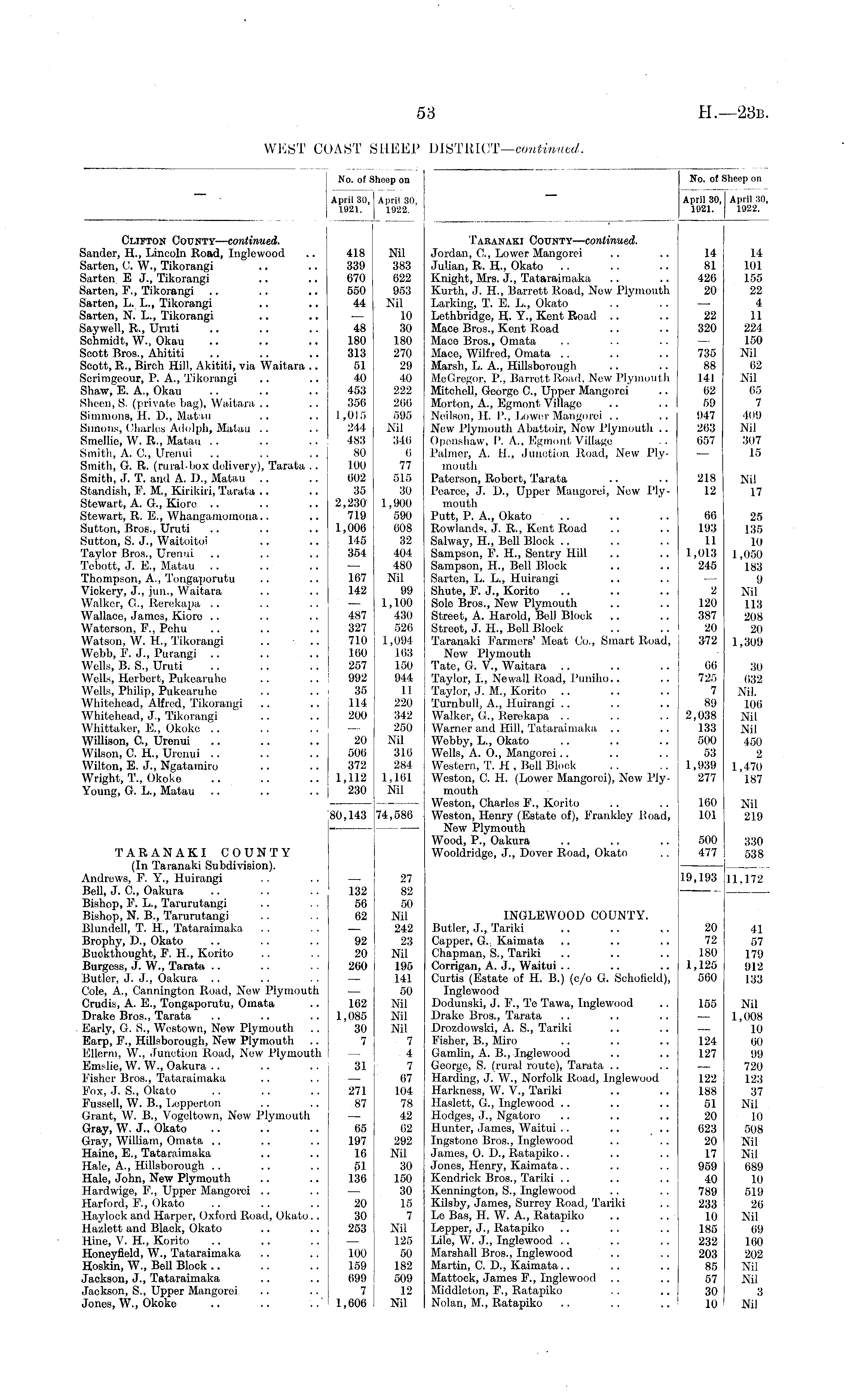 No. of Sheep on April 30, April 30, 1921. 1922. No. of Sheep on April 30, April 30, 1921. 1922. Clifton County— continued. Sander, H., Lincoln Road, Inglewood Sarten, C. W., Tikorangi Sarten. E J., Tikorangi Sarton, F'., Tikorangi Sarten, L. L., Tikorangi Sarten, N. L., Tikorangi Say well, R., Uruti Schmidt, W., Okau Scott Bros., Ahititi Scott, R., Birch Hill, Akititi, via Waitara .. Scrimgcour, P. A., Tikorangi Shaw, E. A., Okau Sheen, S. (private bag), Waitara Simmons, H. IX, Matau Simons, Charles Adolph, Matau Smellie, W. R., Matau Smith, A. ft, Urenui Smith, G. R. (rural-box delivery), Tarata .. Smith, J. T. and A. D., Matau Standish, F. M., Kirikiri, Tarata Stewart, A. G., Kiore Stewart, R. FT, Whangamomona.. Sutton, Bros., Uruti Sutton, S. J., Waitoitoi Taylor Bros., Urenui Tebott, J. E., Matau Thompson, A., Tongaporutu Vickery, J., jun., Waitara Walker, G, Rerekapa Wallace, James, Kioro Waterson, F'., Pehu Watson, W. H., Tikorangi Webb, F. J., Purangi Wells, B. S., Uruti Wells, Herbert, Pukearuhe Wells, Philip, Pukearuhe Whitehead, Alfred, Tikorangi Whitehead, J., Tikorangi Whittakcr, li., Okoke Willison, ft, Urenui Wilson, C. H., Uronui Wilton, E. J., Ngatamiro Wright, T., Okoke Young, G. L., Matau 418 Nil 339 383 670 622 550 953 44 Nil — 10 48 30 180 180 313 270 51 29 40 40 453 222 356 266 1,015 595 244 Nil 483 346 80 6 100 77 602 515 35 30 2,230 1,900 719 590 1,006 608 145 32 354 404 480 167 Nil 142 99 — 1,100 487 430 327 520 710 1,094 160 163 257 150 992 944 35 11 114 220 200 342 — 250 20 Nil 506 316 372 284 1,112 1,161 230 Nil Taranaki County— continued. Jordan, ft, Lower Mangorei Julian, R. H-, Okato Knight, Mrs. J., Tataraimaka Kurth, J. H., Barrett Road, Now Plymouth Larking, T. E. L., Okato Lethbridge, H. Y., Kent Road Mace Bros., Kent Road Maco Bros., Omata Mace, Wilfred, Omata Marsh, L. A., Hillsborough McGregor, P., Barrett Road, Now Plymouth Mitchell, George ft, Upper Mangorei Morton, A., Egmont Village Neilson, H. P., Lower Mangorei New Plymouth Abattoir, Now Plymouth .. Opcnshaw, P. A., Egmont Village Palmer, A. IL, Junction Road, New Plymouth Paterson, Robert, Tarata Pearce, J. D., Upper Mangorei, New Plymouth Putt, P. A., Okato Rowlands, J. R., Kent Road Sal way, H., Bell Block Sampson, F. H., Sentry Hill Sampson, H., Bell Block Sarten, L. L., Huirangi Shute, F. J., Korito Sole Bros., New Plymouth Street, A. Harold, Boll Block Streot, J. FL, Bell Block Taranaki Farmers' Meat Co., Smart ltoad, New Plymouth Tate, G. V., Waitara Taylor, I., Newall ltoad, Puniho.. Taylor, J. M., Korito Turnbull, A., Huirangi Walker, C, Rerekapa Warner and Hill, 'Tataraimaka Webby, L., Okato Wells, A. O., Mangorei Western, T. H , Boll Block Weston, C. H. (Lower Mangorci), Now Plymouth Weston, Charles F., Korito Weston, Henry (Estate of), F'rankloy Road, Now Plymouth Wood, P., Oakura Wooldridge, J., Dover Road, Okato 14 81 426 20 22 320 735 88 141 02 59 947 263 657 218 12 66 193 11 1,013 245 14 101 155 22 4 11 224 150 Nil 62 Nil 65 7 409 Nil 307 15 Nil 17 25 135 10 1,050 183 9 Nil 113 208 20 1,309 2 120 387 20 372 06 725 7 89 2,038 133 500 53 1,939 277 30 632 Nil. 106 Nil Nil 450 2 1,470 1.87 80,143 74,586 100 101 Nil 219 TARANAKI COUNTY (In Taranaki Subdivision). Andrews, F. Y., Huirangi Bell, J. ft, Oakura Bishop, F. L., Tarurutangi Bishop, N. B., Tarurutangi Blundell, T. H., Tataraimaka Brophy, IX, Okato Buckthought, F. H., Korito Burgess, J. W., Tarata Butler, J. J., Oakura Cole, A., Cannington Road, Now Plymouth Orudis, A. E., Tongaporutu, Omata Drake Bros., Tarata Early, G. S., Westown, New Plymouth Earp, F., Hillsborough, New Plymouth .. Ellerm, W., Junction Road, New Plymouth Emslie, W. W., Oakura Fisher Bros., Tataraimaka F'ox, J. S., Okato Fussed, W. B., Lepperton Grant, W. B., Vogeltown, Now Plymouth Gray, W. J., Okato Gray, William, Omata Haino, E., Tataraimaka Hale, A., Hillsborough Hale, John, New Plymouth Hardwige, F., Upper Mangorci Harford, P., Okato Haylock and Harper, Oxford Boad, Okato.. Hazlett and Black, Okato Hine, V. H., Korito Honeyfield, W., Tataraimaka Hoskin, W., Bell Block Jackson, J., Tataraimaka Jackson, S., Upper Mangorci Jones, W., Okoke — 27 132 82 56 50 62 Nil 242 92 23 20 Nil 260 195 — 141 50 162 Nil 1,085 Nil 30 Nil 7 7 — 4 31 7 67 271 104 87 78 — 42 65 62 197 292 16 Nil 51 30 136 150 — 30 20 15 30 7 253 Nil 125 100 50 159 182 699 I 509 7 j 12 1,606 I Nil 132 56 62 92 20 260 162 1,085 30 7 31 INGLEWOOD COUNTY. Butler, J., Tariki Capper, G. ; Kaimata Chapman, S., Tariki Corrigan, A. J., Waitui Curtis (Estate of H. B.) (c/o G. Schofield), Inglewood Dodunski, J. F'., Te Tawa, Inglewood Drake Bros., Tarata Drozdowski, A. S., Tariki Fisher, B., Miro Gamlin, A. B., Inglewood George, S. (rural route), Tarata Harding, J. W., Norfolk ltoad, Inglewood Harkness, W. V., Tariki Haslett, G., Inglewood Hodges, J., Ngatoro Hunter, James, Waitui .. .. Ingstone Bros., Inglewood James, 0. D., Ratapiko.. Jones, Henry, Kaimata Kendrick Bros., Tariki Kennington, S., Inglewood Kilsby, James, Surrey Road, Tariki Le Bas, H. W. A., Ratapiko Lepper, J., Ratapiko Lile, W. J., Inglewood Marshall Bros., Inglewood Martin, C. D., Kaimata. . Mattock, James F'., Inglewood Middleton, F., Ratapiko Nolan, M., Ratapiko 500 477 19,193 20 72 180 1,125 560 155 124 127 122 188 51 20 623 20 17 959 40 789 233 10 185 232 203 85 57 30 10 330 538 11,172 41 57 179 912 133 Nil 1,008 10 00 99 720 123 37 Nil . 10 508 Nil Nil 689 10 519 26 Nil 69 160 202 Nil Nil 3 Nil 271 87 65 197 16 51 136 20 30 253 100 159 699 7 1,606